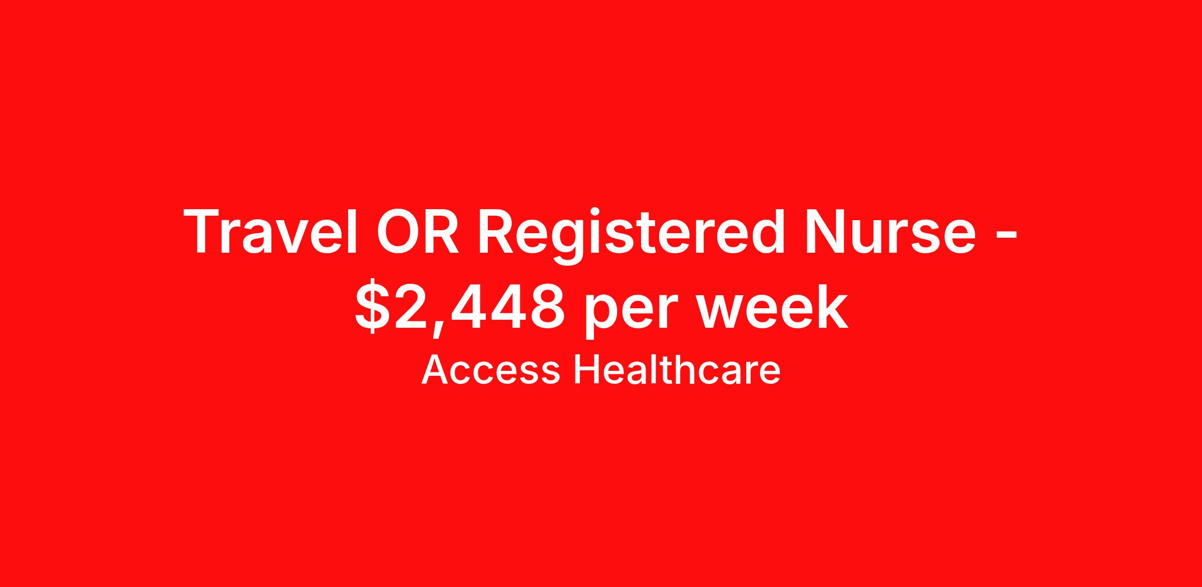 Access Healthcare is seeking a travel nurse RN OR - Operating Room for a travel nursing job in Weston, West Virginia. Job Description & Requirements Specialty: OR - Operating Room Discipline: RN Start Date: ASAP Duration: 13 weeks 40 hours per week Shift: 8 hours, days Employment Type: Travel Access Healthcare Job ID 75695874. Pay package is based on 8 hour shifts and 40 hours per week (subject to confirmation) with tax-free stipend amount to be determined. About Access Healthcare Access Healthcare aims to provide superior service to our nursing family by providing around the clock support, competitive pay packages and an unmatched benefits package! Unlike other agencies, we offer a true family feel and work with you to find the placement that is right for you. We offer one of the top leading pay packages in the industry and we are ready to get you the money you deserve! Access Healthcare was founded by two travel nurses, Danielle and Diego, who had a dream and a shared vision of creating an agency which all nurses would want to work with. Our passion has led us to where we are today as one of the top 10 agencies in our home state of New Jersey, with access to contracts in all 50 states! We encourage you to join our team and we cannot wait to get to know you!