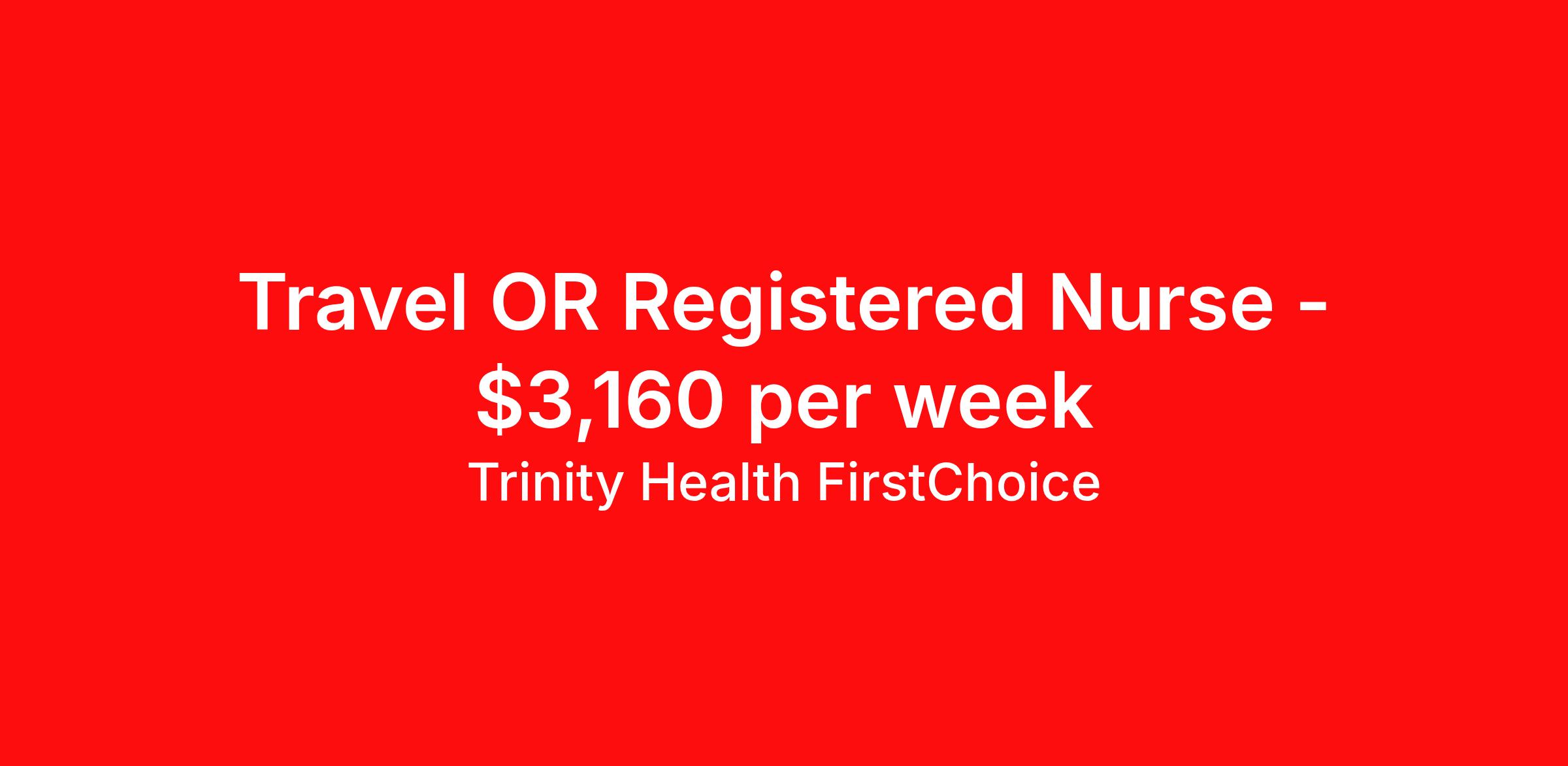 Trinity Health FirstChoice is seeking a travel nurse RN OR - Operating Room for a travel nursing job in Hartford, Connecticut. Job Description & Requirements Specialty: OR - Operating Room Discipline: RN Start Date: ASAP Duration: 13 weeks 40 hours per week Shift: 10 hours, days Employment Type: Travel Employment Type: Part time Shift: Description: Are you an experienced Registered Nurse looking for premium compensation and maximum flexibility? Explore FirstChoice – Trinity Health's mobile staffing solution! FirstChoice RNs are utilized to fill short and long-term assignments throughout the health system, and we need you to be a part of this innovative program! Nationwide and Regional opportunities available! What you will do: Qualified and willing to float throughout the hospital and/or throughout multiple hospital locations and/or regions Knows, understands, incorporates & demonstrates standard elements of professional practice: Assess, Outcomes Identification / Solutions, Plan, Implement, Evaluate Acts independently & appropriately within license, scope of knowledge & experience in practice area Retains accountability for delegation, choices, decisions & outcomes Collaborates with key stakeholders & contributes to quality & improvement practices & outcomes Exhibits agility & willingness to take on new & additional responsibilities Embraces new ideas & cultural differences while managing competing priorities Minimum Qualifications: Graduation from an accredited school of nursing. Valid RN licensure authorized in the applicable state(s) of practice/employment. Minimum of eighteen (18) months of recent clinical experience for Med Surg, Tele and PCU. Minimum two (2) years of recent clinical experience for all remaining specialties including Critical Care, Surgical Services, Maternal Services, Emergency Department and Behavioral Health. Required to have and maintain the credentials required per their specialty area (ex: ACLS, TNCC, etc). BLS, ACLS and PALS must be obtained through American Heart Association Position Highlights and Benefits: Premium Pay Flexible Scheduling Travel and Per Diem opportunities available Variety of Practice Settings Learning Opportunities DailyPay available Reimbursement of License and Certifications available per assignment Opportunity to participate in 403B program Ministry Information: FirstChoice offers rewarding Nursing, Respiratory Therapist, Surgical Technologist, and Health Care Professional travel positions with a flexible schedule to fit your life. FirstChoice travel Health Care Professionals fill critical positions when unforeseen or unplanned circumstances occur; or, when there is a position open due to an extended leave-of-absence. You’ll get to experience a variety of practice settings while traveling within your local region or traveling nationally – your choice! If applicable-enter in state specific pay transparency information. Job Details: Location: St. Francis Hospital, Hartford, CT Start Date: Flexible Weeks: 13 Hours: 4x10 Shift: day Gross Weekly Rate: $3160.00 Our Commitment Rooted in our Mission and Core Values, we honor the dignity of every person and recognize the unique perspectives, experiences, and talents each colleague brings. By finding common ground and embracing our differences, we grow stronger together and deliver more compassionate, person-centered care. We are an Equal Opportunity Employer. All qualified applicants will receive consideration for employment without regard to race, color, religion, sex, sexual orientation, gender identity, national origin, disability, veteran status, or any other status protected by federal, state, or local law. Trinity Health FirstChoice Job ID 00651788. Pay package is based on 10 hour shifts and 40 hours per week (subject to confirmation) with tax-free stipend amount to be determined. Posted job title: Travel Registered Nurse, RN, OR About Trinity Health FirstChoice Premium pay FirstChoice offers a rewarding career with significant p remium pay and flexible scheduling to fit your life. FirstChoice h ealthcare travel professionals fill critical positions when unforeseen or unplanned circumstances occur; or, when there is a position open due to an extended leave-of-absence. You’ll get to experience a variety of practice settings while traveling within your local region or traveling nationally – your choice! Healthcare travel professionals, join us in caring for our community, we can't do it without you. FirstChoice exclusively supports facilities within the Trinity Health system meaning you will have a consistent experience between job sites. Your training at one site will apply to other sites within the region and will minimize the time you are spending outside of patient care. We understand that there has been a fundamental shift in the nursing position in recent years and like any other employee, nurses want more options and flexibility in their careers. FirstChoice provides you with both along with the comfort and security of one employer. Benefits of Being a FirstChoice healthcare travel professional: Premium pay Choose your own travel adventure—work in a variety of practice settings Wide range of assignments available Housing and meal stipend Minimum Qualifications/Requirements of a FirstChoice Nurse: Registered nurse with a license in the state(s) you will work Minimum of 2 years, depending on specialty area Cannot hold a concurrent position at a Trinity Health facility Trinity Health is a leading not-for-profit Catholic health system with 92 hospitals and hundreds of primary, specialty and continuing care centers across the United States. Benefits Employee assistance programs 403b retirement plan Discount program