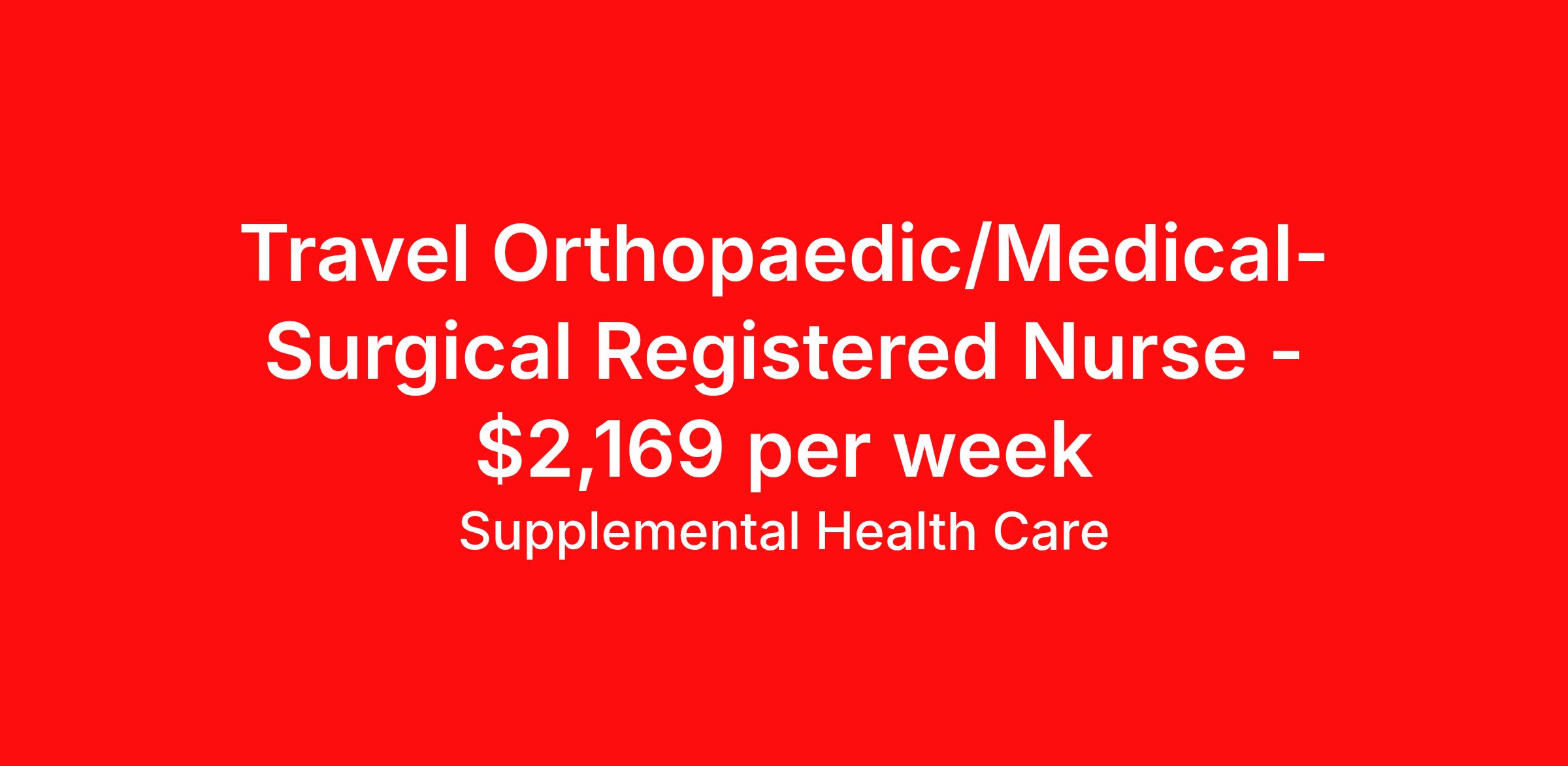 Supplemental Health Care is seeking a travel nurse RN Orthopedics Med Surg for a travel nursing job in Iowa City, Iowa. Job Description & Requirements Specialty: Orthopedics Discipline: RN Start Date: ASAP Duration: 13 weeks 36 hours per week Shift: 12 hours, days Employment Type: Travel Job Description: Supplemental Health Care is connecting Orthopaedic, Med Surg Registered Nurses with top-tier hospital contracts in Iowa City, Iowa. Travel or stay local, either way, we’ll guide you to an opportunity that matches your goals, offering excellent pay, benefits, and support. Qualifications: Current Iowa Registered Nurse License / Certification American Heart Association BLS 1 to 2 years of recent Orthopaedic, Med Surg experience Orthopaedic, Med Surg Registered Nurse Contract Details: $2,005 - $2,169 per week* Weekly pay 13-week full-time contract with possibility to extend AM shifts available 36 hours per week *Estimated weekly payment may include both taxable wages and tax-free reimbursements for meals, housing, and incidentals. Please speak with a recruiter for details. What We Offer: Full medical, dental, vision, life, and even pet insurance! Round the clock support. No matter where you are or what time it is, Supplemental Health Care is standing by. SHC's Share the Care referral program is the most dynamic, profitable referral program in the industry. 401(k) Retirement Savings Program with a wide range of investment options. Discounted and free online access to CEU courses through Supplemental University. Apply now to launch your next Orthopaedic, Med Surg Registered Nurse assignment, or ask our team about other exciting Registered Nurse opportunities. Supplemental Health Care is an Equal Opportunity Employer. All candidates, including veterans and those with disabilities, are encouraged to apply. SHC will consider for employment qualified applicants with criminal histories in a manner consistent with the requirements of applicable local, state, or federal law. To learn more, visit www.shccares.com/eeo Supplemental Health Care Job ID 1472633. Pay package is based on 12 hour shifts and 36 hours per week (subject to confirmation) with tax-free stipend amount to be determined. Posted job title: Orthopaedic, Med Surg Registered Nurse About Supplemental Health Care At Supplemental Health Care, a simple belief in the power of caring guides a unique commitment to world-class service in healthcare staffing. For 40 years, we’ve supported talented professionals pursuing their life calling in hospitals, schools, home health, corrections, behavioral health, and other settings. At SHC, we inspire vital connections and enrich lives and inspire better outcomes. As recipients of the Best in Staffing Awards for both Client and Talent, Supplemental Health Care is proud to be among only 2% of staffing companies singled out for the distinction based on the real feedback of our employees and the clients we serve. SHC has also earned The Joint Commission’s Gold Seal of Approval and is named among the Largest Health Care Staffing companies in the United States by Staffing Industry Analysts. We are also thrilled to recognize our very own SLP, Dr. Kelly Byrd as the American Staffing Association 2024 National Staffing Employee of the Year and Health Care Sector All-Star. We’re honored to connect Dr. Byrd to employment, share her incredible story, and support her family literacy nonprofit. For everyone that we serve, SHC is the place where caring hearts thrive. Benefits Referral bonus Benefits start day 1 401k retirement plan Continuing Education Discount program Health savings account