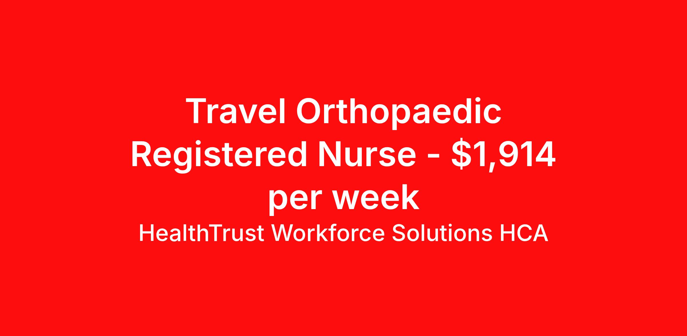 HealthTrust Workforce Solutions HCA is seeking a travel nurse RN Orthopedics for a travel nursing job in Ocala, Florida. Job Description & Requirements Specialty: Orthopedics Discipline: RN Duration: 13 weeks 36 hours per week Shift: 12 hours, days Employment Type: Travel Entrust Your Career to HealthTrust! At HealthTrust, we believe that healthcare is not defined by the four walls in which it is practiced; it’s defined by its people. We pride ourselves on crafting opportunities that expand skill sets, broaden career horizons, provide economic stability, and cultivate personal growth. HealthTrust Offers: Competitive Pay Packages Guaranteed hours Weekly direct deposit options 401k with Company Match Earn up to $750 for referrals Free Private Furnished Housing or Tax-Free Subsidy To get started, you will need: RN's a minimum of 1 year in specialty Allied 6 months of experience An adventurous spirit and fierce dedication Degree in corresponding specialty as required Appropriate certifications and licensure as needed for the specific position HealthTrust Benefits: Opportunities for a lifetime: When you become a part of the HCA family, you will have exclusive access to more opportunities than any other healthcare system in the nation. At HWS, we help open the door to a lifetime of lasting career opportunities. A culture of care: Our clinicians have made HWS an industry leader for over 25 years. We are passionate about our mission that, above all else, we are committed to the care and improvement of human life. Career Development: As a wholly owned subsidiary of HCA Healthcare, HWS is a preferred partner to thousands of top-performing hospitals. We provide our healthcare professionals with first-priority access to more than 200,000 jobs nationwide. We are uniquely positioned to offer you exclusive and direct access to HCA Healthcare’s vast network of facilities. Let us open the door to nationwide opportunities that fit your lifestyle! We are an equal opportunity employer and value diversity at our company. We do not discriminate on the basis of race, religion, color, national origin, gender, sexual orientation, age, marital status, veteran status, or disability status. Job Requirements Certifications : BLS (Required) HealthTrust Workforce Solutions HCA Job ID 995369. Posted job title: Travel Nurse - Orthopaedics About HealthTrust Workforce Solutions HCA At HealthTrust Workforce Solutions, healthcare is not just about the four walls of a facility but about the people who provide and receive care. Our focus is on empowering healthcare professionals to deliver exceptional patient experiences by providing them with the necessary skills, tools, and support. We partner with healthcare facilities nationwide to ensure that the right professionals are in the right roles. We prioritize our clinicians by giving them a voice and access to opportunities to fulfill their mission of improving lives by providing quality patient care. We are committed to our core values of Trust, Innovation, Adaptability, Courage, and Accountability. We are dedicated to positively impacting the healthcare industry by providing first-priority access to more than 200,000 jobs nationwide to our healthcare professionals. Join us and be part of the HealthTrust family, where you can make a difference every day. We embrace our changing environment, and we maintain a culture that has a rich tradition of transforming itself to meet the challenges of the future. MISSION STATEMENT While putting great people in the right roles is essential, our mission is far greater. We want our clinicians to be part of the HealthTrust family, where healthcare professionals have a voice and are empowered with the right tools and opportunities to fulfill their personal mission of improving lives. Plus, as a preferred partner to thousands of top-performing hospitals, we provide our healthcare professionals with first-priority access to more than 200,000 jobs nationwide. Benefits Dental benefits Vision benefits Referral bonus Continuing Education Life insurance