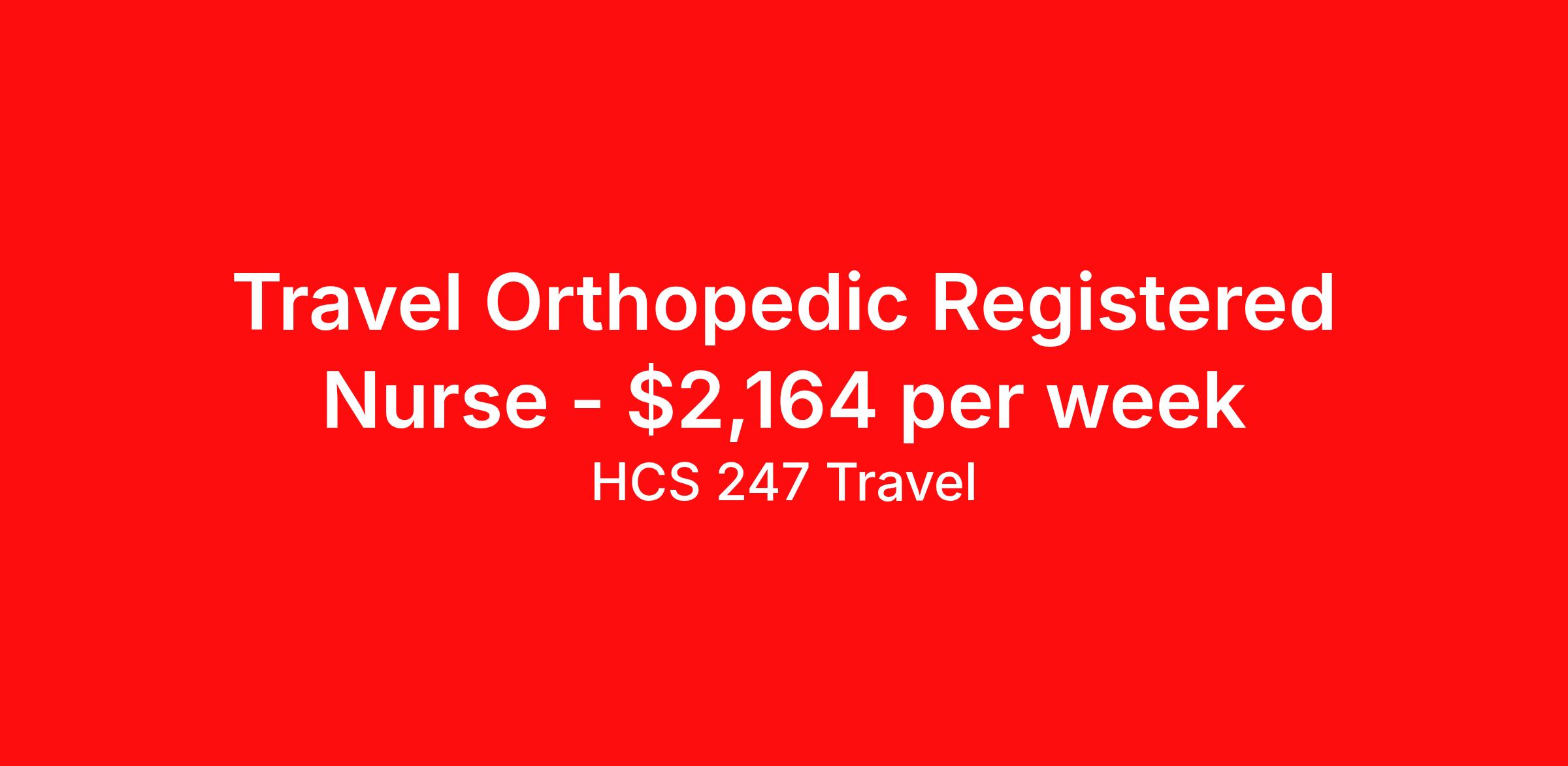 HCS 247 Travel is seeking a travel nurse RN Orthopedic Surgery for a travel nursing job in Asheville, North Carolina. Job Description & Requirements Specialty: Orthopedic Surgery Discipline: RN Start Date: 04/06/2026 Duration: 13 weeks 36 hours per week Shift: 12 hours, nights Employment Type: Travel HCS 247 Travel Job ID 61564362. Pay package is based on 12 hour shifts and 36 hours per week (subject to confirmation) with tax-free stipend amount to be determined. About HCS 247 Travel HCS 24/7 is a national healthcare staffing organization specializing in the placement of Registered Nurses and Allied health professionals across acute care and other clinical settings. We support travel assignments, local short- and long-term contracts, per diem, temp-to-perm, and direct hire opportunities nationwide. Our clinical coverage includes Registered Nurse specialties such as ER, ICU, Med-Surg, Telemetry, Step-Down, OR, PACU, L&D, Mother/Baby, NICU, Cath Lab, Endoscopy, and more along with a full range of allied and imaging professionals, including Respiratory Therapists, Surgical Technicians, X-Ray Techs, CT Techs, MRI Techs, Interventional Radiology (IR) Techs, Cath Lab Techs, Ultrasound/Sonographers, Mammography Techs, and Nuclear Medicine Techs. With competitive compensation and benefits, consistent opportunities, and a clinician-first approach backed by top-rated customer service, HCS 24/7 delivers a seamless experience from initial application through assignment completion. Benefits Holiday Pay Guaranteed Hours Continuing Education Mileage reimbursement Referral bonus Medical benefits Dental benefits Vision benefits License and certification reimbursement Life insurance Benefits start day 1 Weekly pay