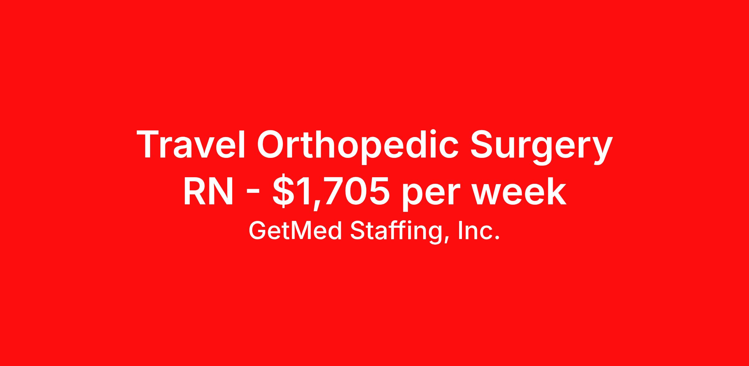 GetMed Staffing, Inc. is seeking a travel nurse RN Orthopedic Surgery for a travel nursing job in Asheville, North Carolina. Job Description & Requirements Specialty: Orthopedic Surgery Discipline: RN Start Date: 03/30/2026 Duration: 13 weeks 36 hours per week Shift: 12 hours, days Employment Type: Travel GetMed Staffing is searching for a strong Ortho RN to assist our traveler-friendly client. A minimum of 1-2 years of experience is required. Traveling with GetMed Staffing offers the unique opportunity to gain diverse experiences, both personally and professionally. Gain experience that matters. GetMed Staffing, Inc. Job ID 36126222. Pay package is based on 12 hour shifts and 36.0 hours per week (subject to confirmation) with tax-free stipend amount to be determined. Posted job title: RN:Ortho,07:00:00-19:00:00 About GetMed Staffing, Inc. We are a diversity owned company, specializing in healthcare recruiting services. We truly understand how important a healthcare travelers' relationship is with their recruiter, as well as our relationship is with our healthcare facilities. We recognize that the needs of our healthcare travelers can vary, and therefore we provide the personalized touch necessary to ensure a successful travel assignment each and every time. Our healthcare facilities and clients benefit from us putting our healthcare travelers first. GetMed Staffing is excited to be a leader within the industry by focusing on providing healthcare travelers with more choices and possibilities as they plan for their next healthcare travel assignment. Benefits Life insurance Medical benefits Dental benefits Vision benefits 401k retirement plan