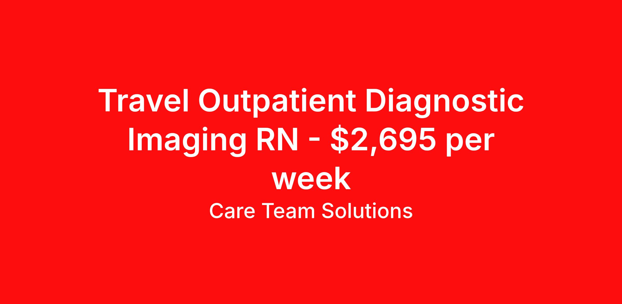 Care Team Solutions is seeking a travel nurse RN Outpatient Radiology for a travel nursing job in Rochester, New York. Job Description & Requirements Specialty: Radiology Discipline: RN Start Date: 05/11/2026 Duration: 13 weeks 40 hours per week Shift: 8 hours Employment Type: Travel Registered Nurse must have 2 years of recent experience in particular specialty Details: Must Have 2 Years of recent Diagnostic Imaging experience. Specialty: Diagnostic Imaging Discipline: Registered Nurse Start Date: 2026-05-11 Duration: 13 Weeks Shift: 8 Hours Evening shift. Hours Per Week: 40 Hours Employment Type: Contract Gross Weekly Pay: $2695.14 Six things that won’t happen if you apply to this job: You won’t have to guess what the downsides are. We’ll tell you up front. You won’t show up on day 1 and find out this is not what you signed up for. We won't leave your phone call ringing when it's inconvenient. Business hours for you are business hours for us. You won’t get shuffled to some customer service rep when a problem pops up. If we screw up something in securing your placement, we'll own it. That means it's on us to make it right. You won’t figure out your credentials alone. Our credentialing experts will walk you through it step by step. We've talked to thousands of travel nurses like you. We know you want good pay. You want to choose when you work. But the one thing nurse after nurse has said they want and don't have is someone in their corner. There's a lot in this business that’s messed up. We’re trying to be the people that fix it. You and every nurse with the guts to travel deserve it. We've worked hard for you to enjoy some one-of-a-kind benefits you'll not likely find anywhere else, because they benefit you more than they benefit us: Our early pay program Student loan reimbursement Free well-being tele-visits with a psychologist Care Team Solutions Job ID 587257. Pay package is based on 8 hour shifts and 40 hours per week (subject to confirmation) with tax-free stipend amount to be determined. Posted job title: SMH Level 3 RN Diagnostic Imaging Outpatient - Days/Evenings About Care Team Solutions Two brothers who give an enormous damn. We're Justin and Kyle. Neither of us are nurses. It doesn’t take a nurse to see that the way travel nurses are treated sucks. Nursing is already hard enough. Travel nursing takes serious guts. You get the toughest assignments in places you’ve never been. Which can be fun, but it’s also stressful. You’re in your element but outside of your hometown. You can be a stranger on the team. If anyone deserves someone in their corner, it’s you. But that’s not how most agencies operate. Which is why travel nurses hate working with them. We got into this business because we saw bucket-loads of nurses moving through the "churn and burn" travel machinery. We absolutely hate that. You'll do your best work when you have the placements you want and feel fully supported in your work. We pay our people well because we want them to treat you well. Our recruiters are amazing (we picked each of them ourselves), but if you've got a problem too big for them, they can come straight to us. We work like ten feet away. The "Churners and Burners" promise you the same benefits. They might as well copy/paste them from each other. We have them too: 401k, holiday pay, healthcare, dental, travel reimbursement, etc But we've worked hard for you to enjoy some one-of-a-kind benefits you'll not likely find anywhere else, because they benefit you more than they benefit us: Our early pay program Student loan reimbursement Free well-being tele-visits with a psychologist Benefits Weekly pay Holiday Pay Guaranteed Hours 401k retirement plan Wellness and fitness programs Referral bonus Medical benefits Dental benefits Vision benefits School loan reimbursement