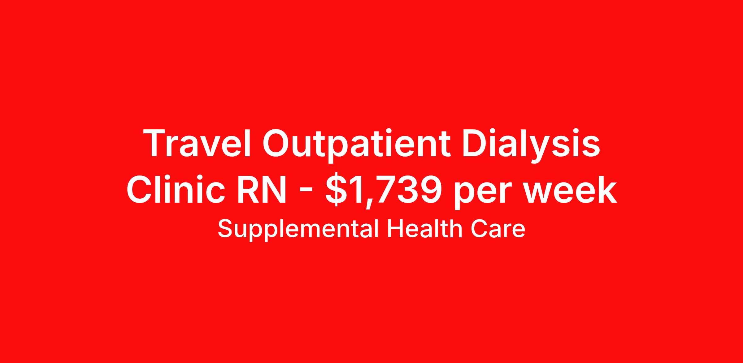 Supplemental Health Care is seeking a travel nurse RN Clinic Outpatient Dialysis for a travel nursing job in Bloomington, Illinois. Job Description & Requirements Specialty: Outpatient Dialysis Discipline: RN Start Date: ASAP Duration: 13 weeks 36 hours per week Shift: 12 hours, days Employment Type: Travel Job Description: Dialysis Clinic RN Supplemental Health Care is hiring Dialysis Registered Nurses for contract assignments at a partnering clinic in Bloomington, Illinois. Whether you’re looking to travel or stay local, we’re committed to helping Dialysis RNs find the right fit with top healthcare facilities across the country. With more than 40 years of experience in healthcare staffing, Supplemental Health Care offers reliable support, competitive pay, and great benefits every step of the way. Qualifications: Active Nursing License AHA BLS 1 year of experience Experience in Dialysis Clinic Able to work independently in a fast-paced environment Flexible, strong communication skills Adaptable and willingness to work with others Dialysis RN Contract Details: $1,566 - $1,739 per week* 25-week contract with possibility of extension Dialysis Clinic Facility *Estimated weekly payment may include both taxable wages and tax-free reimbursements for meals, housing, and incidentals. Please speak with a recruiter for details. Apply today to get started with this Dialysis Registered Nurse contract opportunity, or talk to our team about the full range of RN opportunities available. What We Offer: Full medical, dental, vision, life, and even pet insurance! Round the clock support. No matter where you are or what time it is, Supplemental Health Care is standing by. SHC's Share the Care referral program is the most dynamic, profitable referral program in the industry. 401(k) Retirement Savings Program with a wide range of investment options. Discounted and free online access to CEU courses through Supplemental University. Supplemental Health Care is an Equal Opportunity Employer. All candidates, including veterans and those with disabilities, are encouraged to apply. SHC will consider for employment qualified applicants with criminal histories in a manner consistent with the requirements of applicable local, state, or federal law. To learn more, visit www.shccares.com/eeo Supplemental Health Care Job ID 1468691. Pay package is based on 12 hour shifts and 36 hours per week (subject to confirmation) with tax-free stipend amount to be determined. Posted job title: RN - Dialysis About Supplemental Health Care At Supplemental Health Care, a simple belief in the power of caring guides a unique commitment to world-class service in healthcare staffing. For 40 years, we’ve supported talented professionals pursuing their life calling in hospitals, schools, home health, corrections, behavioral health, and other settings. At SHC, we inspire vital connections and enrich lives and inspire better outcomes. As recipients of the Best in Staffing Awards for both Client and Talent, Supplemental Health Care is proud to be among only 2% of staffing companies singled out for the distinction based on the real feedback of our employees and the clients we serve. SHC has also earned The Joint Commission’s Gold Seal of Approval and is named among the Largest Health Care Staffing companies in the United States by Staffing Industry Analysts. We are also thrilled to recognize our very own SLP, Dr. Kelly Byrd as the American Staffing Association 2024 National Staffing Employee of the Year and Health Care Sector All-Star. We’re honored to connect Dr. Byrd to employment, share her incredible story, and support her family literacy nonprofit. For everyone that we serve, SHC is the place where caring hearts thrive. Benefits Referral bonus Benefits start day 1 401k retirement plan Continuing Education Discount program Health savings account