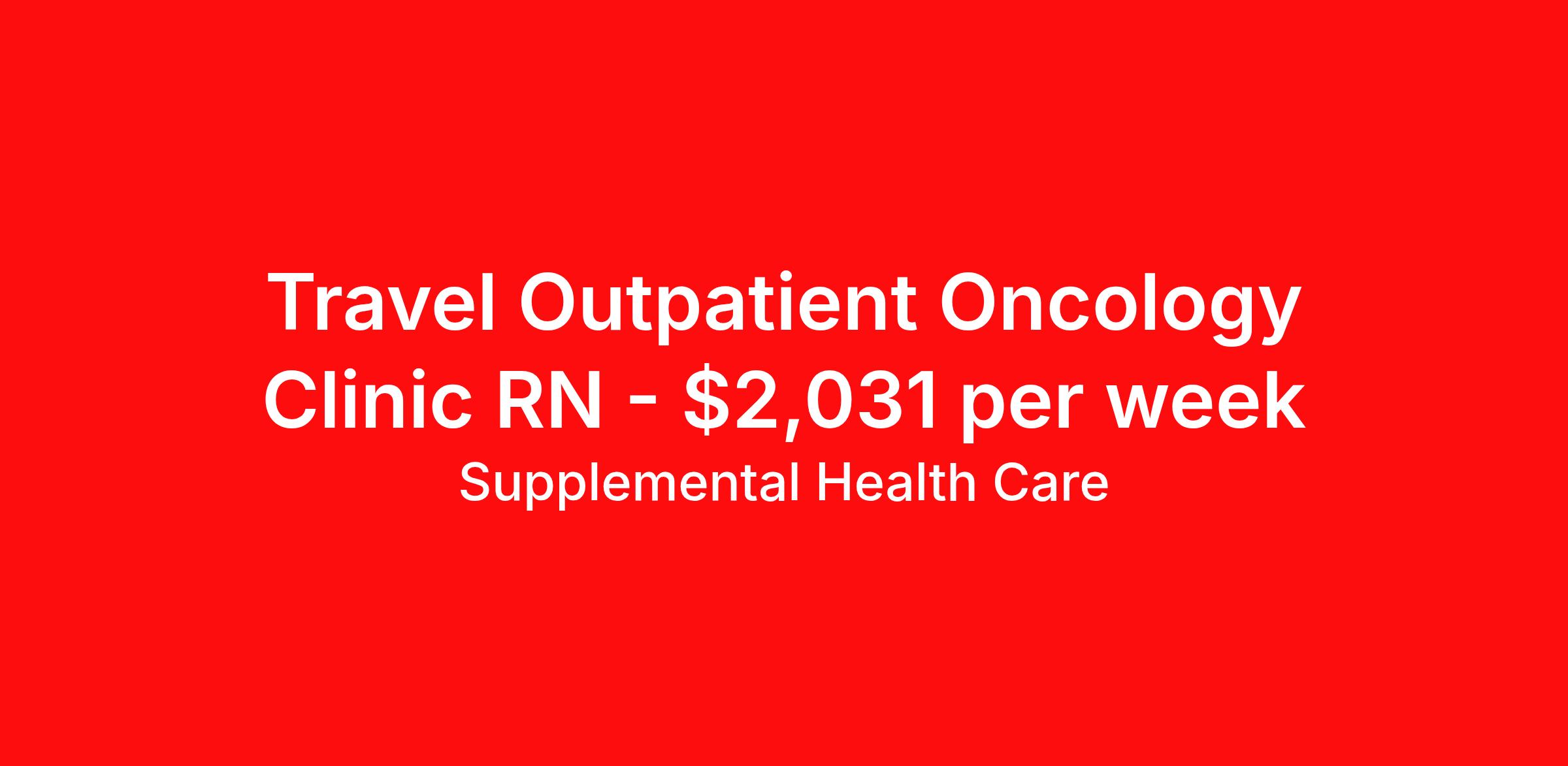 Supplemental Health Care is seeking a travel nurse RN Clinic Oncology for a travel nursing job in Greenlawn, New York. Job Description & Requirements Specialty: Oncology Discipline: RN Start Date: ASAP Duration: 13 weeks 40 hours per week Shift: 8 hours, days, nights Employment Type: Travel Job Description: Supplemental Health Care is hiring Oncology Registered Nurses for contract assignments at a partnering clinic in Greenlawn, New York. Whether you’re looking to travel or stay local, we’re committed to helping RNs find the right fit with top healthcare facilities across the country. With more than 40 years of experience in healthcare staffing, Supplemental Health Care offers reliable support, competitive pay, and great benefits every step of the way. Qualifications: Current New York RN license 2 years of previous nursing experience American Heart Association BLS certification Prior Oncology experience Oncology RN Contract Details: 13-week contract with possibility of extension $1,820 - $2,031 per week* Outpatient Clinic Facility *Estimated weekly payment may include both taxable wages and tax-free reimbursements for meals, housing, and incidentals. Please speak with a recruiter for details. Apply today to get started with this Registered Nurse contract opportunity, or talk to our team about the full range of RN opportunities available. What We Offer: Full medical, dental, vision, life, and even pet insurance! Round the clock support. No matter where you are or what time it is, Supplemental Health Care is standing by. SHC's Share the Care referral program is the most dynamic, profitable referral program in the industry. 401(k) Retirement Savings Program with a wide range of investment options. Discounted and free online access to CEU courses through Supplemental University. Supplemental Health Care Job ID 1470217. Pay package is based on 8 hour shifts and 40 hours per week (subject to confirmation) with tax-free stipend amount to be determined. Posted job title: Outpatient Clinic RN – Oncology About Supplemental Health Care At Supplemental Health Care, a simple belief in the power of caring guides a unique commitment to world-class service in healthcare staffing. For 40 years, we’ve supported talented professionals pursuing their life calling in hospitals, schools, home health, corrections, behavioral health, and other settings. At SHC, we inspire vital connections and enrich lives and inspire better outcomes. As recipients of the Best in Staffing Awards for both Client and Talent, Supplemental Health Care is proud to be among only 2% of staffing companies singled out for the distinction based on the real feedback of our employees and the clients we serve. SHC has also earned The Joint Commission’s Gold Seal of Approval and is named among the Largest Health Care Staffing companies in the United States by Staffing Industry Analysts. We are also thrilled to recognize our very own SLP, Dr. Kelly Byrd as the American Staffing Association 2024 National Staffing Employee of the Year and Health Care Sector All-Star. We’re honored to connect Dr. Byrd to employment, share her incredible story, and support her family literacy nonprofit. For everyone that we serve, SHC is the place where caring hearts thrive. Benefits Referral bonus Benefits start day 1 401k retirement plan Continuing Education Discount program Health savings account