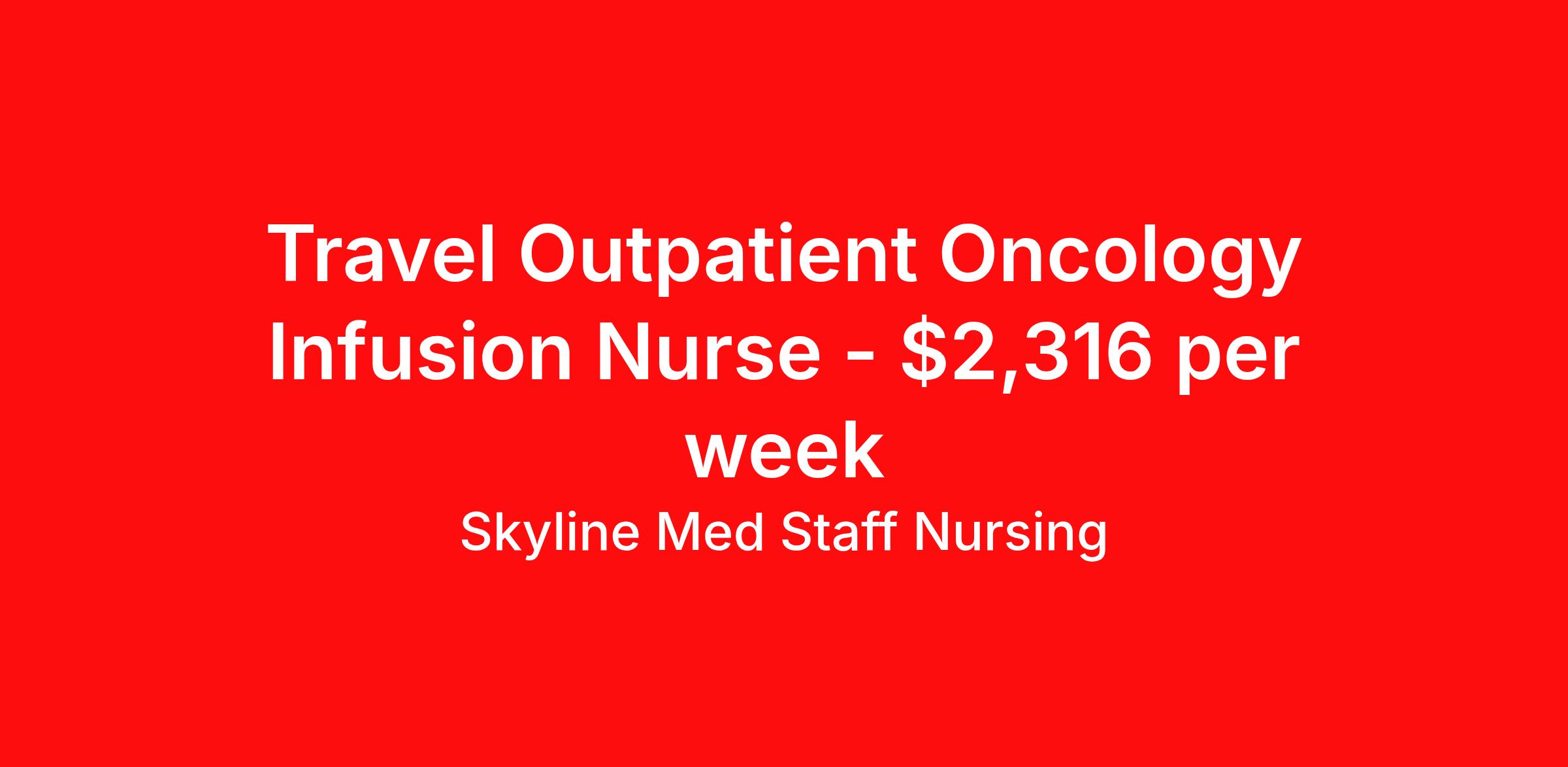 Skyline Med Staff Nursing is seeking a travel nurse RN Oncology for a travel nursing job in Washington, District of Columbia. Job Description & Requirements Specialty: Oncology Discipline: RN Start Date: 04/20/2026 Duration: 13 weeks 40 hours per week Shift: 10 hours, days Employment Type: Travel Weekly amount stated in job postings is an estimate based on estimated hourly wage and potential stipends available for the location of the assignment. Pay package is calculated on bill rate at the time job was posted, but can change or vary without notice. Exact pay packages might vary as this is an estimate. Our recruiter would be happy to build an exact pay package for you for each job. Skyline Med Staff Nursing Job ID 36039195. Pay package is based on 10 hour shifts and 40.0 hours per week (subject to confirmation) with tax-free stipend amount to be determined. Posted job title: RN:Oncology,07:00:00-17:00:00 About Skyline Med Staff Nursing Join the Top- Rated Travel Healthcare Team! Skyline Med Staff was named as the 1 Best Travel Healthcare Company in 2025 by BluePipes, a recognition driven by glowing reviews from travel healthcare professionals. Our recruiters are consistently praised on Google for their responsiveness, dedication, accessibility, and industry knowledge. Ready to experience the difference? Apply for a job today and see why healthcare professionals choose Skyline! Certified Women Owned Business We believe that travel is good for the soul. We want to be on your journey with you and find the right job that fits you Skyline Med Staff is committed to one vision treating others the way that THEY want to be treated. The executive team at Skyline Med Staff focuses on a commitment to quality, consistency, and the highest level of service. Our team members continually strive to build long term relationships that center on you and helping you achieve your goals. Some of the Benefits you will receive with Skyline Med Staff: Over 30 years of combined experience in the staffing industry Higher Take-Home Pay Rates Dedicated Personal Recruiter We are available to you 24/7 Health Insurance Plan Options Tax Free Per Diems, Housing Stipends and Travel Reimbursements Joint Commission Certified Contracts in all 50 states Referral and Loyalty Bonuses Benefits Medical benefits Referral bonus