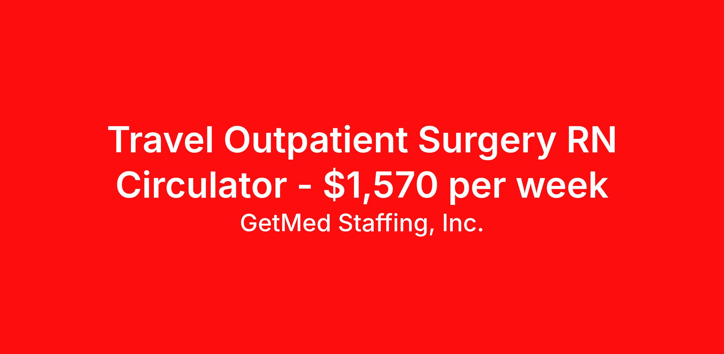 GetMed Staffing, Inc. is seeking a travel nurse RN Outpatient OR Circulate for a travel nursing job in Augusta, Georgia. Job Description & Requirements Specialty: OR Circulate Discipline: RN Start Date: 04/13/2026 Duration: 14 weeks 36 hours per week Shift: 9 hours, days Employment Type: Travel GetMed Staffing is searching for a strong Ambulatory/Outpatient Care RN to assist our traveler-friendly client. A minimum of 1-2 years of experience is required. Traveling with GetMed Staffing offers the unique opportunity to gain diverse experiences, both personally and professionally. Gain experience that matters. GetMed Staffing, Inc. Job ID 35940144. Pay package is based on 9 hour shifts and 36.0 hours per week (subject to confirmation) with tax-free stipend amount to be determined. Posted job title: RN:Ambulatory/Outpatient Care,07:00:00-16:00:00 About GetMed Staffing, Inc. We are a diversity owned company, specializing in healthcare recruiting services. We truly understand how important a healthcare travelers' relationship is with their recruiter, as well as our relationship is with our healthcare facilities. We recognize that the needs of our healthcare travelers can vary, and therefore we provide the personalized touch necessary to ensure a successful travel assignment each and every time. Our healthcare facilities and clients benefit from us putting our healthcare travelers first. GetMed Staffing is excited to be a leader within the industry by focusing on providing healthcare travelers with more choices and possibilities as they plan for their next healthcare travel assignment. Benefits Life insurance Medical benefits Dental benefits Vision benefits 401k retirement plan