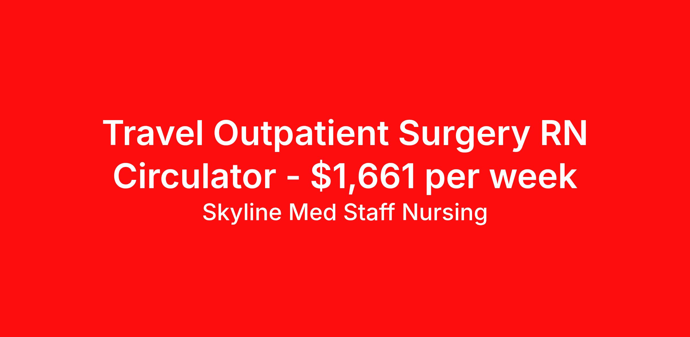 Skyline Med Staff Nursing is seeking a travel nurse RN Outpatient OR Circulate for a travel nursing job in Augusta, Georgia. Job Description & Requirements Specialty: OR Circulate Discipline: RN Start Date: 04/13/2026 Duration: 14 weeks 36 hours per week Shift: 12 hours, days Employment Type: Travel Weekly amount stated in job postings is an estimate based on estimated hourly wage and potential stipends available for the location of the assignment. Pay package is calculated on bill rate at the time job was posted, but can change or vary without notice. Exact pay packages might vary as this is an estimate. Our recruiter would be happy to build an exact pay package for you for each job. Skyline Med Staff Nursing Job ID 35940245. Pay package is based on 12 hour shifts and 36.0 hours per week (subject to confirmation) with tax-free stipend amount to be determined. Posted job title: RN:Outpatient,07:00:00-19:00:00 About Skyline Med Staff Nursing Join the Top- Rated Travel Healthcare Team! Skyline Med Staff was named as the 1 Best Travel Healthcare Company in 2025 by BluePipes, a recognition driven by glowing reviews from travel healthcare professionals. Our recruiters are consistently praised on Google for their responsiveness, dedication, accessibility, and industry knowledge. Ready to experience the difference? Apply for a job today and see why healthcare professionals choose Skyline! Certified Women Owned Business We believe that travel is good for the soul. We want to be on your journey with you and find the right job that fits you Skyline Med Staff is committed to one vision treating others the way that THEY want to be treated. The executive team at Skyline Med Staff focuses on a commitment to quality, consistency, and the highest level of service. Our team members continually strive to build long term relationships that center on you and helping you achieve your goals. Some of the Benefits you will receive with Skyline Med Staff: Over 30 years of combined experience in the staffing industry Higher Take-Home Pay Rates Dedicated Personal Recruiter We are available to you 24/7 Health Insurance Plan Options Tax Free Per Diems, Housing Stipends and Travel Reimbursements Joint Commission Certified Contracts in all 50 states Referral and Loyalty Bonuses Benefits Medical benefits Referral bonus