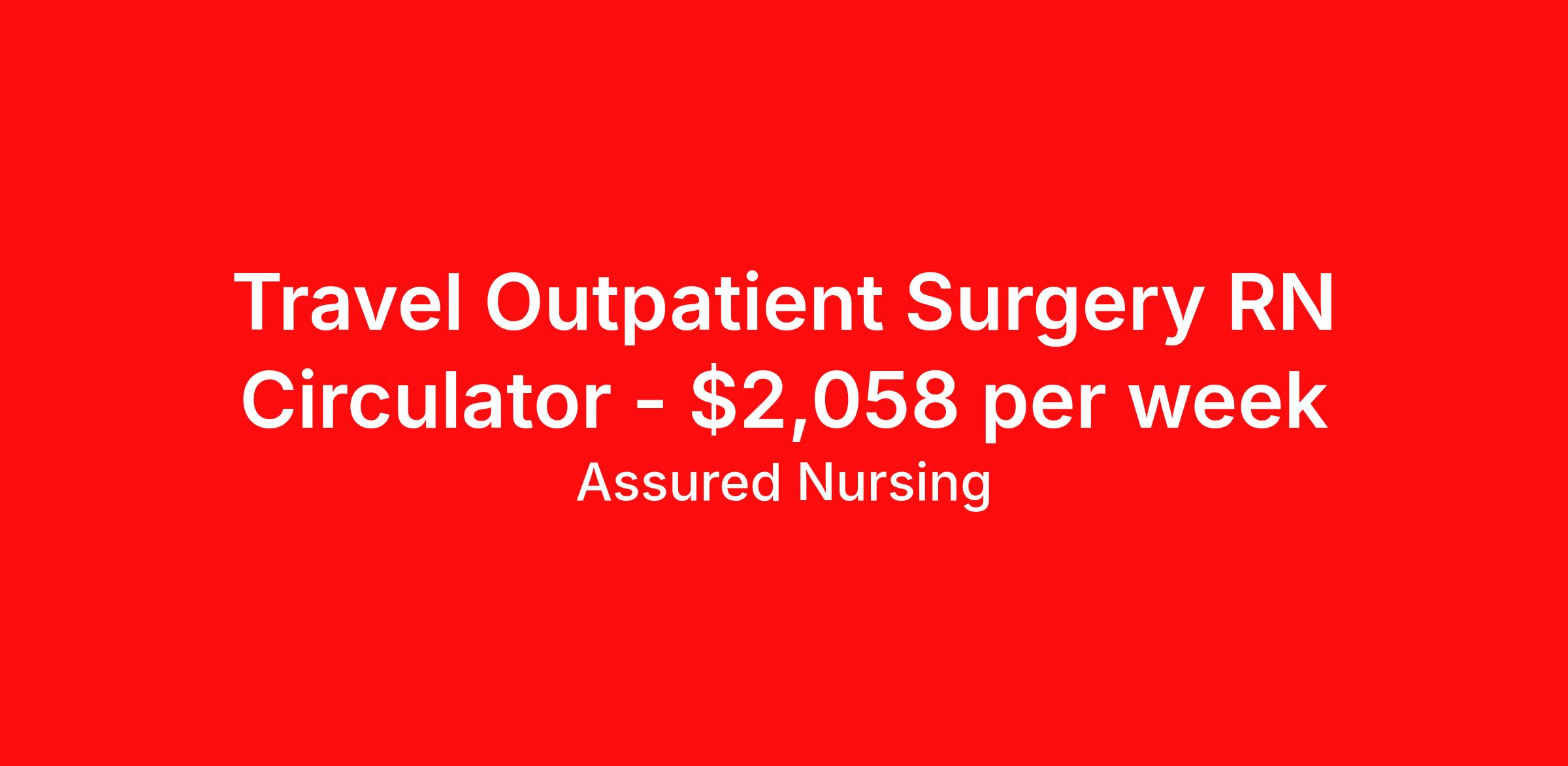 Assured Nursing is seeking a travel nurse RN OR Circulate for a travel nursing job in Augusta, Georgia. Job Description & Requirements Specialty: OR Circulate Discipline: RN Start Date: 04/13/2026 Duration: 14 weeks 40 hours per week Shift: 9 hours, days Employment Type: Travel Assured Nursing is currently seeking a RN for a contract position in Augusta Georgia . This is a 8a-5p, 08:00:00-16:00:00, 8.00-5 position in the 70150,Outpatient Surgery . The ideal candidate will possess a current state license as a RN and have at least 2 years of recent experience as a Other RN . Assured Nursing Job ID 35865617. Pay package is based on 9 hour shifts and 40.0 hours per week (subject to confirmation) with tax-free stipend amount to be determined. Posted job title: RN:Other,08:00:00-16:00:00 Benefits Weekly pay Holiday Pay 401k retirement plan Referral bonus Medical benefits Dental benefits Vision benefits