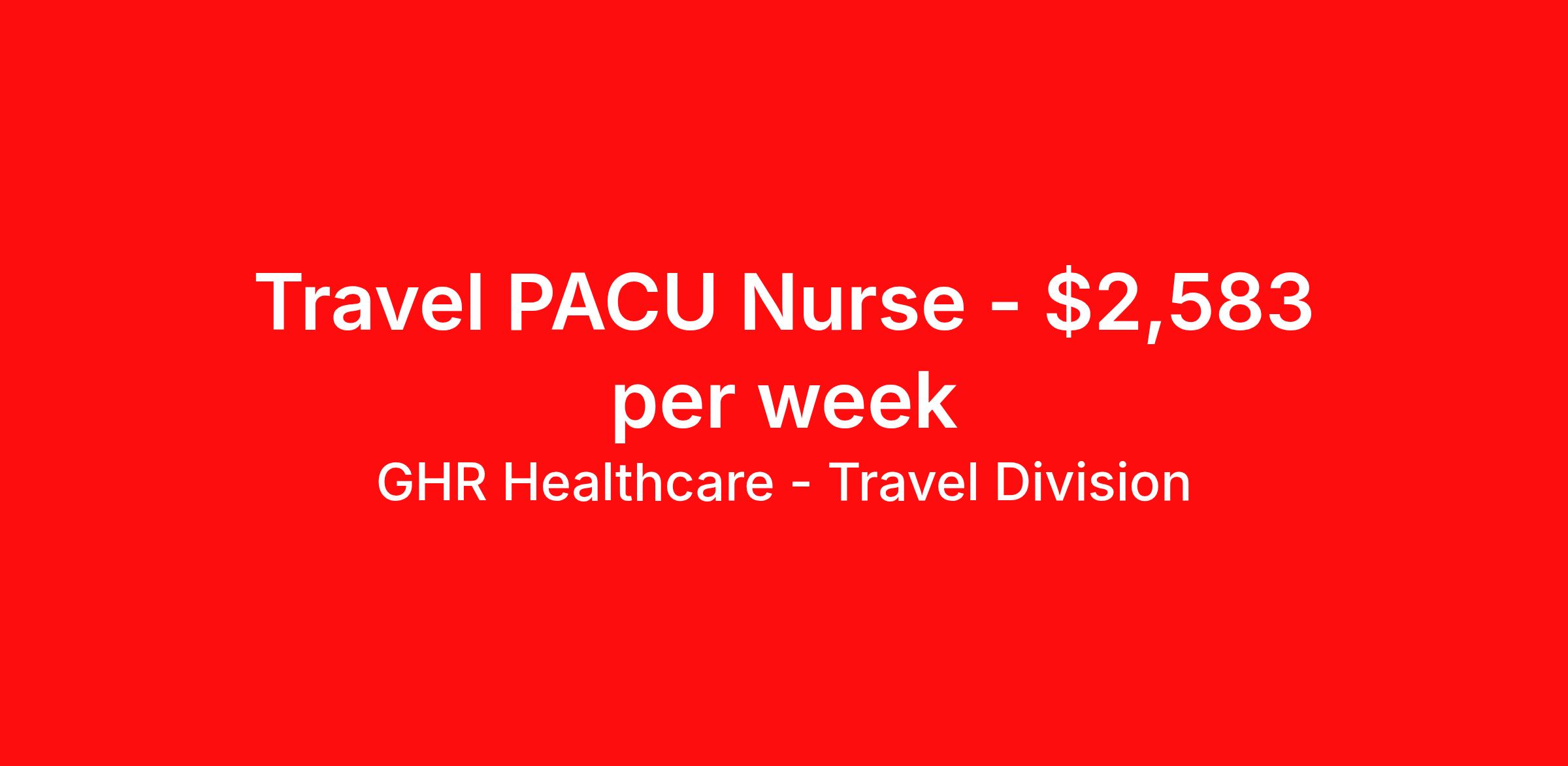 GHR Healthcare - Travel Division is seeking a travel nurse RN PACU - Post Anesthesia Care for a travel nursing job in Plymouth, Massachusetts. Job Description & Requirements Specialty: PACU - Post Anesthesia Care Discipline: RN Start Date: ASAP Duration: 13 weeks 36 hours per week Shift: 12 hours Employment Type: Travel GHR Healthcare - Travel Division Job ID 73565805. Pay package is based on 12 hour shifts and 36 hours per week (subject to confirmation) with tax-free stipend amount to be determined. About GHR Healthcare - Travel Division For over 30 years, GHR Healthcare has been the bridge between healthcare professionals and the facilities that need them nationwide. We're committed to uncovering your ideal fit, supported by GHR's dedication to competitive compensation, transparent communication, and a devoted team that genuinely cares about your career journey. You can trust us to stand by your side as your advocate, confidante, and partner in advancing your career. At GHR, care and consideration are at the heart of everything we do. Visit ghrhealthcare.com to learn more.