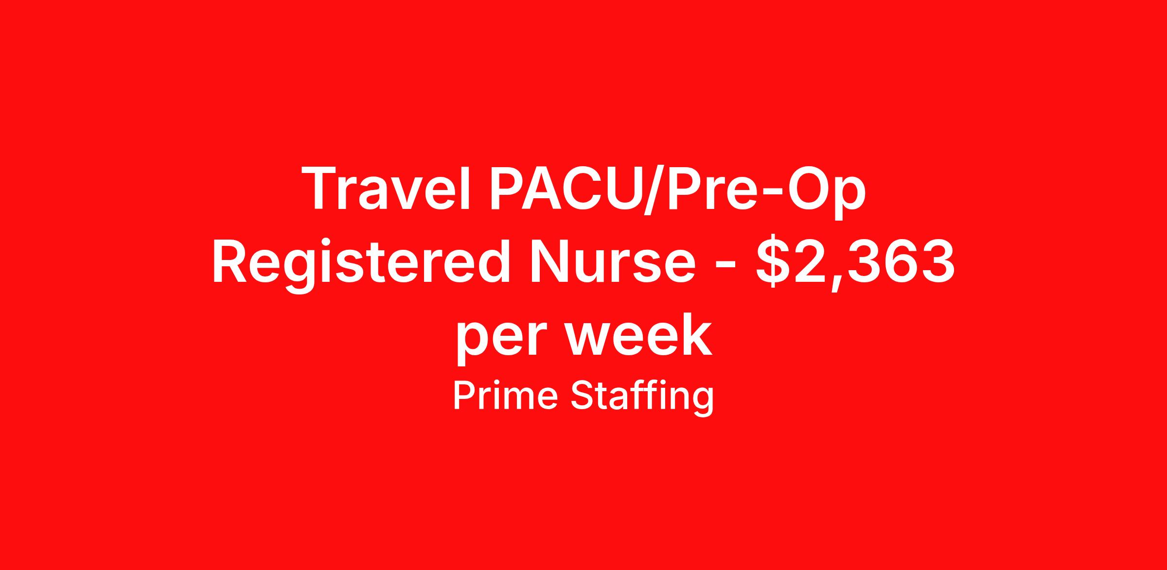 Prime Staffing is seeking a travel nurse RN PreOp / PACU - Post Anesthesia Care for a travel nursing job in Greenbrae, California. Job Description & Requirements Specialty: PreOp / PACU - Post Anesthesia Care Discipline: RN Start Date: ASAP Duration: 13 weeks 36 hours per week Shift: 12 hours Employment Type: Travel About the Position Specialty: Registered Nurse – PACU Experience: Minimum 2 years of recent PACU or critical care experience required License: Active State or Compact RN License Certifications: BLS, ACLS, PALS (all with expiration dates) Must-Have: All time-off requests must be submitted with the initial application Description: Seeking an experienced PACU RN to provide post-anesthesia care for patients recovering from surgery. Responsibilities include monitoring vital signs, managing pain, assessing recovery, and responding to emergencies as needed. This is a 12-hour shift role with potential floating within similar acuity areas. Call, weekend, and holiday rotations may apply. Compliance onboarding typically takes 4–6 weeks . Voice advantage and nurse manager interviews required. Shifts must be made up in case of callouts. Requirements Required for Onboarding: Active RN License BLS ACLS PALS Prime Staffing Job ID 35703099. Pay package is based on 12 hour shifts and 36.0 hours per week (subject to confirmation) with tax-free stipend amount to be determined. Posted job title: RN:PACU,07:00:00-19:00:00 About Prime Staffing At Prime Staffing, we understand the importance of finding the perfect fit for both our clients and candidates. Prime Staffing utilizes a unique matchmaking approach, providing the most qualified contingent staffing to our clients, and the most competitive contracts to our workforce. Our experienced team takes the time to get to know both our clients and candidates, their needs, and preferences, to ensure that each placement is a success. We offer a wide range of staffing services including temporary, temp-to-perm, and direct hire placements. Our extensive network of qualified candidates includes nurses, allied healthcare professionals, corporate support professionals and executives.