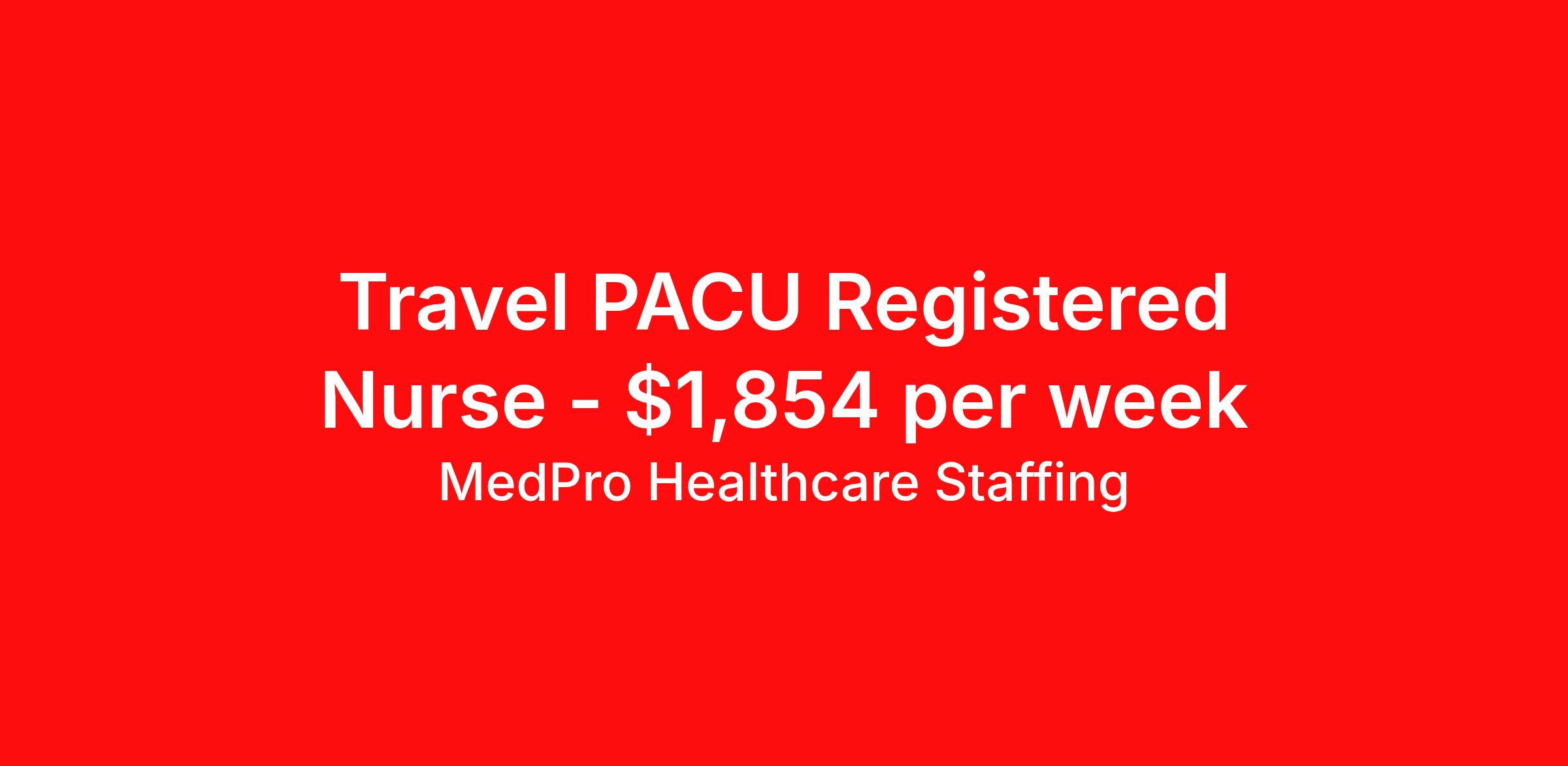MedPro Healthcare Staffing is seeking a travel nurse RN PACU - Post Anesthesia Care for a travel nursing job in Louisville, Kentucky. Job Description & Requirements Specialty: PACU - Post Anesthesia Care Discipline: RN Start Date: 04/06/2026 Duration: 13 weeks 36 hours per week Shift: 12 hours, days Employment Type: Travel MedPro Healthcare Staffing , a Joint Commission-certified staffing agency, is seeking a quality PACU Registered Nurse (RN) for a travel assignment with one of our top healthcare clients. Requirements Active RN License Degree from accredited nursing program BLS, & ACLS Certifications Eighteen months of recent experience in an Acute Care PACU setting Other requirements to be determined by our client facility Benefits Weekly pay and direct deposit Full coverage of all credentialing fees Private housing or housing allowance Group Health insurance for you and your family Company-paid life and disability insurance Travel reimbursement 401(k) matching Unlimited Referral Bonuses up to $1,000 Duties Responsibilities Post Anesthesia Care Unit / PACU RN will assist in recovering the patients from anesthesia. They also monitor patients while they wake up from surgery until they are released, either by discharge to outpatient or transfer to the floor for their patient stay. Provide care for post-operative patients recovering from anesthesia, including general, regional, and local. Treats inpatients and outpatients according to their needs. Administer diligent care via monitoring, assessment, intervention, and continuous reassessment. About Agency MedPro Healthcare Staffing is a Joint Commission certified provider of contract staffing services. Since 1983, we have placed nursing and allied travelers in top healthcare facilities nationwide. Join us today for your very own MedPro Experience®. If qualified and interested, please call for immediate consideration. MedPro Staffing is an Equal Opportunity Employer. All applicants will be considered for employment without attention to race, color, religion, national origin, age, sex, disability, marital status or veteran status. Key Words: Registered Nurse, RN, Operating Room, Scrub, Circulate, OR, Contract Nurse, Travel Nurse, Agency RN, Travel RN, Nursing, Contract, Perioperative nurse *Weekly payment estimates are intended for informational purposes only and include a gross estimate of hourly wages and reimbursements for meal, incidental, and housing expenses. Your recruiter will confirm your eligibility and provide additional details. MedPro Job ID a0Fcx00000DkdRtEAJ. Pay package is based on 12 hour shifts and 36 hours per week (subject to confirmation) with tax-free stipend amount to be determined. Posted job title: PACU Registered Nurse Nursing: PACU - Recovery Room. About MedPro Healthcare Staffing At MedPro Healthcare Staffing , we believe no one cares more for caregivers than we do. Our mission is simple: you focus on your patients, and we’ll take care of the rest. As a Joint Commission-certified leader in temporary and contract healthcare staffing since 1983, MedPro has proudly connected nursing and allied travelers with top healthcare facilities across the nation. With thousands of job opportunities available nationwide, we make it easy to find assignments that align with your goals and lifestyle. Our on-staff clinical support team—alongside a compassionate group of experienced recruiters—provides hands-on guidance every step of the way. From Day 1 medical benefits and a 401(k) plan to personalized career support, we’re committed to ensuring every professional we serve feels valued, cared for, and empowered to succeed. Guided by a CEO who is a Registered Nurse, MedPro is built on a foundation of clinical insight and genuine compassion for the caregiving community. Through The MedPro Experience® , we deliver travel assignments that are rewarding, memorable, and designed to help you DREAM big, EXPLORE often, and ACHIEVE greatness. Benefits Day 1 medical, dental, and vision benefits for you and your family Weekly pay and direct deposit Unlimited Referral Bonuses starting at $500 On Staff Clinical Support Team Access to nationwide travel assignments MPX Mobile app -24/7 real-time access to jobs, credentials, assignment details, and more Full coverage of all credentialing fees Private housing or housing allowance Tax Free Per Diems, Housing Stipends and Travel Reimbursements Company-paid life and disability insurance Travel reimbursement 401(k) matching Benefits Weekly pay Referral bonus Employee assistance programs