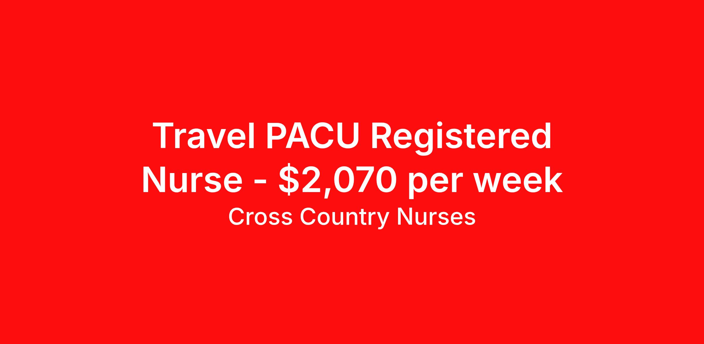 Cross Country Nurses is seeking a travel nurse RN PACU - Post Anesthesia Care for a travel nursing job in Washington, District of Columbia. Job Description & Requirements Specialty: PACU - Post Anesthesia Care Discipline: RN Start Date: 04/06/2026 Duration: 13 weeks 36 hours per week Shift: 12 hours, days Employment Type: Travel Job Description As a post-anesthesia care unit nurse (RN PACU), you will provide short-term care to patients immediately following surgery, from 30 minutes to several hours post-op. Patient observation is essential to your job, including regularly taking vitals, ensuring proper breathing, and administering oxygen or pain medication when necessary. You may also care for patients in the pre-op setting managing their needs and preparing them for surgery. In this role, you must quickly respond to any change in a patient's condition, beginning CPR if necessary. Minimum Requirements At least 1 year of recent acute care experience in specialty Active RN license Benefits The benefits of taking a travel nursing job with Cross Country include: Private housing or generous housing allowance Comprehensive health insurance with prescription coverage Dependent health insurance with prescription coverage Competitive salaries Referral bonuses Travel reimbursement 401(k) retirement plan Direct deposit/free checking Unlimited free CE credits Posted Date: 2026-03-07 Cross Country Job ID 1197756. Pay package is based on 12 hour shifts and 36 hours per week (subject to confirmation) with tax-free stipend amount to be determined. Posted job title: Registered Nurse / Post Anesthesia Care Unit About Cross Country Nurses You care for others — we’re here to care for you. At Cross Country, we know travel nursing is about more than just the job. It’s about building a career that supports your lifestyle, your values, and your impact. We offer competitive pay, full benefits, and 24/7 support from a team that truly understands what it means to be on the front lines. Wherever your journey takes you, we’re with you every step of the way. Let’s build your best life — one assignment at a time. Benefits 401k retirement plan Referral bonus
