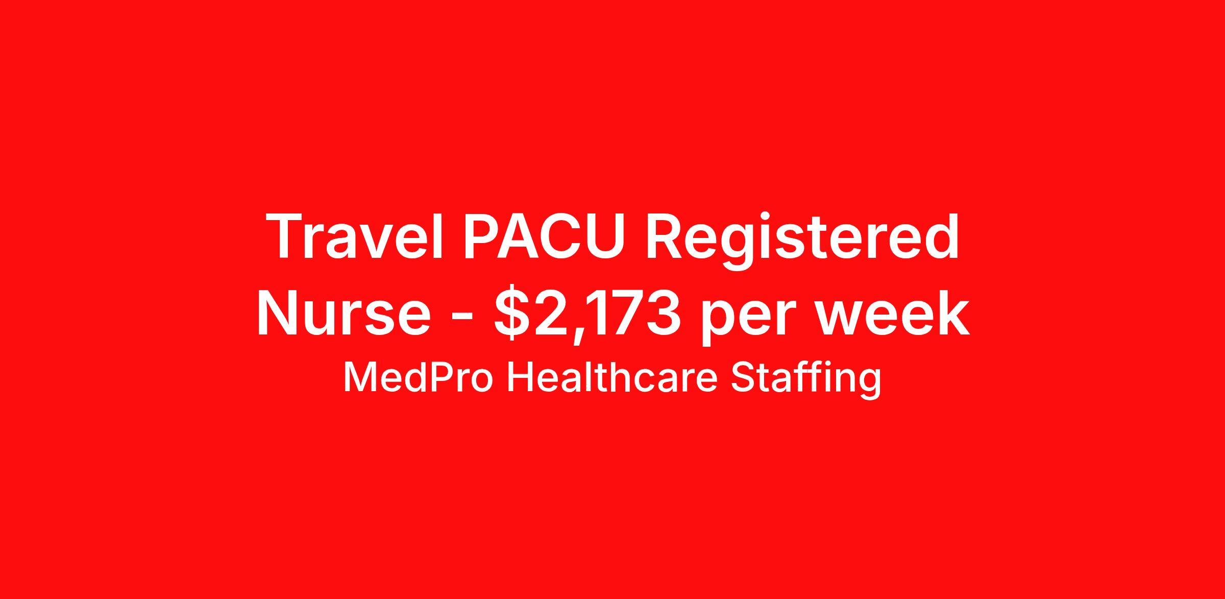 MedPro Healthcare Staffing is seeking a travel nurse RN PACU - Post Anesthesia Care for a travel nursing job in Washington, District of Columbia. Job Description & Requirements Specialty: PACU - Post Anesthesia Care Discipline: RN Start Date: 04/06/2026 Duration: 13 weeks 36 hours per week Shift: 12 hours, days Employment Type: Travel MedPro Healthcare Staffing , a Joint Commission-certified staffing agency, is seeking a quality PACU Registered Nurse (RN) for a travel assignment with one of our top healthcare clients. Requirements Active RN License Degree from accredited nursing program BLS, & ACLS Certifications Eighteen months of recent experience in an Acute Care PACU setting Other requirements to be determined by our client facility Benefits Weekly pay and direct deposit Full coverage of all credentialing fees Private housing or housing allowance Group Health insurance for you and your family Company-paid life and disability insurance Travel reimbursement 401(k) matching Unlimited Referral Bonuses up to $1,000 Duties Responsibilities Post Anesthesia Care Unit / PACU RN will assist in recovering the patients from anesthesia. They also monitor patients while they wake up from surgery until they are released, either by discharge to outpatient or transfer to the floor for their patient stay. Provide care for post-operative patients recovering from anesthesia, including general, regional, and local. Treats inpatients and outpatients according to their needs. Administer diligent care via monitoring, assessment, intervention, and continuous reassessment. About Agency MedPro Healthcare Staffing is a Joint Commission certified provider of contract staffing services. Since 1983, we have placed nursing and allied travelers in top healthcare facilities nationwide. Join us today for your very own MedPro Experience®. If qualified and interested, please call for immediate consideration. MedPro Staffing is an Equal Opportunity Employer. All applicants will be considered for employment without attention to race, color, religion, national origin, age, sex, disability, marital status or veteran status. Key Words: Registered Nurse, RN, Operating Room, Scrub, Circulate, OR, Contract Nurse, Travel Nurse, Agency RN, Travel RN, Nursing, Contract, Perioperative nurse *Weekly payment estimates are intended for informational purposes only and include a gross estimate of hourly wages and reimbursements for meal, incidental, and housing expenses. Your recruiter will confirm your eligibility and provide additional details. MedPro Job ID a0Fcx000009bHr7EAE. Pay package is based on 12 hour shifts and 36 hours per week (subject to confirmation) with tax-free stipend amount to be determined. Posted job title: PACU Registered Nurse Nursing: PACU - Recovery Room. About MedPro Healthcare Staffing At MedPro Healthcare Staffing , we believe no one cares more for caregivers than we do. Our mission is simple: you focus on your patients, and we’ll take care of the rest. As a Joint Commission-certified leader in temporary and contract healthcare staffing since 1983, MedPro has proudly connected nursing and allied travelers with top healthcare facilities across the nation. With thousands of job opportunities available nationwide, we make it easy to find assignments that align with your goals and lifestyle. Our on-staff clinical support team—alongside a compassionate group of experienced recruiters—provides hands-on guidance every step of the way. From Day 1 medical benefits and a 401(k) plan to personalized career support, we’re committed to ensuring every professional we serve feels valued, cared for, and empowered to succeed. Guided by a CEO who is a Registered Nurse, MedPro is built on a foundation of clinical insight and genuine compassion for the caregiving community. Through The MedPro Experience® , we deliver travel assignments that are rewarding, memorable, and designed to help you DREAM big, EXPLORE often, and ACHIEVE greatness. Benefits Day 1 medical, dental, and vision benefits for you and your family Weekly pay and direct deposit Unlimited Referral Bonuses starting at $500 On Staff Clinical Support Team Access to nationwide travel assignments MPX Mobile app -24/7 real-time access to jobs, credentials, assignment details, and more Full coverage of all credentialing fees Private housing or housing allowance Tax Free Per Diems, Housing Stipends and Travel Reimbursements Company-paid life and disability insurance Travel reimbursement 401(k) matching Benefits Weekly pay Referral bonus Employee assistance programs