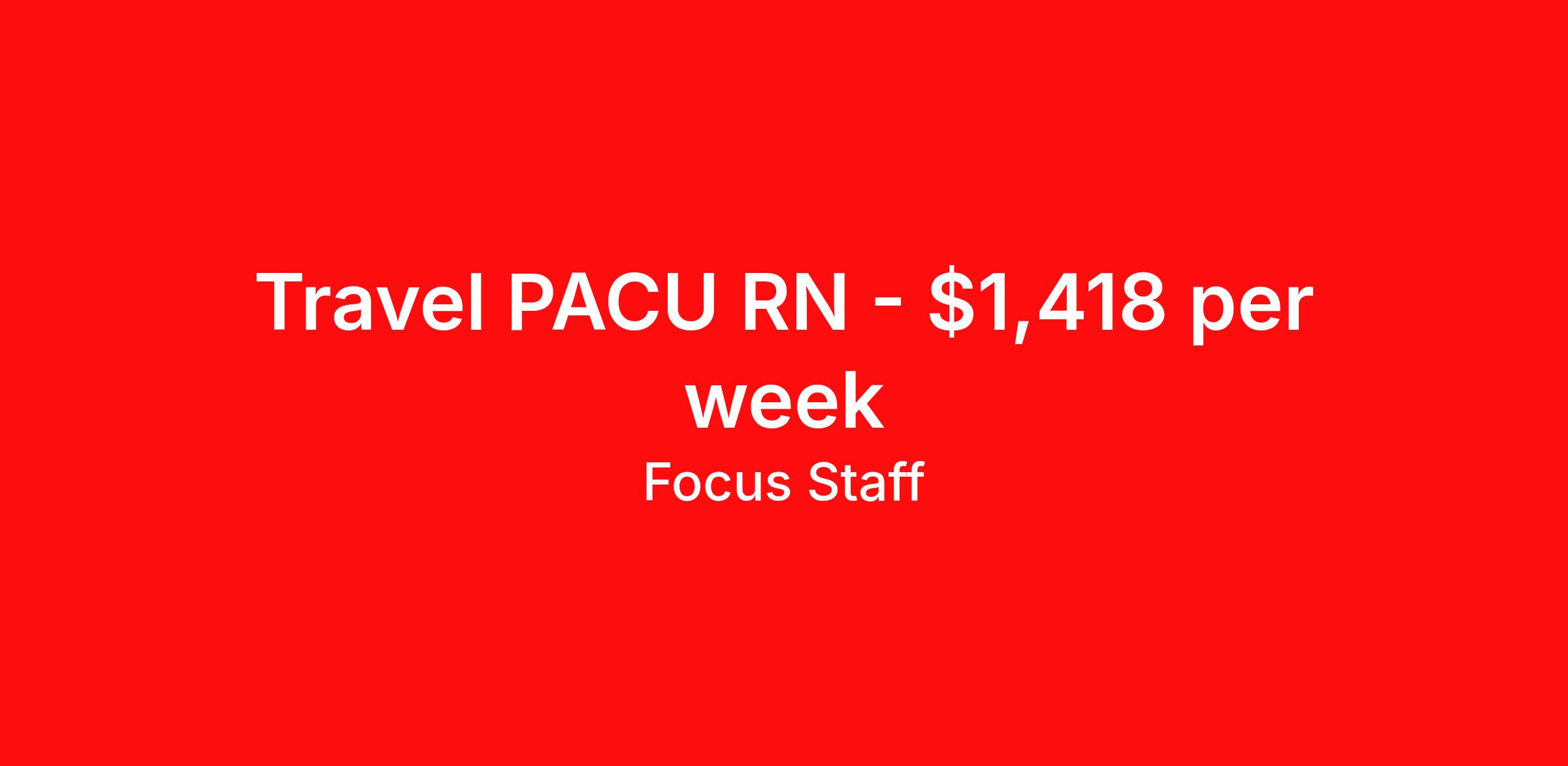 Focus Staff is seeking a travel nurse RN PACU - Post Anesthesia Care for a travel nursing job in Jacksonville, Florida. Job Description & Requirements Specialty: PACU - Post Anesthesia Care Discipline: RN Start Date: 04/12/2026 Duration: 13 weeks 36 hours per week Shift: 12 hours, days Employment Type: Travel Focus Staff is seeking a Post-Anesthesia Care Unit Registered Nurse for a travel contract in Jacksonville, FL. The ideal candidate will have at least 1 year of experience in a PACU setting. Contract Length: 13 Weeks Start Date: 04/12/2026 Shift: 3x12 Days Benefits for Travel PACU RNs: Health insurance Vision insurance Dental insurance Life insurance Licensure reimbursement Travel reimbursement Relocation assistance 401(k) 401(k) matching Competitive pay Referral bonus Holiday bonus Requirements: 1 Year of Experience, 2 Preferred Valid FL RN License BLS (Basic Life Support) ACLS Eligible to work in the United States About Focus Staff: Focus Staff is a traveler-first nurse and healthcare staffing agency! We prioritize the needs of our travelers, giving you complete control over your journey. Our mission is to help you create the life you love, explore the country and do what you do best, help others. Interested in becoming a traveler with Focus Staff? Discover why travelers choose us, apply today! All-Star Status: Dallas 100 (Multiple Years in a Row) Inc. 5000 Middle Market 50 Certified by The Joint Commission Best of Staffing Talent Satisfaction 2022 Best of Staffing Client Satisfaction 2022 Fastest-Growing US Staffing Firms 2017 If you’re seeking a Travel Post-Anesthesia Care Unit Nurse position in Jacksonville, FL and are looking to work with an agency that will listen to your needs and career goals, then Focus Staff is the right place to be. We are proud of our ability to build relationships with all our healthcare professionals, whether you’re seeking travel assignments, PR or permanent positions. We Offer: Immediate Openings Weekly Pay through Direct Deposits Flexible Schedules Day and Night Shifts Available Competitive Compensation Guaranteed Hours (based on employer) Travel Assistance Dedicated/Responsive Recruiters Day One Medical, Dental, Vision and Life Insurance Generous Housing Stipend 24/7 Support Company Provided Housing Options Referral Bonus ($600) Loyalty Bonus ($1,200) Discounts/Coupons to Hotels Access to Jobs in all 50 States Painless Credentialing Process U.S.A.-based Company Equal Opportunity Employer Joint Commission Certified Licensure Reimbursement Pet-Friendly Access to Discounts, Rewards, and more Other Information: Job Title: Travel PACU Nurse Employment Time: Contract/Travel Date Posted: 03/17/2026 07:06:03 PM Valid Through: 07/11/2026 Job City: Jacksonville Job State: FL Job Country: USA Shift: 3x12 Days Job ID: a0xVt00000JwxspIAB Hiring Organization: Focus Staff Focus Staff is an EEO/AA (Equal Employment Opportunity and Affirmative Action) Employer. Estimated pay package based on bill rate at time job was posted. Bill rates can change frequently and without notice. Exact pay package may vary based on several factors, including, but not limited to, guaranteed hours, travel distance, demand, experience, etc. Traveling Registered Nurse, Travel, PACU, RN – PACU, Contract, Travel, Traveling Nursing, Assignment, Registered PACU, Post-Anesthesia Care Unit Nurse, PACU RN, Post-Anesthesia Care Unit Nurse, PACU Travel Nurse, Healthcare RN, PACU Nursing, Nurse RN, RN Nurse, Contract RN Focus Staff Job ID a0xVt00000JwxspIAB. Pay package is based on 12 hour shifts and 36 hours per week (subject to confirmation) with tax-free stipend amount to be determined. Posted job title: Travel PACU RN - Post Anesthesia Care Unit Registered Nurse About Focus Staff Your Journey, Our Focus. Travel Confidently, Care Boldly with Focus Staff. At Focus Staff, we’re here to make your travel healthcare career rewarding, seamless, and stress-free. Whether you’re a travel nurse, therapist, or allied health professional, we take care of the details so you can focus on what you do best — caring for others. Our mission is simple: to help healthcare heroes like you thrive, no matter where your journey takes you. With thousands of job opportunities across all 50 states, our dedicated recruiters work closely with you to match you to the right assignment, based on what matters most to you — pay, location, benefits, or career growth. From day one, you’ll enjoy premium benefits like medical coverage that bridges between assignments, 401K matching, travel and licensing reimbursements, and personalized housing support. Plus, our team is here for you 24/7, with clinical support available whenever you need guidance or backup. At Focus Staff, we believe in making every assignment a smooth, comfortable, and empowering experience. Let’s make your next adventure your best one yet.