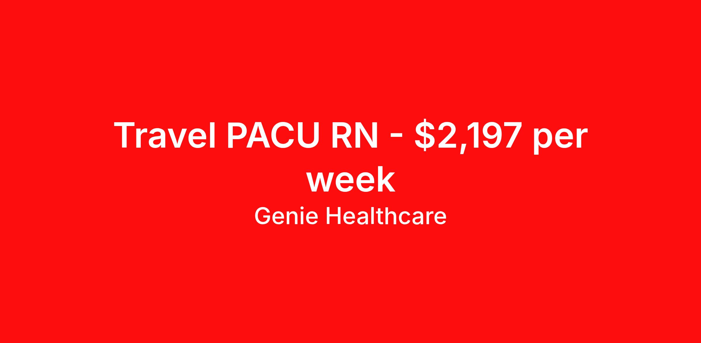Genie Healthcare is seeking a travel nurse RN PACU - Post Anesthesia Care for a travel nursing job in Dublin, Ohio. Job Description & Requirements Specialty: PACU - Post Anesthesia Care Discipline: RN Start Date: 04/05/2026 Duration: 13 weeks 36 hours per week Shift: 12 hours, days Employment Type: Travel Genie Healthcare is looking for a RN to work in PACU for a 12.86 weeks travel assignment located in Dublin, OH for the Shift (3x12hr days, 07:00:00-19:00:00, 12.00-3). Pay and benefits packages are estimated based on client bill rate at time the job was posted. These rates are subject to change. Exact pay and benefits vary based on several things, including, but not limited to, guaranteed hours, client changes in bill rate, experience, etc. Benefits: Medical Insurance, Dental Insurance, Vision Insurance, 401(k) with company matching (50% up to 6% of what you contribute) Genie Healthcare Job ID 17995486. Pay package is based on 12 hour shifts and 36.0 hours per week (subject to confirmation) with tax-free stipend amount to be determined. Posted job title: RN:PACU,07:00:00-19:00:00 About Genie Healthcare Genie Healthcare is one of the fastest growing Nurse Travel Agencies in the USA. Genie serves hundreds of facilities and has over 4000 current travel RN contracts open at any given time. Genie provides travel RN’s flexibility, support, top pay scale, housing and the 1 rated, multi-state health insurance coverage. Genie Healthcare carries with it a commitment to providing a comprehensive level of service and quality care. Growing from a small team of eager recruiters to a company with satisfied clients in nearly every corner of the nation, delivering excellence in patient and customer care is the key to Genie’s success. The management team has 20 years of experience in workforce solutions and staffing in medical and non-medical fields, roles ranging from Clerical job to Cardiologist to software developer to CEO.