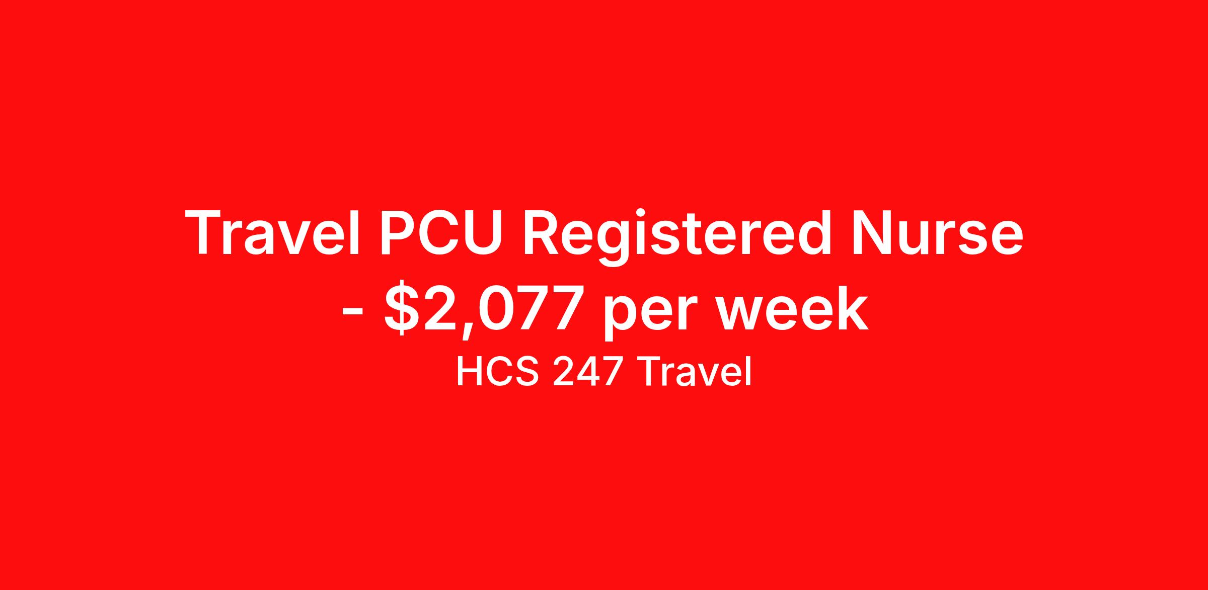 HCS 247 Travel is seeking a travel nurse RN PCU - Progressive Care Unit for a travel nursing job in Winston-Salem, North Carolina. Job Description & Requirements Specialty: PCU - Progressive Care Unit Discipline: RN Start Date: 04/13/2026 Duration: 13 weeks 36 hours per week Shift: 12 hours, nights Employment Type: Travel HCS 247 Travel Job ID 62511544. Pay package is based on 12 hour shifts and 36 hours per week (subject to confirmation) with tax-free stipend amount to be determined. About HCS 247 Travel HCS 24/7 is a national healthcare staffing organization specializing in the placement of Registered Nurses and Allied health professionals across acute care and other clinical settings. We support travel assignments, local short- and long-term contracts, per diem, temp-to-perm, and direct hire opportunities nationwide. Our clinical coverage includes Registered Nurse specialties such as ER, ICU, Med-Surg, Telemetry, Step-Down, OR, PACU, L&D, Mother/Baby, NICU, Cath Lab, Endoscopy, and more along with a full range of allied and imaging professionals, including Respiratory Therapists, Surgical Technicians, X-Ray Techs, CT Techs, MRI Techs, Interventional Radiology (IR) Techs, Cath Lab Techs, Ultrasound/Sonographers, Mammography Techs, and Nuclear Medicine Techs. With competitive compensation and benefits, consistent opportunities, and a clinician-first approach backed by top-rated customer service, HCS 24/7 delivers a seamless experience from initial application through assignment completion. Benefits Holiday Pay Guaranteed Hours Continuing Education Mileage reimbursement Referral bonus Medical benefits Dental benefits Vision benefits License and certification reimbursement Life insurance Benefits start day 1 Weekly pay
