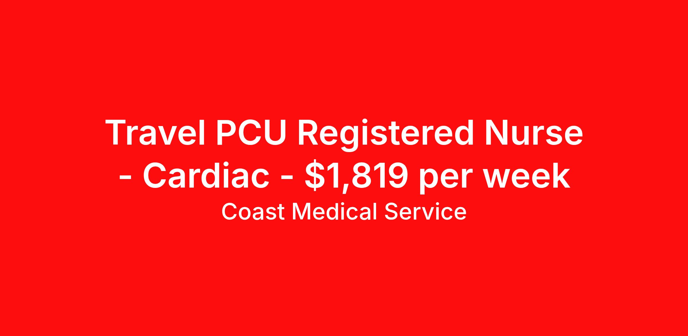 Coast Medical Service is seeking a travel nurse RN Cardiac PCU - Progressive Care Unit for a travel nursing job in Birmingham, Alabama. Job Description & Requirements Specialty: Cardiac PCU - Progressive Care Unit Discipline: RN Start Date: 04/06/2026 Duration: 13 weeks 36 hours per week Shift: 12 hours, nights Employment Type: Travel Coast Medical Service is a nationwide travel nursing & allied healthcare staffing agency dedicated to providing an elite traveler experience for the experienced or first-time traveler. Coast is featured on Blue Pipes' 2023 Best Travel Agencies and named a 2022 Top Rated Healthcare Staffing Firm & 2023 First Half Top Rated Healthcare Staffing Firm by Great Recruiters. Please note that pay rate may differ for locally based candidates. Please apply here or contact a recruiter directly to learn more about this position & the facility, and/or explore others that may be of interest to you. We look forward to speaking with you! Coast Medical Services Job ID 36035215. Pay package is based on 12 hour shifts and 36.0 hours per week (subject to confirmation) with tax-free stipend amount to be determined. Posted job title: RN:Cardiovascular Intensive Care Unit (CVICU),19:00:00-07:30:00