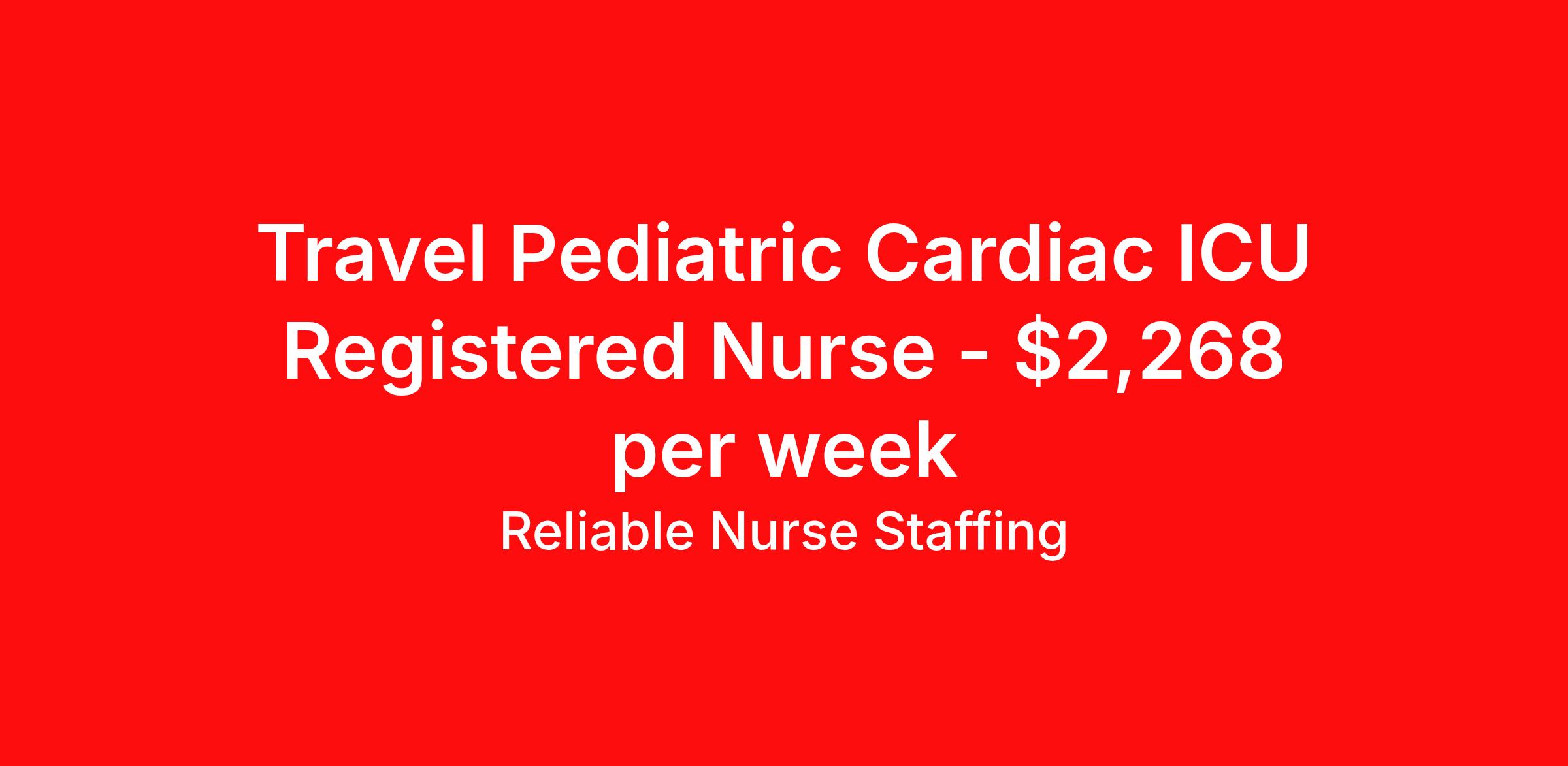 Reliable Nurse Staffing is seeking a travel nurse RN Pediatrics CVICU for a travel nursing job in Charleston, South Carolina. Job Description & Requirements Specialty: Pediatrics CVICU Discipline: RN Start Date: 04/13/2026 Duration: 13 weeks 36 hours per week Shift: 12 hours, nights Employment Type: Travel Reliable Nurse Staffing Job ID 59253808. Pay package is based on 12 hour shifts and 36 hours per week (subject to confirmation) with tax-free stipend amount to be determined. About Reliable Nurse Staffing Providing reliable, competent, and compassionate care to our patients and clients. Benefits Weekly pay Holiday Pay Guaranteed Hours Referral bonus Medical benefits Dental benefits Vision benefits Life insurance