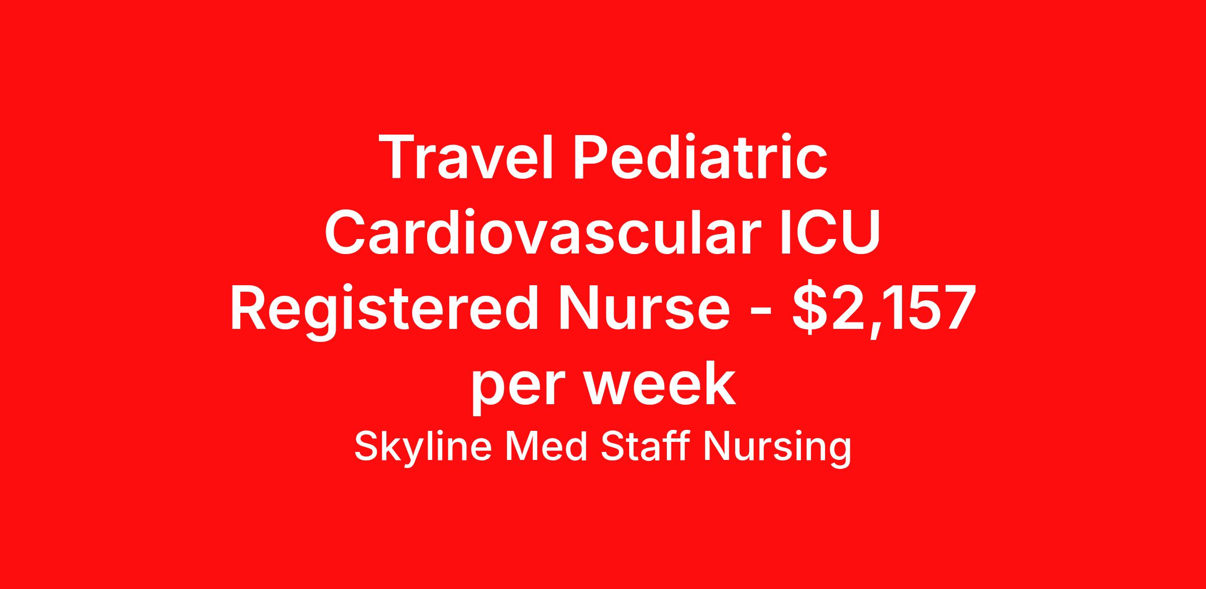 Skyline Med Staff Nursing is seeking a travel nurse RN PICU - Pediatric Intensive Care for a travel nursing job in Indianapolis, Indiana. Job Description & Requirements Specialty: PICU - Pediatric Intensive Care Discipline: RN Start Date: ASAP Duration: 13 weeks 36 hours per week Shift: 12 hours, nights Employment Type: Travel Weekly amount stated in job postings is an estimate based on estimated hourly wage and potential stipends available for the location of the assignment. Pay package is calculated on bill rate at the time job was posted, but can change or vary without notice. Exact pay packages might vary as this is an estimate. Our recruiter would be happy to build an exact pay package for you for each job. Skyline Med Staff Nursing Job ID 36017617. Pay package is based on 12 hour shifts and 36.0 hours per week (subject to confirmation) with tax-free stipend amount to be determined. Posted job title: RN:PICU,19:00:00-07:00:00 About Skyline Med Staff Nursing Join the Top- Rated Travel Healthcare Team! Skyline Med Staff was named as the 1 Best Travel Healthcare Company in 2025 by BluePipes, a recognition driven by glowing reviews from travel healthcare professionals. Our recruiters are consistently praised on Google for their responsiveness, dedication, accessibility, and industry knowledge. Ready to experience the difference? Apply for a job today and see why healthcare professionals choose Skyline! Certified Women Owned Business We believe that travel is good for the soul. We want to be on your journey with you and find the right job that fits you Skyline Med Staff is committed to one vision treating others the way that THEY want to be treated. The executive team at Skyline Med Staff focuses on a commitment to quality, consistency, and the highest level of service. Our team members continually strive to build long term relationships that center on you and helping you achieve your goals. Some of the Benefits you will receive with Skyline Med Staff: Over 30 years of combined experience in the staffing industry Higher Take-Home Pay Rates Dedicated Personal Recruiter We are available to you 24/7 Health Insurance Plan Options Tax Free Per Diems, Housing Stipends and Travel Reimbursements Joint Commission Certified Contracts in all 50 states Referral and Loyalty Bonuses Benefits Medical benefits Referral bonus