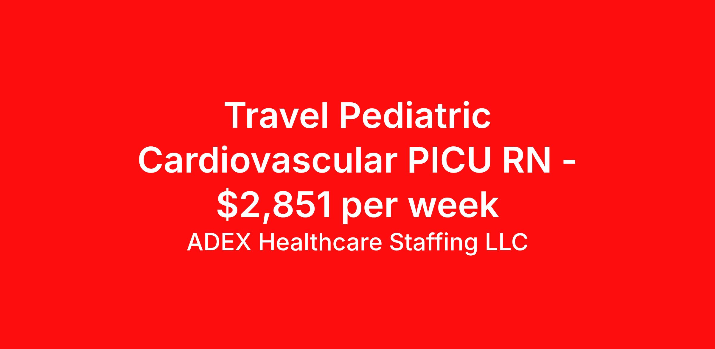 ADEX Healthcare Staffing LLC is seeking a travel nurse RN PICU - Pediatric Intensive Care for a travel nursing job in Kansas City, Missouri. Job Description & Requirements Specialty: PICU - Pediatric Intensive Care Discipline: RN Start Date: 04/06/2026 Duration: 13 weeks 36 hours per week Shift: 12 hours, nights Employment Type: Travel RN Position Job Notes: Travel or Local Registered Nurse needed for ASAP start. A minimum of 2 years of recent hospital bedside experience is required. Candidates must be able to start within 5 weeks. Opportunity for extension upon successful completion of the initial assignment. $750 referral bonus available. Opportunity: RN - PICU Job Details: • Work 12-hour night shifts with 36 hours per week guaranteed • 13-week assignment with ASAP start date • Maintain 1:2 patient ratios for days, nights, and weekends • Must have minimum 1 year of pediatric CICU/CVPICU experience as a traveler • First-time travelers will not be accepted • May float to cardiac medical surgical floor to assist with patients • Float between main facility and sister hospital in Overland Park, KS (approximately 12 miles southwest) • Care for patients with congenital heart defects, cardiomyopathy, arrhythmias, and myo/endocarditis • Work with specialized equipment including CRRT, ECMO, VADs, advanced monitoring lines, and arterial/CVP lines • Must pass medication/dosage test in first week with 100% score (3 attempts given) • Required certifications: BLS, PALS, CCRN (only AHA certifications accepted, no RQI) • Must have both Missouri (or compact) and Kansas state nursing licenses • Dress code allows any kid-friendly colors or patterns • Free parking with permit provided • Self-scheduling system with weekend coverage required • Work in smoke-free facility environment Facility: This renowned children's hospital has been named one of the best children's hospitals in America, operating as a Magnet-designated teaching facility with Level I Trauma Center and Level IV NICU capabilities. The hospital features 390 staffed beds and a 24-bed pediatric cardiac intensive care unit. The facility provides comprehensive interdisciplinary support including IV teams, physical therapy, respiratory services, interpretation services, and rapid response teams, ensuring exceptional care for pediatric patients from neonates through adolescents. Location: Kansas City, MO Kansas City offers a vibrant metropolitan experience with a rich cultural scene, renowned barbecue cuisine, and beautiful fountains throughout the city. The area provides excellent work-life balance with diverse entertainment options, professional sports teams, and a reasonable cost of living compared to other major metropolitan areas. Adex Job ID 3189118. Pay package is based on 12 hour shifts and 36 hours per week (subject to confirmation) with tax-free stipend amount to be determined. About ADEX Healthcare Staffing LLC ADEX has been placing healthcare professionals across the US since 2004. Originally founded in Atlanta, GA, the company's headquarters are now located in Tampa, FL. JCAHO certified since 2009. Benefits Referral bonus
