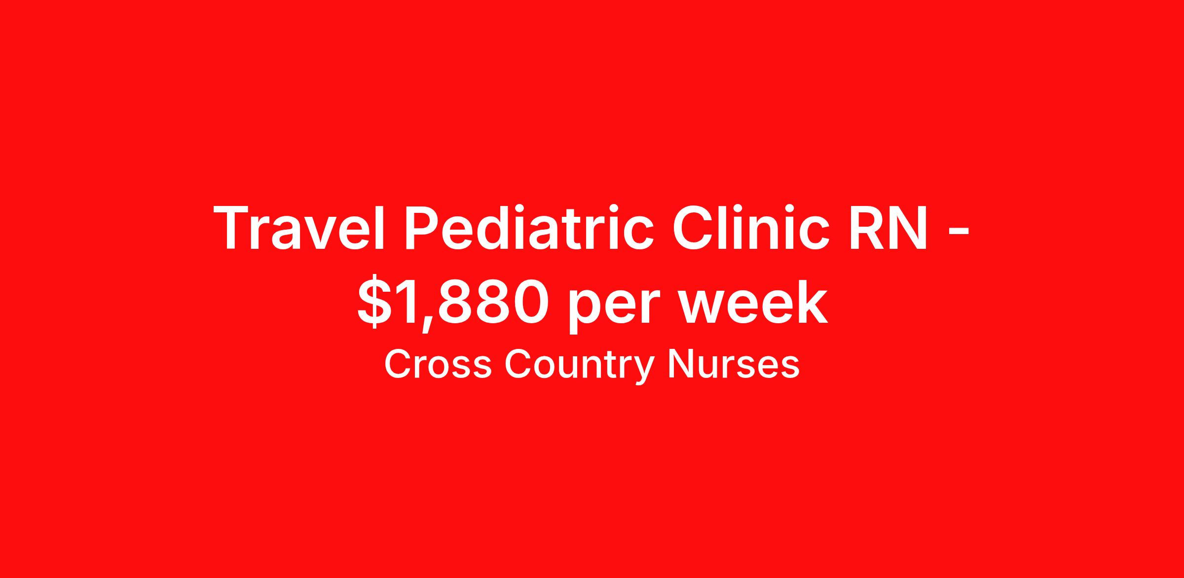 Cross Country Nurses is seeking a travel nurse RN Clinic Pediatrics for a travel nursing job in New Britain, Connecticut. Job Description & Requirements Specialty: Pediatrics Discipline: RN Start Date: 04/06/2026 Duration: 13 weeks 40 hours per week Shift: 8 hours, days Employment Type: Travel Job Description As a pediatric clinic nurse (RN PEDS-C), you will oversee and treat children of all ages faced with illness or injury. You will be responsible for monitoring their health and providing necessary care, possibly including life-saving interventions. This includes assessing their condition, administering medication, changing dressings, monitoring vitals and documenting in patient charts. You'll also provide continued support and education to young patients and families, promoting overall health and ensuring they have the tools to recover and prevent further health issues Minimum Requirements At least 1 year of recent acute care experience in specialty Active RN license Benefits The benefits of taking a travel nursing job with Cross Country include: Private housing or generous housing allowance Comprehensive health insurance with prescription coverage Dependent health insurance with prescription coverage Competitive salaries Referral bonuses Travel reimbursement 401(k) retirement plan Direct deposit/free checking Unlimited free CE credits Cross Country Job ID 1236391. Pay package is based on 8 hour shifts and 40 hours per week (subject to confirmation) with tax-free stipend amount to be determined. Posted job title: Registered Nurse / Pediatric Clinic About Cross Country Nurses You care for others — we’re here to care for you. At Cross Country, we know travel nursing is about more than just the job. It’s about building a career that supports your lifestyle, your values, and your impact. We offer competitive pay, full benefits, and 24/7 support from a team that truly understands what it means to be on the front lines. Wherever your journey takes you, we’re with you every step of the way. Let’s build your best life — one assignment at a time. Benefits 401k retirement plan Referral bonus
