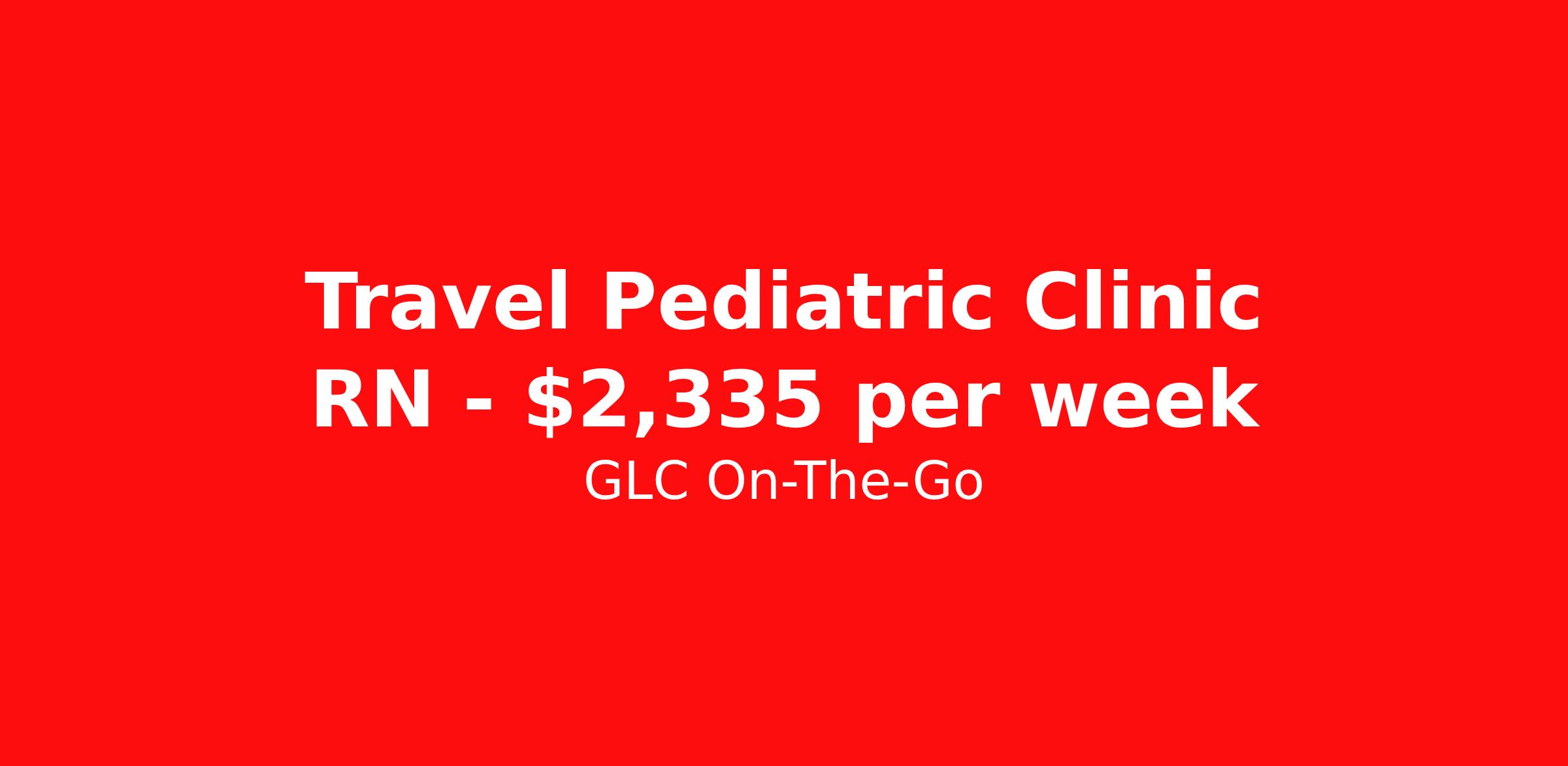 GLC On-The-Go is seeking a travel nurse RN Clinic Pediatrics for a travel nursing job in Glenwood Springs, Colorado. Job Description & Requirements Specialty: Pediatrics Discipline: RN Start Date: 05/05/2026 Duration: 13 weeks 38 hours per week Shift: 12 hours Employment Type: Travel GLC is hiring: RN Pediatric - Glenwood Springs, CO - 13-week contract GLC – Named Best Nurse Agency 2024–2025 We connect nurses, nursing professionals, and allied health professionals like you to contracts that align with your skills, schedule, and career goals. About this Assignment Join the care team in Pediatric where you’ll provide patient-centered care in a collaborative environment. Typical responsibilities include direct patient care, timely documentation, and coordination with the care team. Specific duties will be confirmed during your interview with a recruiter. Assignment Details Location: Glenwood Springs, CO Assignment Length: 13 weeks Start Date: 05/05/2026 End Date: 08/04/2026 Pay Range: $2,102 - $2,335 Minimum Requirements Active license in Pediatric 1 year full-time RN, Pediatric experience within the last 2 years What you can expect from GLC Weekly on-time pay with direct deposit Transparent communication, clear assignment details, and recruiter support from start to finish - or extension Referral bonus up to $500 Health, dental, and vision insurance 401(k) plan Completion and signing bonuses may also be available Ready to move forward? Apply now and start your rewarding journey with GLC - a recruiter will connect quickly to review pay , start date , and assignment details so you can make the best decision for your next contract. GLC On-The-Go Job ID 501692. Pay package is based on 12 hour shifts and 38 hours per week (subject to confirmation) with tax-free stipend amount to be determined. Posted job title: CO-Clinic RN Pediatrics About GLC On-The-Go GLC is more than just a staffing agency – we’re your trusted partner in finding travel, local, and PRN contracts that align with your career aspirations and lifestyle. We specialize in connecting travel nurses and allied healthcare professionals like you with opportunities in acute care, long-term care, behavioral health, and allied fields across the U.S. Our attentive and friendly recruiters are always just a call or text away, ready to guide you at every step, ensuring you feel valued and heard. We understand the unique needs of travel healthcare professionals, which is why we offer comprehensive benefits and 24/7 support. Join GLC, where our 20 years of experience mean we know how to help you find the assignments that turn your career goals into reality. With us, it's not just a placement – it's your dream career made possible