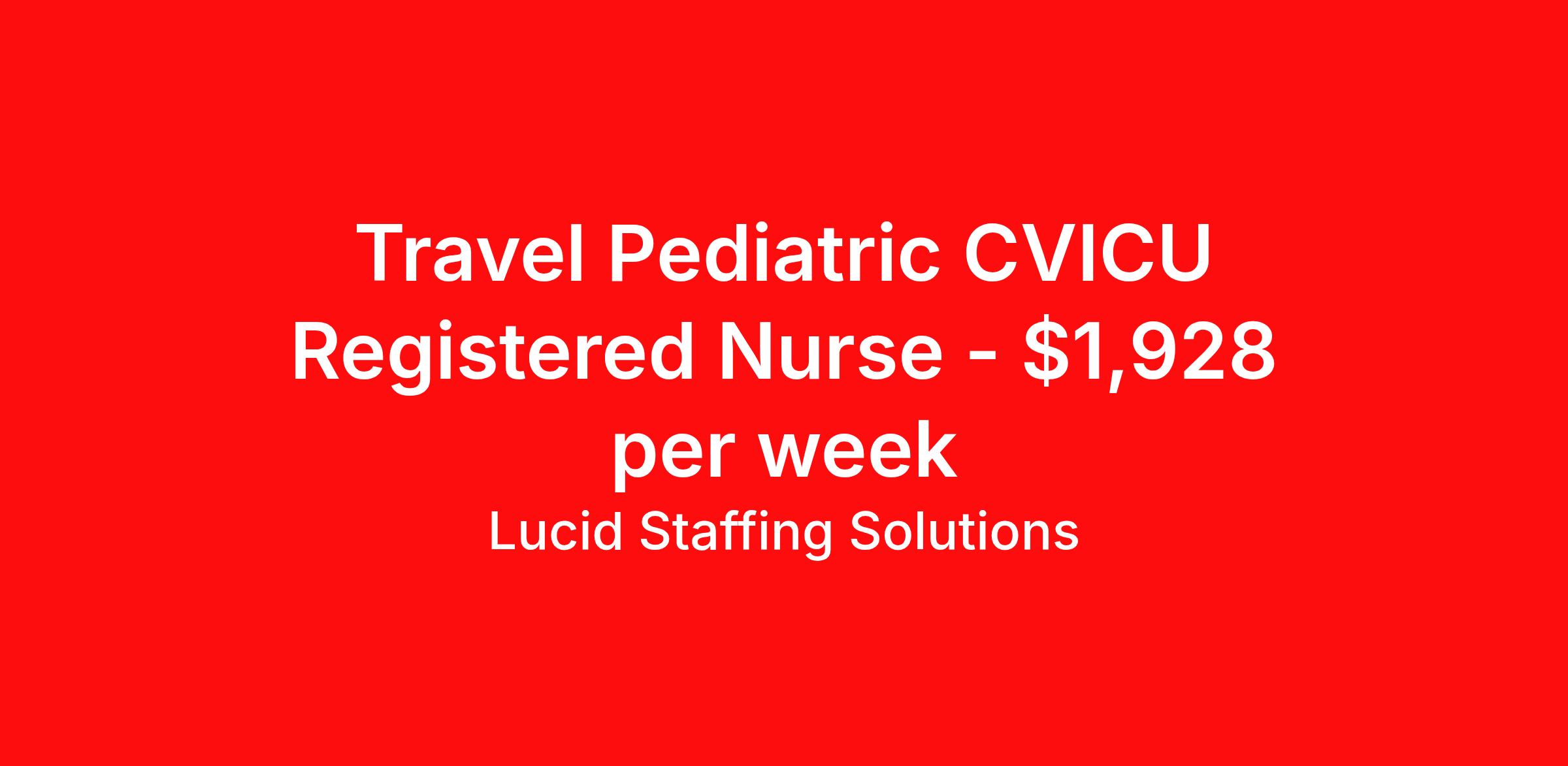 Lucid Staffing Solutions is seeking a travel nurse RN Pediatrics CVICU for a travel nursing job in Indianapolis, Indiana. Job Description & Requirements Specialty: Pediatrics CVICU Discipline: RN Duration: 13 weeks 36 hours per week Shift: 12 hours, nights Employment Type: Travel Job Description Position: Travel Registered Nurse (RN) with experience in PICU Location: Indianapolis, Indiana Shift: hr Night Weekly Gross: $1927.56 Lucid Staffing Solutions was created by former healthcare workers who lived the short staffing, the chaotic workflows, and the nonstop pressure that comes with patient care. We built an agency powered by real clinical experience, kept simple and supportive, so you never have to guess whether the people guiding you actually know what they’re talking about. Minimum Requirements: Active license as a Registered Nurse (RN) Licensed in Indiana (If applicable) or compact eligible Two years of recent PICU experience Active BLS Why Lucid Works for Travelers Paid Weekly: Stipends pushed to GSA limits whenever possible $500 Travel Reimbursement: Paid at the start of each assignment Clinician-Led Team: Recruiters and Account Managers with real clinical experience In-House Compliance: fast updates, real communication, and none of the delays that come with outsourced vendors. Health Coverage Options: Multiple medical plans plus dental, vision, and workers compensation 401(k) Match: 4 percent match after 6 months License & Certification Reimbursement: We help cover the cost of staying compliant Liability Insurance: Included automatically Referral Bonuses: $500 per referral, $750 after five referrals Ready to start your journey? Apply today to connect with a Clinician-Recruiter! Lucid Staffing Solutions Job ID 36697. Pay package is based on 12 hour shifts and 36 hours per week (subject to confirmation) with tax-free stipend amount to be determined. Posted job title: PICU About Lucid Staffing Solutions Clinician Owned & Operated At Lucid Staffing Solutions, we do things differently—because we’ve been in your shoes. Founded by actual healthcare professionals, Lucid was built to fix the issues we experienced as travelers. We know what makes a great assignment: competitive pay, seamless onboarding, honest recruiters, and most importantly—working with a team that truly sees and supports you. Our entire team is made up of former clinicians who understand the demands of the job and what travelers truly need to succeed. We offer some of the highest paying allied health and nursing contracts across the country, along with some amazing benefits & perks. Whether you're chasing freedom, flexible schedules, bigger paychecks, or your next adventure, Lucid helps you get there—with real support, real respect , and real healthcare experts. Benefits Dental benefits Medical benefits Vision benefits