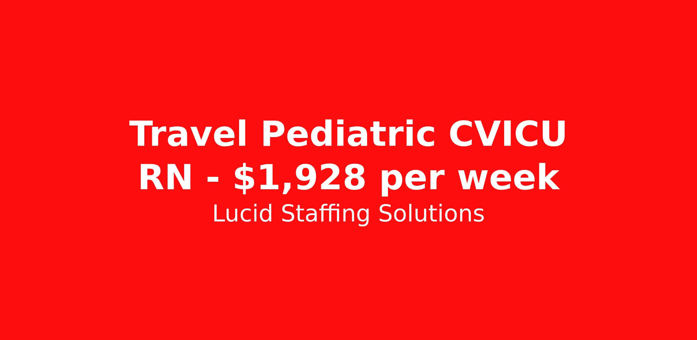 Lucid Staffing Solutions is seeking a travel nurse RN Pediatrics CVICU for a travel nursing job in Austin, Texas. Job Description & Requirements Specialty: Pediatrics CVICU Discipline: RN Duration: 13 weeks 36 hours per week Shift: 12 hours, nights Employment Type: Travel Job Description Position: Travel Registered Nurse (RN) with experience in ICU Location: Austin, Texas Shift: hr Night Weekly Gross: $1927.56 Lucid Staffing Solutions was created by former healthcare workers who lived the short staffing, the chaotic workflows, and the nonstop pressure that comes with patient care. We built an agency powered by real clinical experience, kept simple and supportive, so you never have to guess whether the people guiding you actually know what they’re talking about. Minimum Requirements: Active license as a Registered Nurse (RN) Licensed in Texas (If applicable) or compact eligible Two years of recent ICU experience Active BLS Why Lucid Works for Travelers Paid Weekly: Stipends pushed to GSA limits whenever possible $500 Travel Reimbursement: Paid at the start of each assignment Clinician-Led Team: Recruiters and Account Managers with real clinical experience In-House Compliance: fast updates, real communication, and none of the delays that come with outsourced vendors. Health Coverage Options: Multiple medical plans plus dental, vision, and workers compensation 401(k) Match: 4 percent match after 6 months License & Certification Reimbursement: We help cover the cost of staying compliant Liability Insurance: Included automatically Referral Bonuses: $500 per referral, $750 after five referrals Ready to start your journey? Apply today to connect with a Clinician-Recruiter! Lucid Staffing Solutions Job ID 37958. Pay package is based on 12 hour shifts and 36 hours per week (subject to confirmation) with tax-free stipend amount to be determined. Posted job title: ICU About Lucid Staffing Solutions Clinician Owned & Operated At Lucid Staffing Solutions, we do things differently—because we’ve been in your shoes. Founded by actual healthcare professionals, Lucid was built to fix the issues we experienced as travelers. We know what makes a great assignment: competitive pay, seamless onboarding, honest recruiters, and most importantly—working with a team that truly sees and supports you. Our entire team is made up of former clinicians who understand the demands of the job and what travelers truly need to succeed. We offer some of the highest paying allied health and nursing contracts across the country, along with some amazing benefits & perks. Whether you're chasing freedom, flexible schedules, bigger paychecks, or your next adventure, Lucid helps you get there—with real support, real respect , and real healthcare experts. Benefits Dental benefits Medical benefits Vision benefits