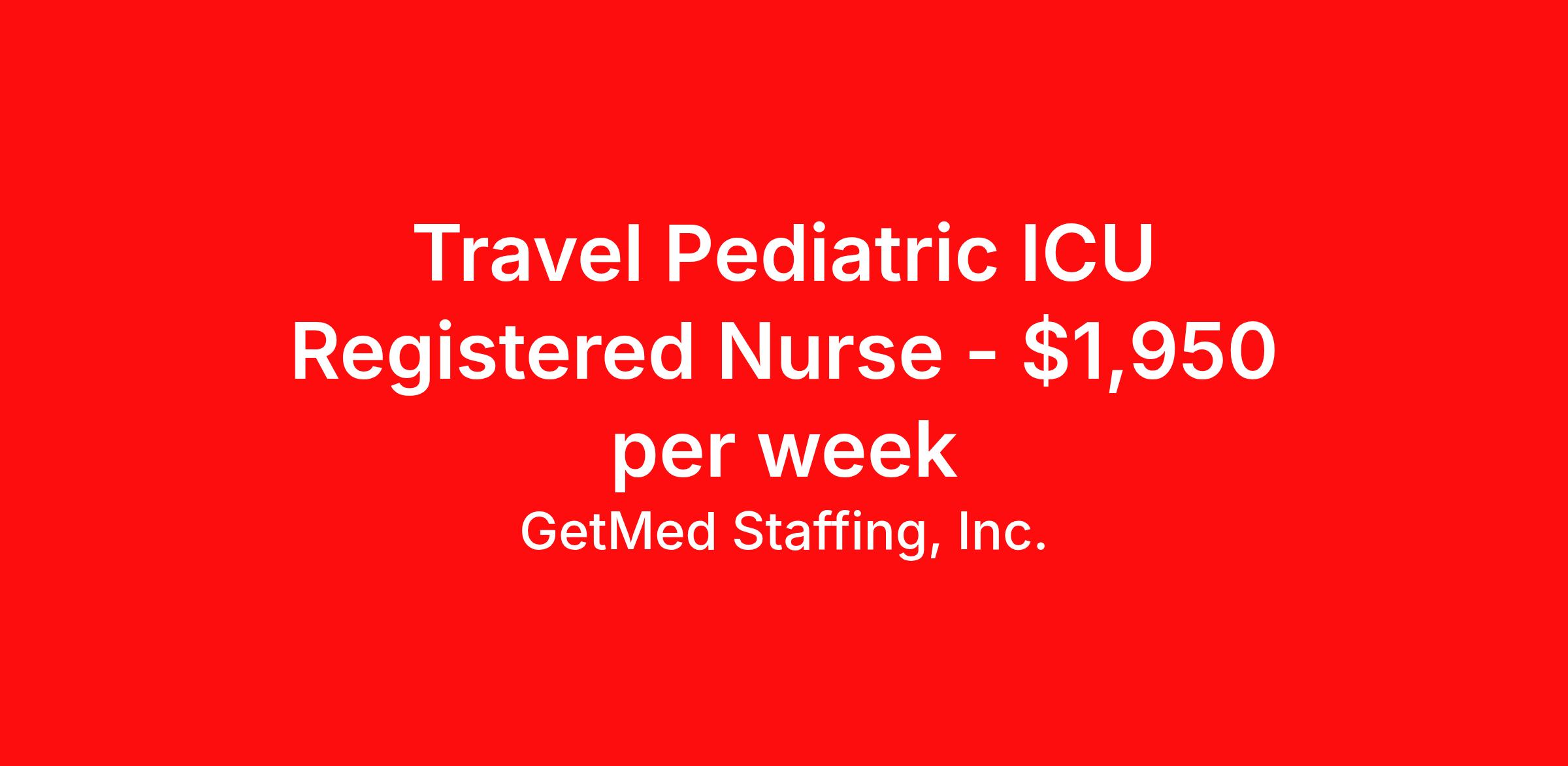GetMed Staffing, Inc. is seeking a travel nurse RN PICU - Pediatric Intensive Care for a travel nursing job in Asheville, North Carolina. Job Description & Requirements Specialty: PICU - Pediatric Intensive Care Discipline: RN Start Date: 03/30/2026 Duration: 13 weeks 36 hours per week Shift: 12 hours, nights Employment Type: Travel GetMed Staffing is searching for a strong PICU RN to assist our traveler-friendly client. A minimum of 1-2 years of experience is required. Traveling with GetMed Staffing offers the unique opportunity to gain diverse experiences, both personally and professionally. Gain experience that matters. GetMed Staffing, Inc. Job ID 35813628. Pay package is based on 12 hour shifts and 36.0 hours per week (subject to confirmation) with tax-free stipend amount to be determined. Posted job title: RN:PICU,19:00:00-07:00:00 About GetMed Staffing, Inc. We are a diversity owned company, specializing in healthcare recruiting services. We truly understand how important a healthcare travelers' relationship is with their recruiter, as well as our relationship is with our healthcare facilities. We recognize that the needs of our healthcare travelers can vary, and therefore we provide the personalized touch necessary to ensure a successful travel assignment each and every time. Our healthcare facilities and clients benefit from us putting our healthcare travelers first. GetMed Staffing is excited to be a leader within the industry by focusing on providing healthcare travelers with more choices and possibilities as they plan for their next healthcare travel assignment. Benefits Life insurance Medical benefits Dental benefits Vision benefits 401k retirement plan