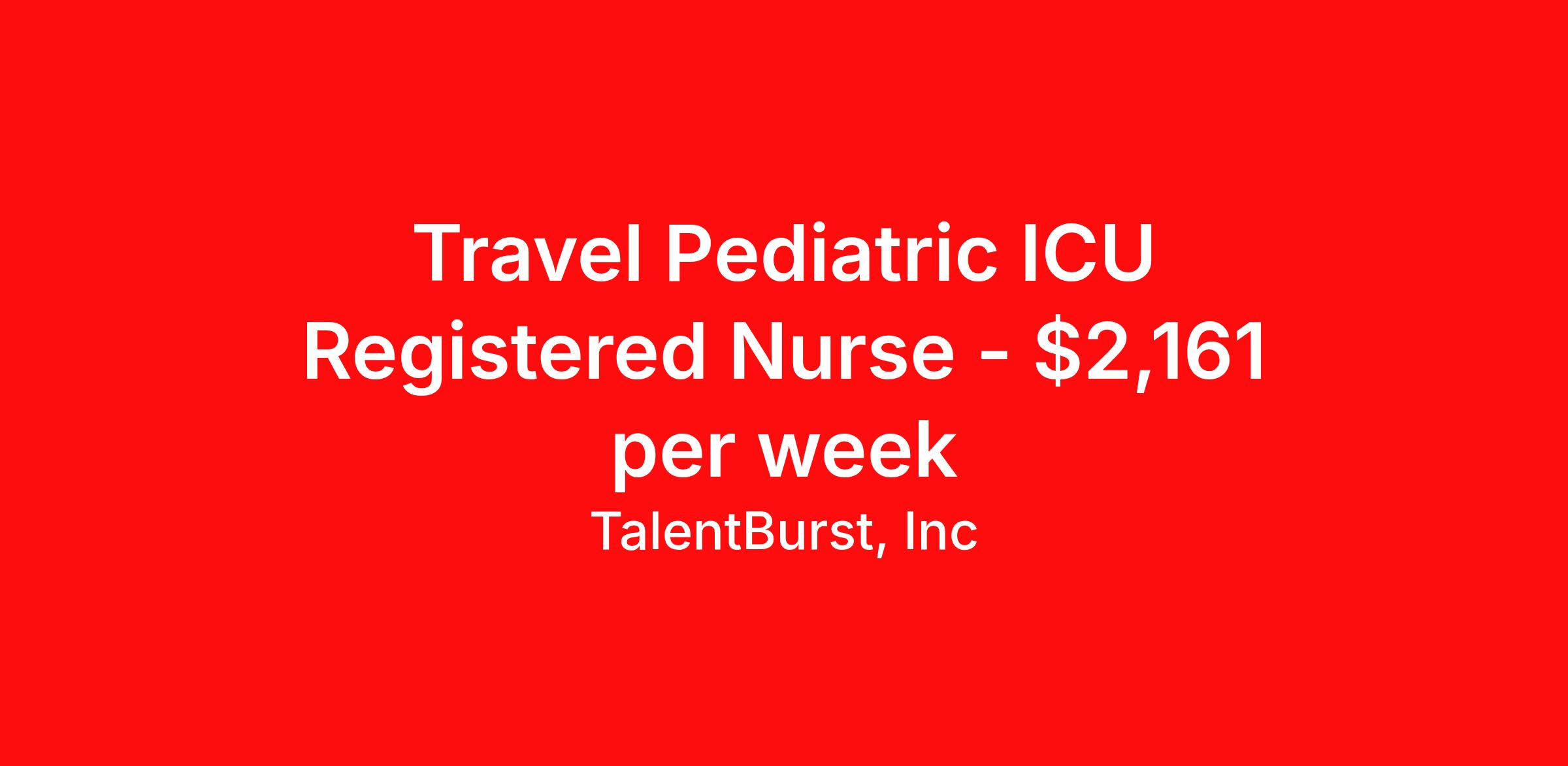 TalentBurst, Inc is seeking a travel nurse RN PICU - Pediatric Intensive Care for a travel nursing job in San Antonio, Texas. Job Description & Requirements Specialty: PICU - Pediatric Intensive Care Discipline: RN Start Date: 04/13/2026 Duration: 12 weeks 36 hours per week Shift: 12 hours, nights Employment Type: Travel Position Overview Role: Registered Nurse – Pediatric Intensive Care Unit (PICU) Location: San Antonio, TX Facility: CHRISTUS Health system (likely a CHRISTUS hospital) Contract Length: 13 weeks Shift: Night Shift – 7:00 PM to 7:00 AM Required Clinical Experience You must have: PICU (Pediatric Intensive Care Unit) experience Ventilator management experience in pediatric patients Preferred: Experience working recently in a pediatric setting At least 1 year in the specialty Education Requirements Preferred: Bachelor of Science in Nursing (BSN) Minimum: RN qualification meeting state requirements. Required Certifications (All must be from the American Heart Association ) BLS – Basic Life Support ACLS – Advanced Cardiovascular Life Support PALS – Pediatric Advanced Life Support License Requirement You must have: Texas RN License OR Compact Nursing License (NLC) valid in Texas TB_RN ZRHC Talent Burst Job ID 26-05567. Pay package is based on 12 hour shifts and 36 hours per week (subject to confirmation) with tax-free stipend amount to be determined. Posted job title: Travel: RN - PICU About TalentBurst, Inc TalentBurst Health & Life Sciences is an established provider of healthcare workforce solutions, servicing healthcare facilities across the United States for over 15 years. As a Joint Commission Certified Agency, our commitment to quality, integrity, and exceptional service has made us a trusted name in the healthcare staffing landscape. Our mission is to bridge the gap between healthcare professionals seeking fulfilling opportunities and healthcare organizations striving to maintain their high standards of care. We are committed to providing top-notch healthcare professionals with access to facilities where they can focus on delivering exceptional patient care and thrive. Whether you're a nurse, allied health professional, or administrative personnel, we have the expertise to match your skills and aspirations with the perfect placement.