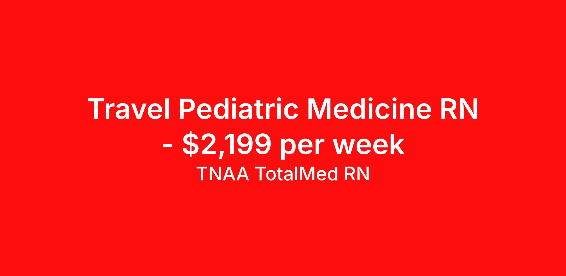 TNAA TotalMed RN is seeking a travel nurse RN Pediatric Med Surg for a travel nursing job in Oklahoma, Oklahoma. Job Description & Requirements Specialty: Pediatric Med Surg Discipline: RN Duration: 13 weeks 36 hours per week Shift: 12 hours, nights Employment Type: Travel We're looking for Pediatric RNs for an immediate travel nurse opening in Oklahoma, OK. The right RN should have 1-2 years' recent acute care experience. Read below for more requirements. As a Pediatric Travel Nurse, you will provide preventative and acute care to children and adolescents in all settings. Pediatric RNs should have experience and skill caring for patients of all ages and providing support to patients' family members. As a PED Travel Nurse, you should be prepared to perform the following tasks: Provide age-appropriate care to patients. Help patients to be comfortable with examination and procedures. Perform physical, medical and diagnostic tests. Assess for critical signs and symptoms in the pediatric and adolescent patient populations. Assist treating physician during examination, treatment and procedures. Provide information, education and support to patients' family members. PED Travel Nurses should be able to stand and walk for long periods of time, as well as bend, lean and stoop without difficulty. RNs should be able to easily lift 20 pounds. Moving or lifting of patients may require lifting of up to 50 pounds at times. Pediatric RNs may face hazards from exposure to chemicals and infectious diseases. Requirements*: BLS, PALS, 1 Year * Additional certifications may be required before beginning an assignment. TotalMed Travel Job ID 1379471. Pay package is based on 12 hour shifts and 36 hours per week (subject to confirmation) with tax-free stipend amount to be determined. Posted job title: Pediatric experience - PED RN - Travel Nurse About TNAA TotalMed RN TotalMed is a Top Ten, travel nursing and healthcare staffing agency with the mission of igniting purpose in healthcare. The organization staffs nurses, therapists, pharmacists, and other clinicians of all specialties in all 50 states. They offer local and travel jobs and match caregivers with the right organization to assist both facilities and patients. As an organization, they focus on putting highly-skilled staff into facilities to ensure adequate staffing for a better patient experience. TotalMed specializes in recruiting and placing healthcare professionals in travel, PRN, and permanent positions across the country in Nursing and Allied Health. Throughout 2020, the organization filled roles at even the most short-staffed facilities during the most challenging time in healthcare. By matching the right travel healthcare professional with the right organization, TotalMed continues to offer a lifeline to facilities and their patients. Benefits Weekly pay Guaranteed Hours Continuing Education 401k retirement plan Sick pay Wellness and fitness programs Referral bonus Employee assistance programs Medical benefits Dental benefits Vision benefits Benefits start day 1