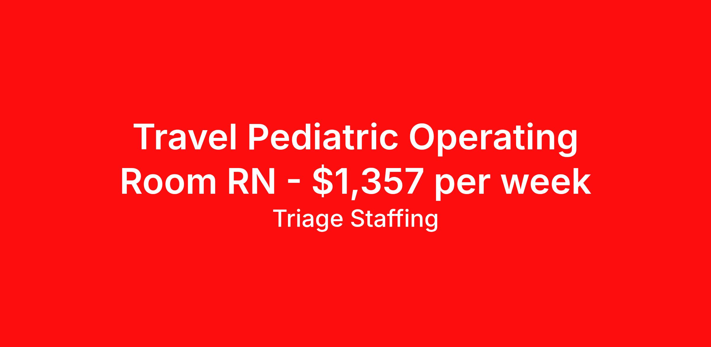 Triage Staffing is seeking a travel nurse RN Pediatrics OR - Operating Room for a travel nursing job in San Francisco, California. Job Description & Requirements Specialty: Pediatrics OR - Operating Room Discipline: RN Start Date: 04/28/2026 Duration: 13 weeks 16 hours per week Shift: 8 hours, days Employment Type: Travel Travel Nursing: Pediatric OR San Francisco Location: San Francisco Start Date: 4/28/2026 Shift Details: 8H Days 20 hours per week Length: 13 WEEKS Apply for specific facility details.PEDS RN Triage Staffing Job ID KE6DD4LC. Posted job title: Nursing: Pediatric OR About Triage Staffing At Triage, we prefer to be real . Real about expectations—both ours and yours. Real about how a decision you make today could affect your tomorrows. Real about how compensation actually works. Real about how great—or grating—your next supervisor may be. Being real allows everyone at Triage to be ready . Ready to serve you with real honesty. So if that gig near the ocean is really no day at the beach, or that third shift comes with a second-class rate, we tell you. So you can be ready, too. We staff all five major divisions of acute care—nursing, lab, radiology, cardiopulmonary and rehab therapy, offering: - Competitive, custom pay packages - One point of contact for both travelers and facilities (per division) - A reliable recruiter who's got your back throughout your entire assignment - In-house compliance and accounting specialists - A clinical liaison team available 24/7 to offer medical and professional support and career development - A mentoring program that is run and managed by actual clinicians—yeah, you read that right - And more (because of course there’s more) Are we the biggest? No. Are we the best? That’s rather subjective, but we’re trying to be. Will we work like hell to get you as close to your idea of heaven as possible? Yes. Yes, we will. Benefits: Day One comprehensive, nationwide insurance plans for health, vision and dental and life—including a HSA option Day One 401(k) program with employer-matching contributions once eligible Facility cancelling protection—your time is money on and off-the-clock Guaranteed hours Weekly paychecks via direct deposit Earned vacation bonuses for time worked Paid holidays Employee assistance program (EAP)—your mental health is important, too Continuing education, certification and licensing reimbursement Workers comp—because accidents happen Top-rated professional liability insurance Company provided housing options Referral bonus—$750 in your pocket after they’ve completed a 13-week assignment