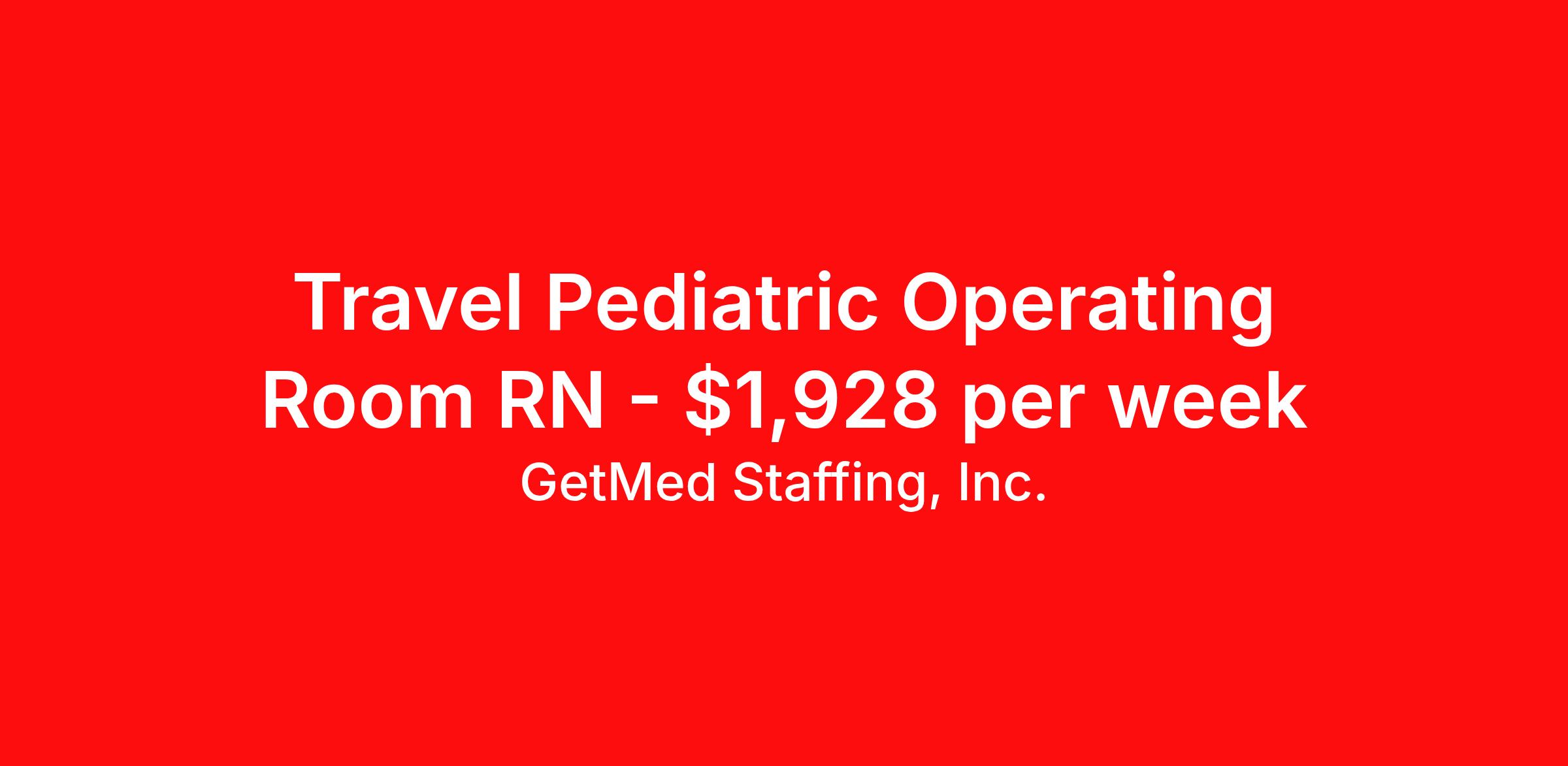 GetMed Staffing, Inc. is seeking a travel nurse RN Pediatrics OR - Operating Room for a travel nursing job in Austin, Texas. Job Description & Requirements Specialty: Pediatrics OR - Operating Room Discipline: RN Start Date: 04/12/2026 Duration: 13 weeks 40 hours per week Shift: 8 hours, nights Employment Type: Travel GetMed Staffing is searching for a strong Pediatric OR RN to assist our traveler-friendly client. A minimum of 1-2 years of experience is required. Traveling with GetMed Staffing offers the unique opportunity to gain diverse experiences, both personally and professionally. Gain experience that matters. GetMed Staffing, Inc. Job ID 35868101. Pay package is based on 8 hour shifts and 40.0 hours per week (subject to confirmation) with tax-free stipend amount to be determined. Posted job title: RN:PEDS-OR,23:00:00-07:00:00 About GetMed Staffing, Inc. We are a diversity owned company, specializing in healthcare recruiting services. We truly understand how important a healthcare travelers' relationship is with their recruiter, as well as our relationship is with our healthcare facilities. We recognize that the needs of our healthcare travelers can vary, and therefore we provide the personalized touch necessary to ensure a successful travel assignment each and every time. Our healthcare facilities and clients benefit from us putting our healthcare travelers first. GetMed Staffing is excited to be a leader within the industry by focusing on providing healthcare travelers with more choices and possibilities as they plan for their next healthcare travel assignment. Benefits Life insurance Medical benefits Dental benefits Vision benefits 401k retirement plan