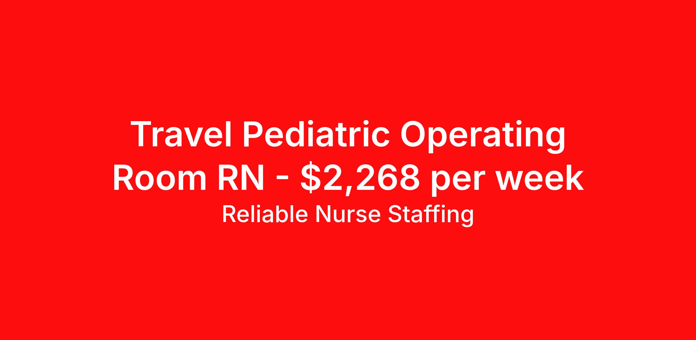 Reliable Nurse Staffing is seeking a travel nurse RN Pediatrics OR - Operating Room for a travel nursing job in Austin, Texas. Job Description & Requirements Specialty: Pediatrics OR - Operating Room Discipline: RN Start Date: 04/12/2026 Duration: 12 weeks 40 hours per week Shift: 8 hours, nights Employment Type: Travel Reliable Nurse Staffing Job ID 59726461. Pay package is based on 8 hour shifts and 40 hours per week (subject to confirmation) with tax-free stipend amount to be determined. About Reliable Nurse Staffing Providing reliable, competent, and compassionate care to our patients and clients. Benefits Weekly pay Holiday Pay Guaranteed Hours Referral bonus Medical benefits Dental benefits Vision benefits Life insurance