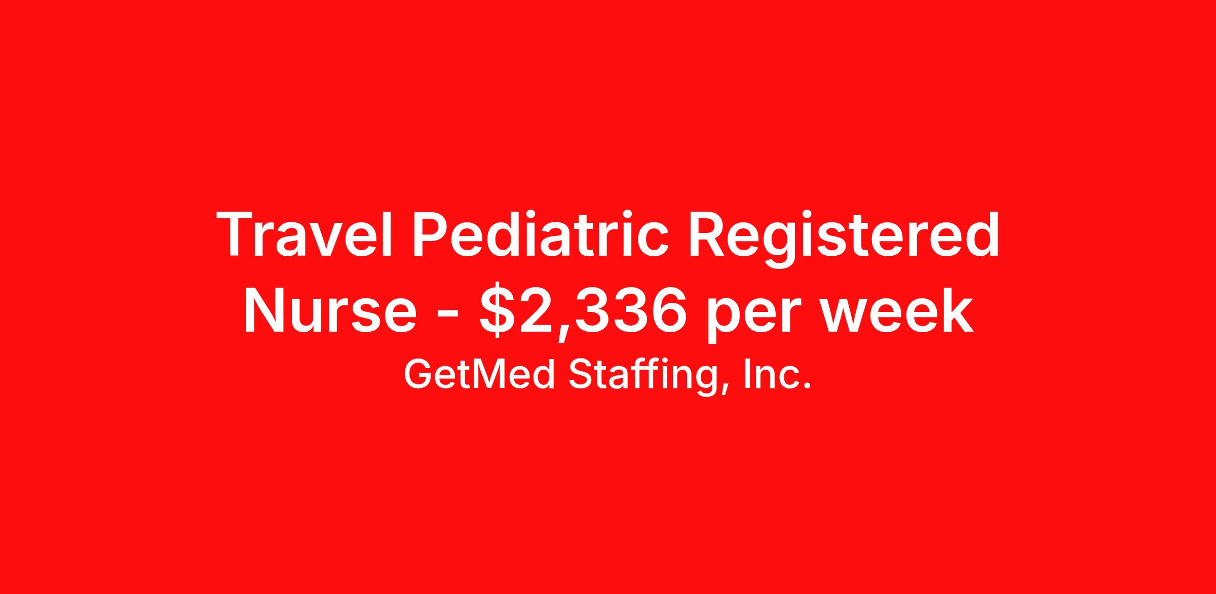 GetMed Staffing, Inc. is seeking a travel nurse RN Pediatric Med Surg for a travel nursing job in Bakersfield, California. Job Description & Requirements Specialty: Pediatric Med Surg Discipline: RN Start Date: 04/20/2026 Duration: 13 weeks 36 hours per week Shift: 12 hours, days Employment Type: Travel GetMed Staffing is searching for a strong Pediatric RN to assist our traveler-friendly client. A minimum of 1-2 years of experience is required. Traveling with GetMed Staffing offers the unique opportunity to gain diverse experiences, both personally and professionally. Gain experience that matters. GetMed Staffing, Inc. Job ID 36203866. Pay package is based on 12 hour shifts and 36.0 hours per week (subject to confirmation) with tax-free stipend amount to be determined. Posted job title: RN:PEDS,07:00:00-19:00:00 About GetMed Staffing, Inc. We are a diversity owned company, specializing in healthcare recruiting services. We truly understand how important a healthcare travelers' relationship is with their recruiter, as well as our relationship is with our healthcare facilities. We recognize that the needs of our healthcare travelers can vary, and therefore we provide the personalized touch necessary to ensure a successful travel assignment each and every time. Our healthcare facilities and clients benefit from us putting our healthcare travelers first. GetMed Staffing is excited to be a leader within the industry by focusing on providing healthcare travelers with more choices and possibilities as they plan for their next healthcare travel assignment. Benefits Life insurance Medical benefits Dental benefits Vision benefits 401k retirement plan