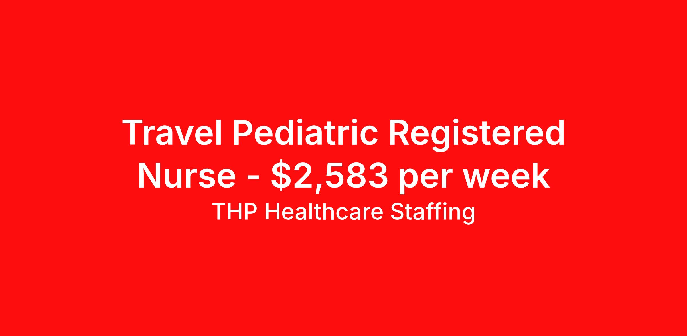 THP Healthcare Staffing is seeking a travel nurse RN Pediatrics for a travel nursing job in Pittsfield, Massachusetts. Job Description & Requirements Specialty: Pediatrics Discipline: RN Start Date: 04/13/2026 Duration: 13 weeks 36 hours per week Shift: 12 hours, days Employment Type: Travel Our Client is currently seeking RN - Pediatrics positions in Pittsfield, MA for a 3x12 Days shift. You must have current State Licensure and at least 1 year of recent experience. Requirements Current Resume State Licensure Current BLS and/or ACLS and/or Specialty Certifications 2 Current Clinical References Physical (Within 12 Months) TB Skin Test (Within 12 Months) Titers - MMR/Hep B/Varicella Respiratory Fit Test (Within 12 Months) Current - Tdap/Flu Vaccinations Must be able to pass pre-employment, background and urine drug screening Compensation and Benefits Compettive Pay Packages Health Benefit Package Travel pay - 1st pay check Extending Contract Bonus Refer a friend and earn extra cash! At THP Healthcare Staffing, we take care of you - work with us, not for us! THP Healthcare Staffing Job ID 17912247. Pay package is based on 12 hour shifts and 36.0 hours per week (subject to confirmation) with tax-free stipend amount to be determined. Posted job title: RN:Pediatrics,07:00:00-19:00:00 About THP Healthcare Staffing At THP Staffing, we specialize in connecting healthcare facilities with highly skilled travel nurses and allied health professionals who bring exceptional care and expertise wherever they go. Our mission is to ensure that every healthcare provider has access to top nursing talent, regardless of location, to deliver superior patient outcomes. Benefits Weekly pay Life insurance Pet insurance License and certification reimbursement Medical benefits Employee assistance programs Referral bonus Vision benefits Holiday Pay Health savings account