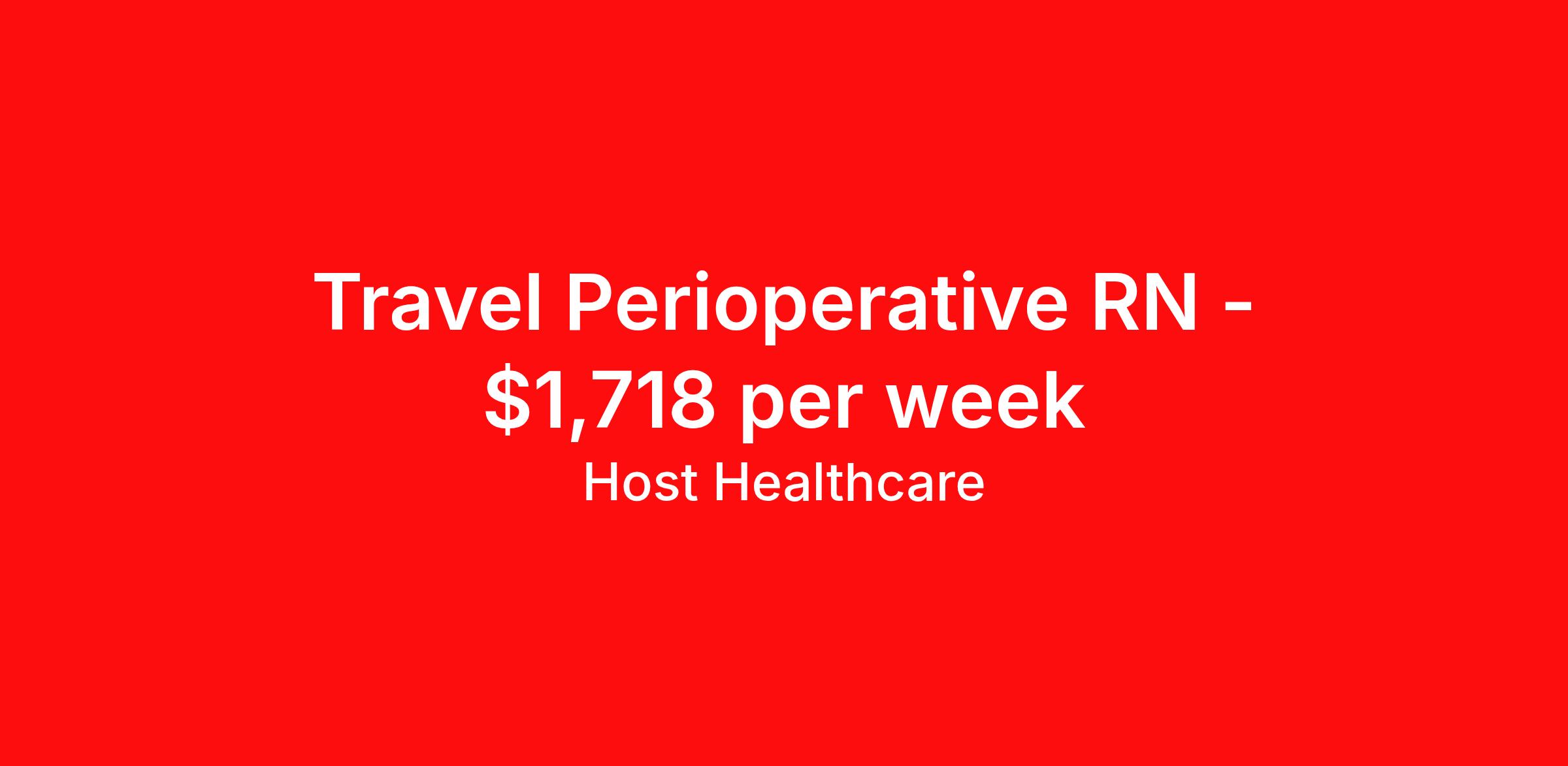 Host Healthcare is seeking a travel nurse RN Perioperative for a travel nursing job in Canton, Georgia. Job Description & Requirements Specialty: Perioperative Discipline: RN Start Date: 04/13/2026 Duration: 13 weeks 40 hours per week Shift: 8 hours, days Employment Type: Travel Host Healthcare Job ID a1fVX000002tuwTYAQ. Pay package is based on 8 hour shifts and 40 hours per week (subject to confirmation) with tax-free stipend amount to be determined. Posted job title: RN - Allied About Host Healthcare At Host Healthcare, we provide a truly comfortable experience as you explore your travel nursing, therapy, or allied career. We make your travel healthcare journey easy by taking care of all the details, so you don’t have to. We are on a mission to help others live better and we do this by helping the healers of the world be as comfortable as possible. With access to tens of thousands of travel nursing, therapy, and allied jobs in all 50 states, our responsive and friendly recruiters find your dream position based on what’s important to you. During your assignment, get access to premium benefits, including Day 1 medical that continues up to 30 days between assignments, 401K matching, travel reimbursements, dedicated housing support, and more. We also offer 24/7 support from our team and access to our on-staff clinicians so you can feel comfortable and confident throughout your entire assignment. Travel comfortably with Host Healthcare. Benefits Referral bonus School loan reimbursement Vision benefits Wellness and fitness programs Company provided housing options License and certification reimbursement Life insurance Medical benefits Mileage reimbursement Pet insurance Discount program Employee assistance programs Guaranteed Hours Health savings account Holiday Pay 401k retirement plan Continuing Education Dental benefits