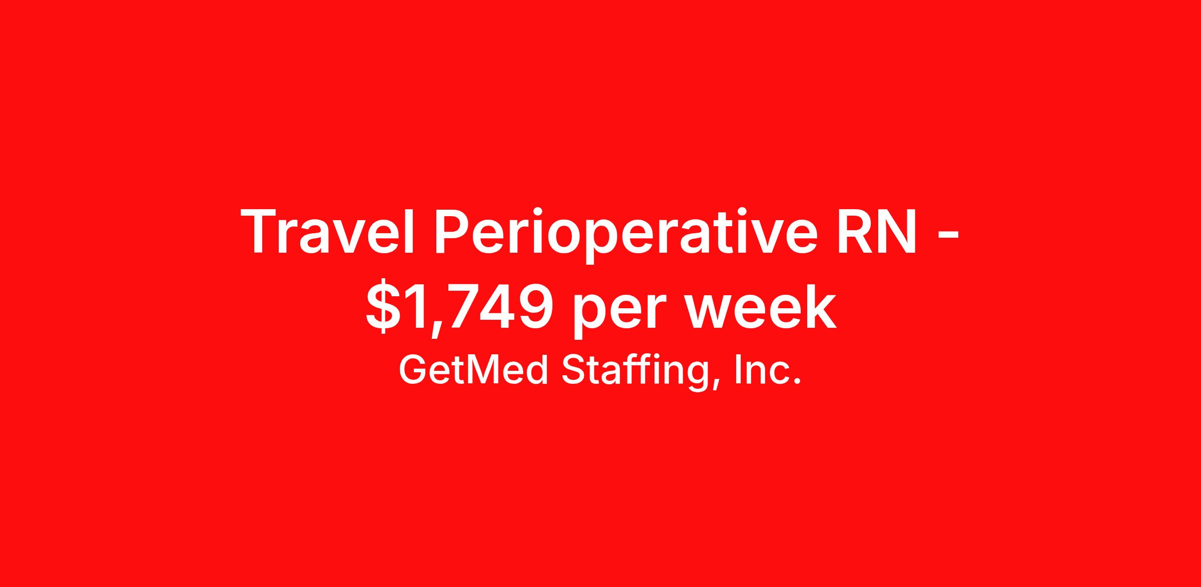 GetMed Staffing, Inc. is seeking a travel nurse RN Perioperative for a travel nursing job in Canton, Georgia. Job Description & Requirements Specialty: Perioperative Discipline: RN Start Date: 04/13/2026 Duration: 13 weeks 40 hours per week Shift: 8 hours, days Employment Type: Travel GetMed Staffing is searching for a strong OR RN to assist our traveler-friendly client. A minimum of 1-2 years of experience is required. Traveling with GetMed Staffing offers the unique opportunity to gain diverse experiences, both personally and professionally. Gain experience that matters. GetMed Staffing, Inc. Job ID 36052647. Pay package is based on 8 hour shifts and 40.0 hours per week (subject to confirmation) with tax-free stipend amount to be determined. Posted job title: RN:OR,07:00:00-15:00:00 About GetMed Staffing, Inc. We are a diversity owned company, specializing in healthcare recruiting services. We truly understand how important a healthcare travelers' relationship is with their recruiter, as well as our relationship is with our healthcare facilities. We recognize that the needs of our healthcare travelers can vary, and therefore we provide the personalized touch necessary to ensure a successful travel assignment each and every time. Our healthcare facilities and clients benefit from us putting our healthcare travelers first. GetMed Staffing is excited to be a leader within the industry by focusing on providing healthcare travelers with more choices and possibilities as they plan for their next healthcare travel assignment. Benefits Life insurance Medical benefits Dental benefits Vision benefits 401k retirement plan