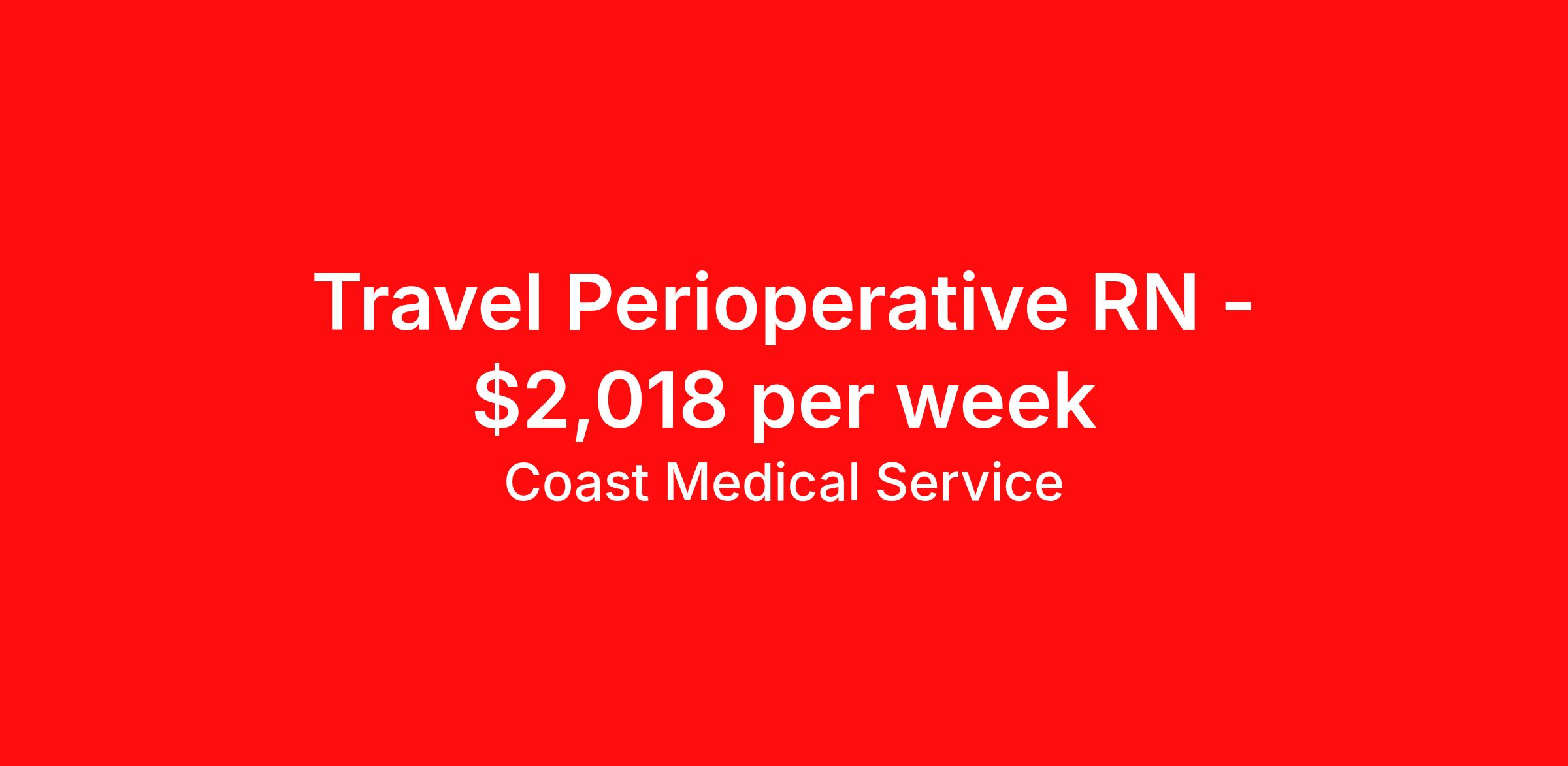 Coast Medical Service is seeking a travel nurse RN Perioperative for a travel nursing job in Canton, Georgia. Job Description & Requirements Specialty: Perioperative Discipline: RN Start Date: 04/13/2026 Duration: 13 weeks 40 hours per week Shift: 8 hours, days Employment Type: Travel Coast Medical Service is a nationwide travel nursing & allied healthcare staffing agency dedicated to providing an elite traveler experience for the experienced or first-time traveler. Coast is featured on Blue Pipes' 2023 Best Travel Agencies and named a 2022 Top Rated Healthcare Staffing Firm & 2023 First Half Top Rated Healthcare Staffing Firm by Great Recruiters. Please note that pay rate may differ for locally based candidates. Please apply here or contact a recruiter directly to learn more about this position & the facility, and/or explore others that may be of interest to you. We look forward to speaking with you! Coast Medical Services Job ID 36052471. Pay package is based on 8 hour shifts and 40.0 hours per week (subject to confirmation) with tax-free stipend amount to be determined. Posted job title: RN:Operating Room,07:00:00-15:30:00