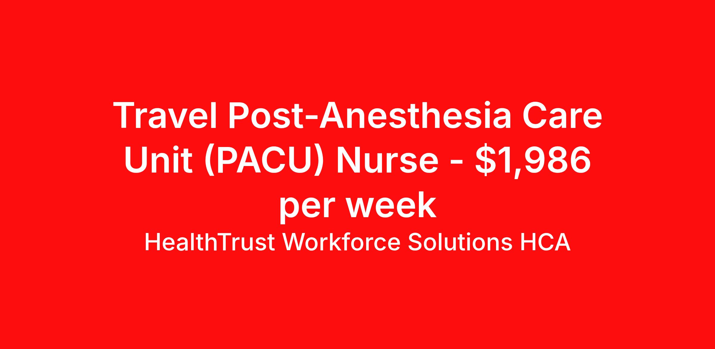 HealthTrust Workforce Solutions HCA is seeking a travel nurse RN PACU - Post Anesthesia Care for a travel nursing job in Chattanooga, Tennessee. Job Description & Requirements Specialty: PACU - Post Anesthesia Care Discipline: RN Duration: 13 weeks 36 hours per week Shift: 12 hours, days Employment Type: Travel Entrust Your Career to HealthTrust! At HealthTrust, we believe that healthcare is not defined by the four walls in which it is practiced; it’s defined by its people. We pride ourselves on crafting opportunities that expand skill sets, broaden career horizons, provide economic stability, and cultivate personal growth. HealthTrust Offers: Competitive Pay Packages Guaranteed hours Weekly direct deposit options 401k with Company Match Earn up to $750 for referrals Free Private Furnished Housing or Tax-Free Subsidy To get started, you will need: RN's a minimum of 1 year in specialty Allied 6 months of experience An adventurous spirit and fierce dedication Degree in corresponding specialty as required Appropriate certifications and licensure as needed for the specific position HealthTrust Benefits: Opportunities for a lifetime: When you become a part of the HCA family, you will have exclusive access to more opportunities than any other healthcare system in the nation. At HWS, we help open the door to a lifetime of lasting career opportunities. A culture of care: Our clinicians have made HWS an industry leader for over 25 years. We are passionate about our mission that, above all else, we are committed to the care and improvement of human life. Career Development: As a wholly owned subsidiary of HCA Healthcare, HWS is a preferred partner to thousands of top-performing hospitals. We provide our healthcare professionals with first-priority access to more than 200,000 jobs nationwide. We are uniquely positioned to offer you exclusive and direct access to HCA Healthcare’s vast network of facilities. Let us open the door to nationwide opportunities that fit your lifestyle! We are an equal opportunity employer and value diversity at our company. We do not discriminate on the basis of race, religion, color, national origin, gender, sexual orientation, age, marital status, veteran status, or disability status. Job Requirements Certifications ACLS (Required) BLS (Required) HealthTrust Workforce Solutions HCA Job ID 980787. Posted job title: Travel Nurse - Post-Anesthesia Care Unit (PACU) About HealthTrust Workforce Solutions HCA At HealthTrust Workforce Solutions, healthcare is not just about the four walls of a facility but about the people who provide and receive care. Our focus is on empowering healthcare professionals to deliver exceptional patient experiences by providing them with the necessary skills, tools, and support. We partner with healthcare facilities nationwide to ensure that the right professionals are in the right roles. We prioritize our clinicians by giving them a voice and access to opportunities to fulfill their mission of improving lives by providing quality patient care. We are committed to our core values of Trust, Innovation, Adaptability, Courage, and Accountability. We are dedicated to positively impacting the healthcare industry by providing first-priority access to more than 200,000 jobs nationwide to our healthcare professionals. Join us and be part of the HealthTrust family, where you can make a difference every day. We embrace our changing environment, and we maintain a culture that has a rich tradition of transforming itself to meet the challenges of the future. MISSION STATEMENT While putting great people in the right roles is essential, our mission is far greater. We want our clinicians to be part of the HealthTrust family, where healthcare professionals have a voice and are empowered with the right tools and opportunities to fulfill their personal mission of improving lives. Plus, as a preferred partner to thousands of top-performing hospitals, we provide our healthcare professionals with first-priority access to more than 200,000 jobs nationwide. Benefits Dental benefits Vision benefits Referral bonus Continuing Education Life insurance