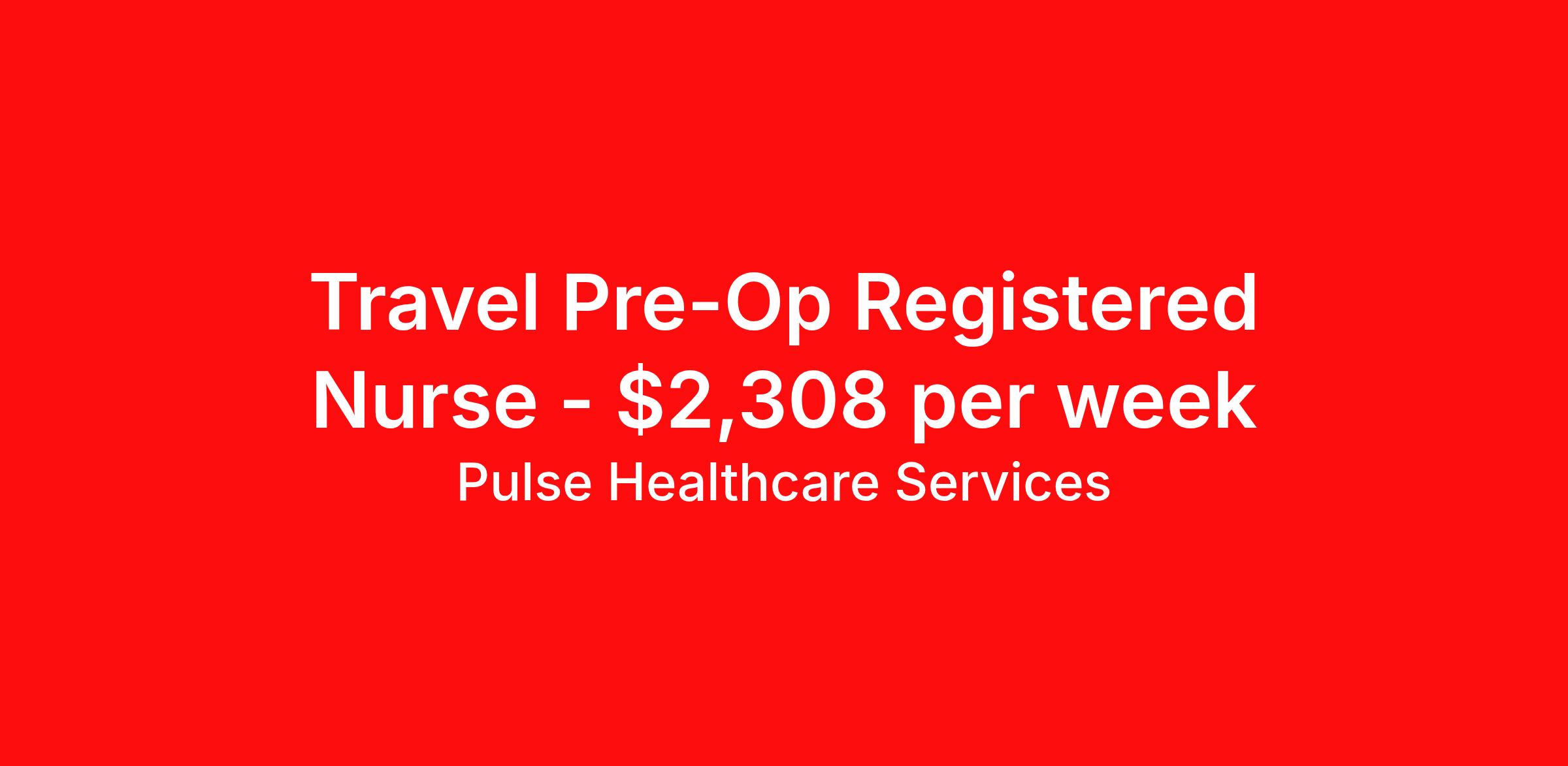 Pulse Healthcare Services is seeking a travel nurse RN PreOp / PACU - Post Anesthesia Care for a travel nursing job in Seattle, Washington. Job Description & Requirements Specialty: PreOp / PACU - Post Anesthesia Care Discipline: RN Start Date: 04/06/2026 Duration: 13 weeks 40 hours per week Shift: 10 hours, days Employment Type: Travel Pulse Healthcare is currently seeking Travel Nurses for multiple positions in locations throughout the United States. Start Date: 04/06/2026 Duration: 91 days City: Seattle State: Washington Degree: RN Specialty: PACU/Pre-Post Op Desired Shift: 4X10 Days, 06:00:00-16:00:00, 10.00-4 Why Travel with Pulse ? Dedicated Recruitment Staff ; Weekly Housing Stipend or Paid Housing; Per Diem Allowance ; Competitive Pay; Weekly Direct Payroll Deposit; Travel and License Reimbursements; 401K Plus Match; Group Health insurance benefits: ; Medical Plan ; Dental Plan ; Vision Plan; Short and Long Term Disability ; AD&D Insurance; Referral Program For more details visit us at www.pulsehealthinc.com or reach out to our recruiters at . Pulse Healthcare Services Job ID 36091210. Pay package is based on 10 hour shifts and 40.0 hours per week (subject to confirmation) with tax-free stipend amount to be determined. Posted job title: RN:PACU/Pre-Post Op,06:00:00-16:00:00 About Pulse Healthcare Services At Pulse Healthcare we pride ourselves in being more than just a recruiting and staffing agency. Pulse has the capability through our extensive network of contracts to place our nurses across different regions and health systems throughout the country. Our goal is to build long lasting relationships and provide our nurses the opportunity to gain professional growth, experience and new adventures. Whether you are in the beginning phases of your travel nursing career or you are a seasoned traveler, Pulse has the ability to provide you with freedom, flexibility and seamless transitions throughout your career. Pulse is able to offer comprehensive benefits that are customized to your needs. We have multiple satellite locations and Personal Career Consultants ready to extend efforts coast to coast to find the career opportunity that matches your personal profile. We treat our travel nurses like family. We are passionate about your success and we will work diligently to prove that to you through our trustworthy relationships, teamwork, full access and top of the line services. Our Mantra Pulse is Q uality, R eliability and S ervice Benefits Medical benefits Weekly pay Holiday Pay License and certification reimbursement