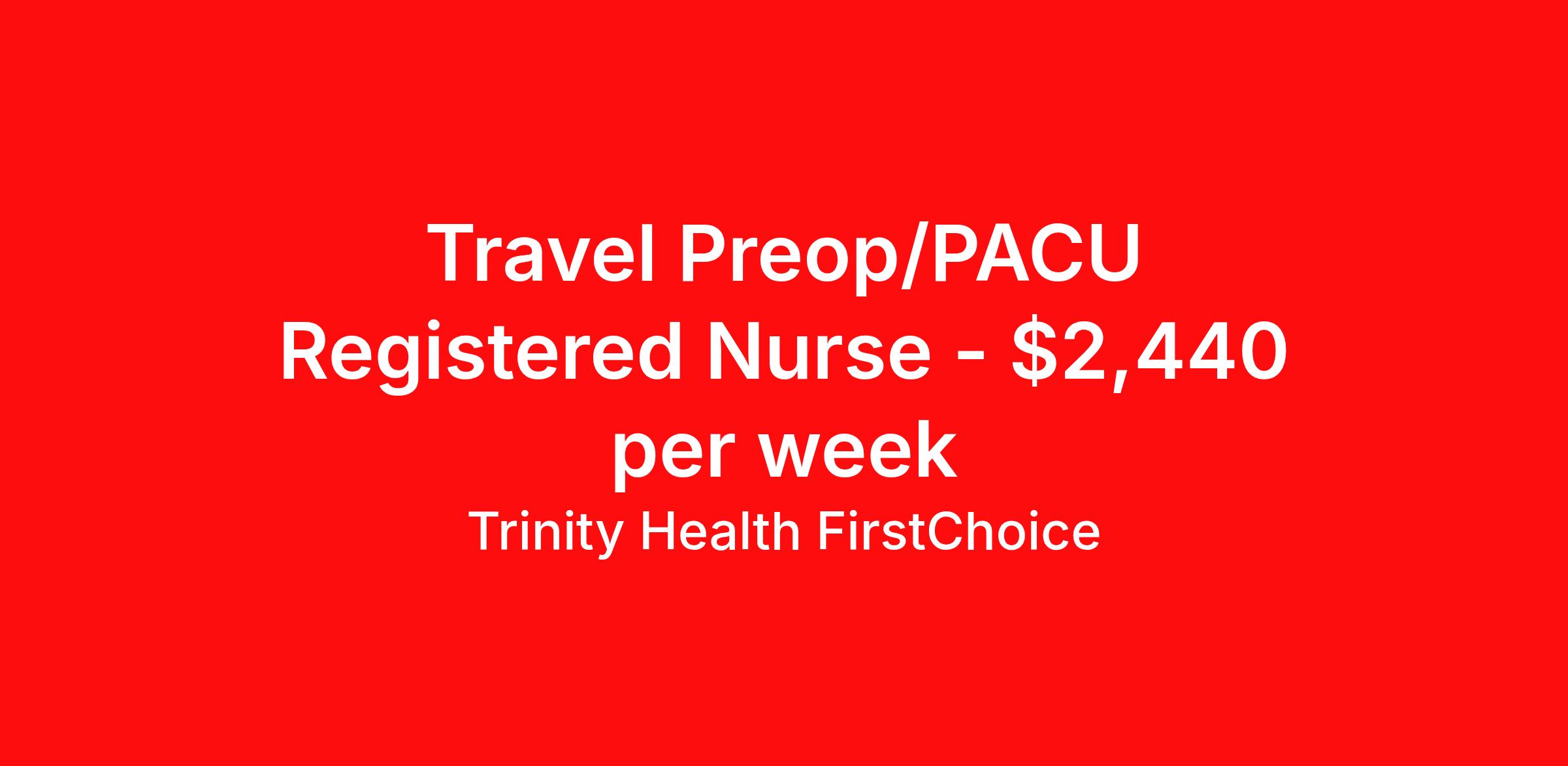 Trinity Health FirstChoice is seeking a travel nurse RN PreOp / PACU - Post Anesthesia Care for a travel nursing job in Ann Arbor, Michigan. Job Description & Requirements Specialty: PreOp / PACU - Post Anesthesia Care Discipline: RN Start Date: ASAP Duration: 13 weeks 40 hours per week Shift: 8 hours, days Employment Type: Travel Employment Type: Part time Shift: Description: Position Purpose: Are you an experienced Registered Nurse looking for premium compensation and maximum flexibility? Explore FirstChoice – Trinity Health's mobile staffing solution! FirstChoice RNs are utilized to fill short and long-term assignments throughout the health system, and we need you to be a part of this innovative program! Nationwide and Regional opportunities available! What you will do: Qualified and willing to float throughout the hospital and/or throughout multiple hospital locations and/or regions Knows, understands, incorporates & demonstrates standard elements of professional practice: Assess, Outcomes Identification / Solutions, Plan, Implement, Evaluate Acts independently & appropriately within license, scope of knowledge & experience in practice area Retains accountability for delegation, choices, decisions & outcomes Collaborates with key stakeholders & contributes to quality & improvement practices & outcomes Exhibits agility & willingness to take on new & additional responsibilities Embraces new ideas & cultural differences while managing competing priorities Minimum Qualifications: Graduation from an accredited school of nursing. Valid RN licensure authorized in the applicable state(s) of practice/employment. Minimum of eighteen (18) months of recent clinical experience for Med Surg, Tele and PCU. Minimum two (2) years of recent clinical experience for all remaining specialties including Critical Care, Surgical Services, Maternal Services, Emergency Department and Behavioral Health. Required to have and maintain the credentials required per their specialty area (ex: ACLS, TNCC, etc). BLS, ACLS and PALS must be obtained through American Heart Association Position Highlights and Benefits: Premium Pay Flexible Scheduling Travel and Per Diem opportunities available Variety of Practice Settings Learning Opportunities DailyPay available Reimbursement of License and Certifications available per assignment Opportunity to participate in 403B program Ministry Information: FirstChoice offers rewarding Nursing, Respiratory Therapist, Surgical Technologist, and Health Care Professional travel positions with a flexible schedule to fit your life. FirstChoice travel Health Care Professionals fill critical positions when unforeseen or unplanned circumstances occur; or, when there is a position open due to an extended leave-of-absence. You’ll get to experience a variety of practice settings while traveling within your local region or traveling nationally – your choice! If applicable-enter in state specific pay transparency information. Job Details: Location: Trinity Health Ann Arbor Start Date: ASAP Weeks: 13 Hours: 5x8 Shift: Day Gross Weekly Rate: $2440.00 Our Commitment Rooted in our Mission and Core Values, we honor the dignity of every person and recognize the unique perspectives, experiences, and talents each colleague brings. By finding common ground and embracing our differences, we grow stronger together and deliver more compassionate, person-centered care. We are an Equal Opportunity Employer. All qualified applicants will receive consideration for employment without regard to race, color, religion, sex, sexual orientation, gender identity, national origin, disability, veteran status, or any other status protected by federal, state, or local law. Trinity Health FirstChoice Job ID 00646378. Pay package is based on 8 hour shifts and 40 hours per week (subject to confirmation) with tax-free stipend amount to be determined. Posted job title: Travel Registered Nurse, RN, Preop/PACU About Trinity Health FirstChoice Premium pay FirstChoice offers a rewarding career with significant p remium pay and flexible scheduling to fit your life. FirstChoice h ealthcare travel professionals fill critical positions when unforeseen or unplanned circumstances occur; or, when there is a position open due to an extended leave-of-absence. You’ll get to experience a variety of practice settings while traveling within your local region or traveling nationally – your choice! Healthcare travel professionals, join us in caring for our community, we can't do it without you. FirstChoice exclusively supports facilities within the Trinity Health system meaning you will have a consistent experience between job sites. Your training at one site will apply to other sites within the region and will minimize the time you are spending outside of patient care. We understand that there has been a fundamental shift in the nursing position in recent years and like any other employee, nurses want more options and flexibility in their careers. FirstChoice provides you with both along with the comfort and security of one employer. Benefits of Being a FirstChoice healthcare travel professional: Premium pay Choose your own travel adventure—work in a variety of practice settings Wide range of assignments available Housing and meal stipend Minimum Qualifications/Requirements of a FirstChoice Nurse: Registered nurse with a license in the state(s) you will work Minimum of 2 years, depending on specialty area Cannot hold a concurrent position at a Trinity Health facility Trinity Health is a leading not-for-profit Catholic health system with 92 hospitals and hundreds of primary, specialty and continuing care centers across the United States. Benefits Employee assistance programs 403b retirement plan Discount program