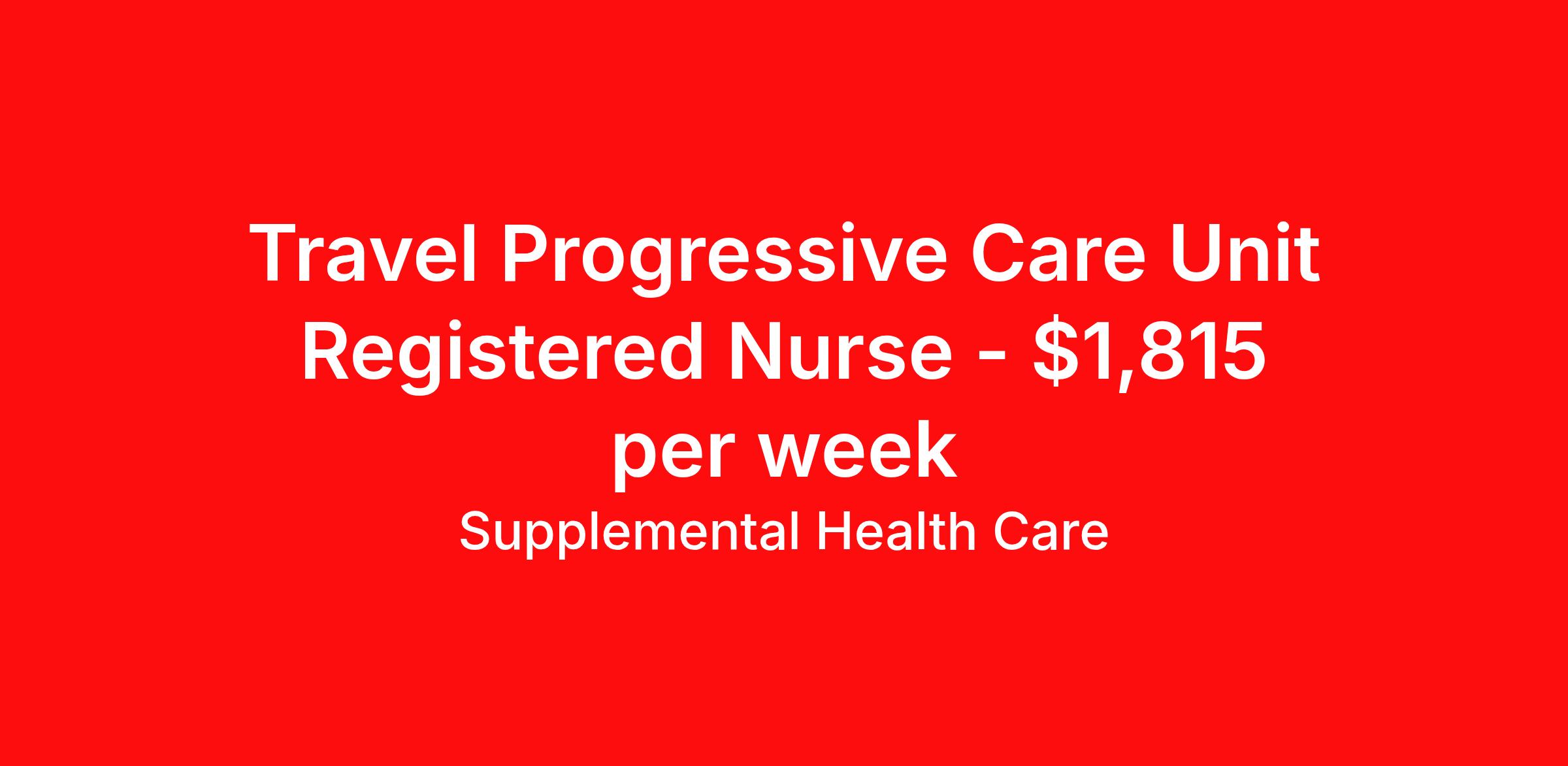 Supplemental Health Care is seeking a travel nurse RN PCU - Progressive Care Unit for a travel nursing job in Bowling Green, Kentucky. Job Description & Requirements Specialty: PCU - Progressive Care Unit Discipline: RN Start Date: ASAP Duration: 13 weeks 40 hours per week Shift: 8 hours, days, nights Employment Type: Travel Job Description: Supplemental Health Care is hiring PCU RNs for contract assignments at partnering hospitals in Bowling Green, Kentucky. Whether you’re looking to travel or stay local, we’re committed to helping Progressive Care Unit Registered Nurses find the right fit with top hospitals across the country. With more than 40 years of experience in healthcare staffing, Supplemental Health Care offers reliable support, competitive pay, and great benefits every step of the way. Qualifications: Current Kentucky Nursing License American Heart Association BLS 2 years of recent Progressive/step-down/transitional Care Unit nursing experience PCU RN Contract Details: $1,660 - $1,815 per week* AM shift available 13-week contract with possibility to extend The Progressive Care Unit Nurse will be evaluating and monitoring patients upon admittance to the PCU Responsibilities include but are not limited to: Changing dressings, Starting or changing IVs, Preparing medical equipment, and Assisting doctors with bedside procedures *Estimated weekly payment may include both taxable wages and tax-free reimbursements for meals, housing, and incidentals. Please speak with a recruiter for details. Apply today to get started with this PCU RN contract opportunity, or talk to our team about the full range of Registered Nurse opportunities available. What We Offer: Full medical, dental, vision, life, and even pet insurance! Round the clock support. No matter where you are or what time it is, Supplemental Health Care is standing by. SHC's Share the Care referral program is the most dynamic, profitable referral program in the industry. 401(k) Retirement Savings Program with a wide range of investment options. Discounted and free online access to CEU courses through Supplemental University. Supplemental Health Care is an Equal Opportunity Employer. All candidates, including veterans and those with disabilities, are encouraged to apply. SHC will consider for employment qualified applicants with criminal histories in a manner consistent with the requirements of applicable local, state, or federal law. To learn more, visit www.shccares.com/eeo Supplemental Health Care Job ID 1466317. Pay package is based on 8 hour shifts and 40 hours per week (subject to confirmation) with tax-free stipend amount to be determined. Posted job title: Registered Nurse - Progressive Care Unit About Supplemental Health Care At Supplemental Health Care, a simple belief in the power of caring guides a unique commitment to world-class service in healthcare staffing. For 40 years, we’ve supported talented professionals pursuing their life calling in hospitals, schools, home health, corrections, behavioral health, and other settings. At SHC, we inspire vital connections and enrich lives and inspire better outcomes. As recipients of the Best in Staffing Awards for both Client and Talent, Supplemental Health Care is proud to be among only 2% of staffing companies singled out for the distinction based on the real feedback of our employees and the clients we serve. SHC has also earned The Joint Commission’s Gold Seal of Approval and is named among the Largest Health Care Staffing companies in the United States by Staffing Industry Analysts. We are also thrilled to recognize our very own SLP, Dr. Kelly Byrd as the American Staffing Association 2024 National Staffing Employee of the Year and Health Care Sector All-Star. We’re honored to connect Dr. Byrd to employment, share her incredible story, and support her family literacy nonprofit. For everyone that we serve, SHC is the place where caring hearts thrive. Benefits Referral bonus Benefits start day 1 401k retirement plan Continuing Education Discount program Health savings account