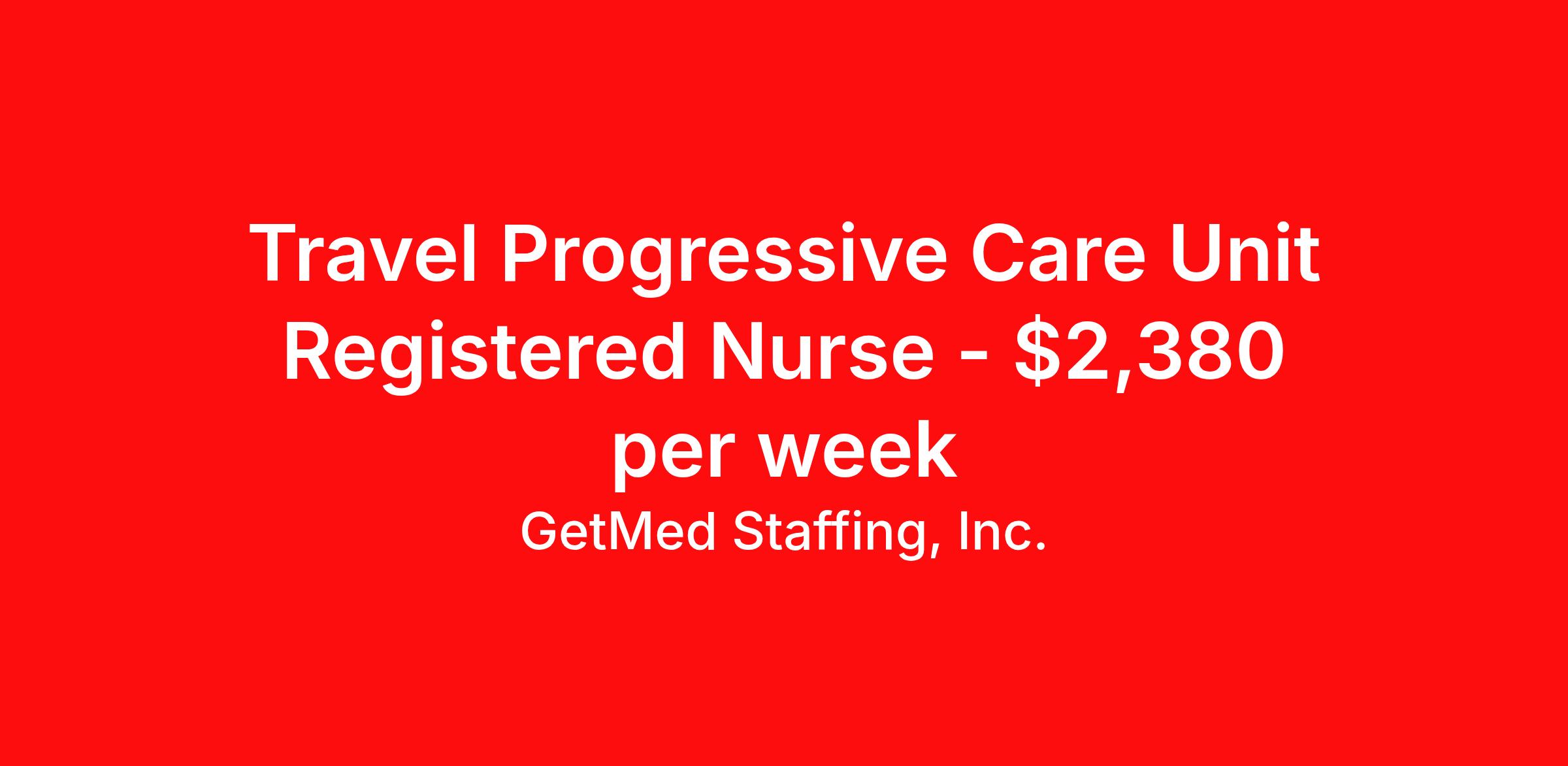 GetMed Staffing, Inc. is seeking a travel nurse RN PCU - Progressive Care Unit for a travel nursing job in Wichita, Kansas. Job Description & Requirements Specialty: PCU - Progressive Care Unit Discipline: RN Start Date: 04/12/2026 Duration: 13 weeks 48 hours per week Shift: 12 hours, nights Employment Type: Travel GetMed Staffing is searching for a strong PCU RN to assist our traveler-friendly client. A minimum of 1-2 years of experience is required. Traveling with GetMed Staffing offers the unique opportunity to gain diverse experiences, both personally and professionally. Gain experience that matters. GetMed Staffing, Inc. Job ID 36025640. Pay package is based on 12 hour shifts and 48.0 hours per week (subject to confirmation) with tax-free stipend amount to be determined. Posted job title: RN:PCU,19:00:00-07:00:00 About GetMed Staffing, Inc. We are a diversity owned company, specializing in healthcare recruiting services. We truly understand how important a healthcare travelers' relationship is with their recruiter, as well as our relationship is with our healthcare facilities. We recognize that the needs of our healthcare travelers can vary, and therefore we provide the personalized touch necessary to ensure a successful travel assignment each and every time. Our healthcare facilities and clients benefit from us putting our healthcare travelers first. GetMed Staffing is excited to be a leader within the industry by focusing on providing healthcare travelers with more choices and possibilities as they plan for their next healthcare travel assignment. Benefits Life insurance Medical benefits Dental benefits Vision benefits 401k retirement plan