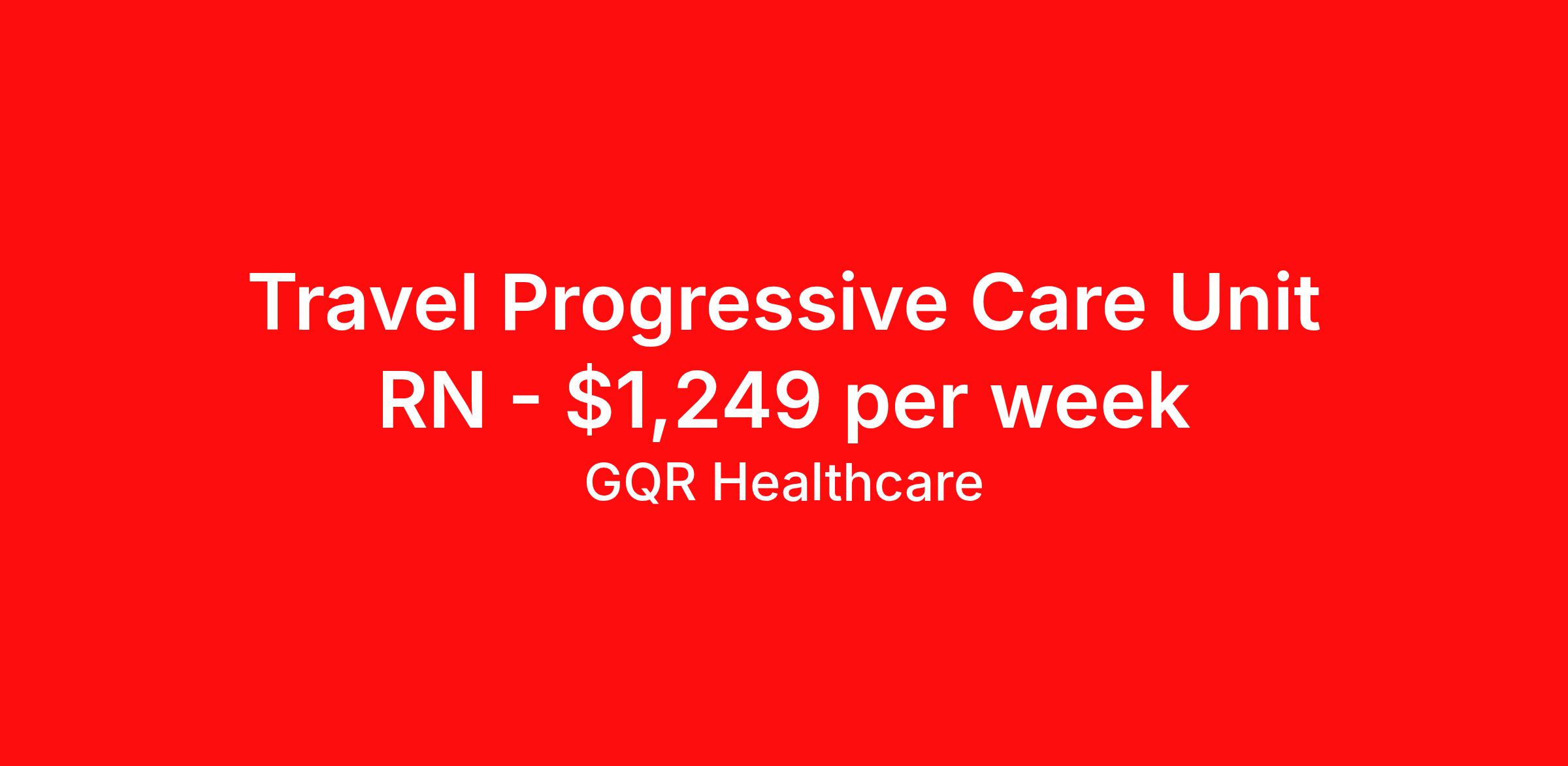 GQR Healthcare is seeking a travel nurse RN PCU - Progressive Care Unit for a travel nursing job in Jacksonville, Florida. Job Description & Requirements Specialty: PCU - Progressive Care Unit Discipline: RN Start Date: 04/12/2026 Duration: 13 weeks 36 hours per week Shift: 12 hours, days Employment Type: Travel Contract - W2 Progressive Care Unit (PCU) Registered Nurse (RN) Job Location: Jacksonville, Florida Start Date: April 12, 2026 Profession: Registered Nurse (RN) Facility: Estimated Pay: $1248.76 - $1343.76 Duration:13 weeks Specialty:Progressive Care Unit (PCU) Shift: Day Shift Details: null Day Job Type: Travel *Estimated weekly pay includes projected hourly wages and weekly meal and lodging per diems for eligible clinicians based on nationally published GSA rates. Actual weekly pay and per diems may differ from the amount shown and are subject to change during an assignment. Benefits: Day 1 Insurance Cigna medical, MetLife dental and vision insurance License reimbursement for new licenses needed for each assignment Discounts with hotels and rental cars A dedicated recruiter and support team that will help you every step of the way to sure you start on time and have an exceptional experience Referral bonus up to $700 About the Company: Finding the right role is about more than just matching skills to a job—it’s about aligning with your goals, values, and the way you want to work. As an award-winning talent partner, we support healthcare professionals through every step of that process, offering meaningful opportunities, clear guidance, and long-term partnership. From our first conversation to your first day on the job (and beyond!), we’re here to help you move forward with confidence. GQR Job ID 777306. Pay package is based on 12 hour shifts and 36 hours per week (subject to confirmation) with tax-free stipend amount to be determined. Posted job title: Registered Nurse (RN) About GQR Healthcare GQR’s Healthcare team specializes in connecting experts within the industry to highly skilled healthcare professionals across the US market. In the competitive healthcare market, we recognize that the industry’s common goals of improved quality of care and patient outcomes are wholly reliant upon the professionals directly supporting these initiatives. Leveraging our extensive candidate network, we deliver continuity of care for the communities our partners serve to ensure the patient experience is of the highest quality. Through deep market specialization and a unique approach to talent acquisition, GQR Healthcare provides an unparalleled and personalized experience across all medical specialties in nursing and within diverse healthcare platforms across the industry.