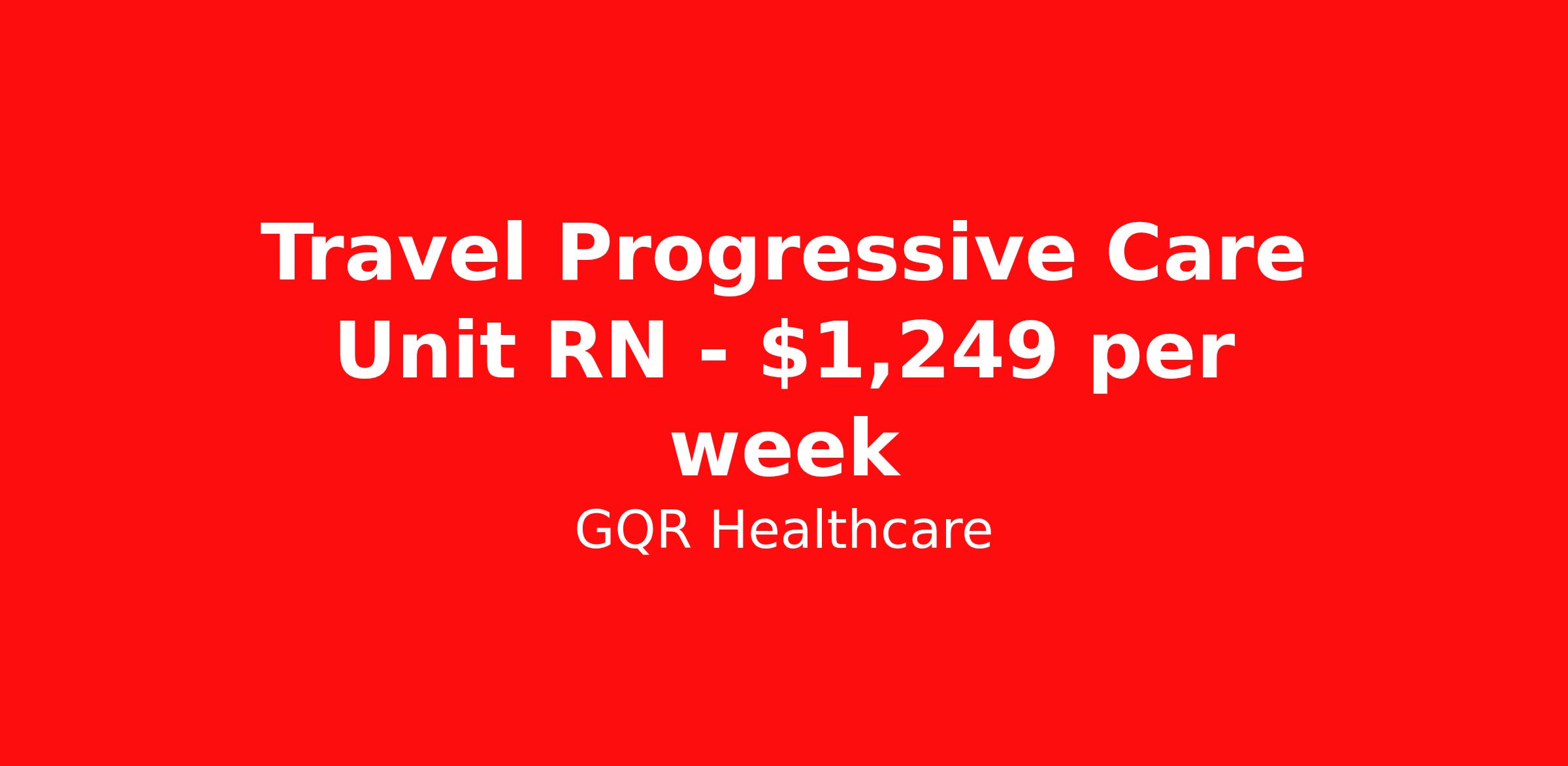 GQR Healthcare is seeking a travel nurse RN PCU - Progressive Care Unit for a travel nursing job in Jacksonville, Florida. Job Description & Requirements Specialty: PCU - Progressive Care Unit Discipline: RN Start Date: 04/12/2026 Duration: 13 weeks 36 hours per week Shift: 12 hours, days Employment Type: Travel Contract - W2 Progressive Care Unit (PCU) Registered Nurse (RN) Job Location: Jacksonville, Florida Start Date: April 12, 2026 Profession: Registered Nurse (RN) Facility: Estimated Pay: $1248.76 - $1343.76 Duration:13 weeks Specialty:Progressive Care Unit (PCU) Shift: Day Shift Details: null Day Job Type: Travel *Estimated weekly pay includes projected hourly wages and weekly meal and lodging per diems for eligible clinicians based on nationally published GSA rates. Actual weekly pay and per diems may differ from the amount shown and are subject to change during an assignment. Benefits: Day 1 Insurance Cigna medical, MetLife dental and vision insurance License reimbursement for new licenses needed for each assignment Discounts with hotels and rental cars A dedicated recruiter and support team that will help you every step of the way to sure you start on time and have an exceptional experience Referral bonus up to $700 About the Company: Finding the right role is about more than just matching skills to a job—it’s about aligning with your goals, values, and the way you want to work. As an award-winning talent partner, we support healthcare professionals through every step of that process, offering meaningful opportunities, clear guidance, and long-term partnership. From our first conversation to your first day on the job (and beyond!), we’re here to help you move forward with confidence. GQR Job ID 777306. Pay package is based on 12 hour shifts and 36 hours per week (subject to confirmation) with tax-free stipend amount to be determined. Posted job title: Registered Nurse (RN) About GQR Healthcare GQR’s Healthcare team specializes in connecting experts within the industry to highly skilled healthcare professionals across the US market. In the competitive healthcare market, we recognize that the industry’s common goals of improved quality of care and patient outcomes are wholly reliant upon the professionals directly supporting these initiatives. Leveraging our extensive candidate network, we deliver continuity of care for the communities our partners serve to ensure the patient experience is of the highest quality. Through deep market specialization and a unique approach to talent acquisition, GQR Healthcare provides an unparalleled and personalized experience across all medical specialties in nursing and within diverse healthcare platforms across the industry.