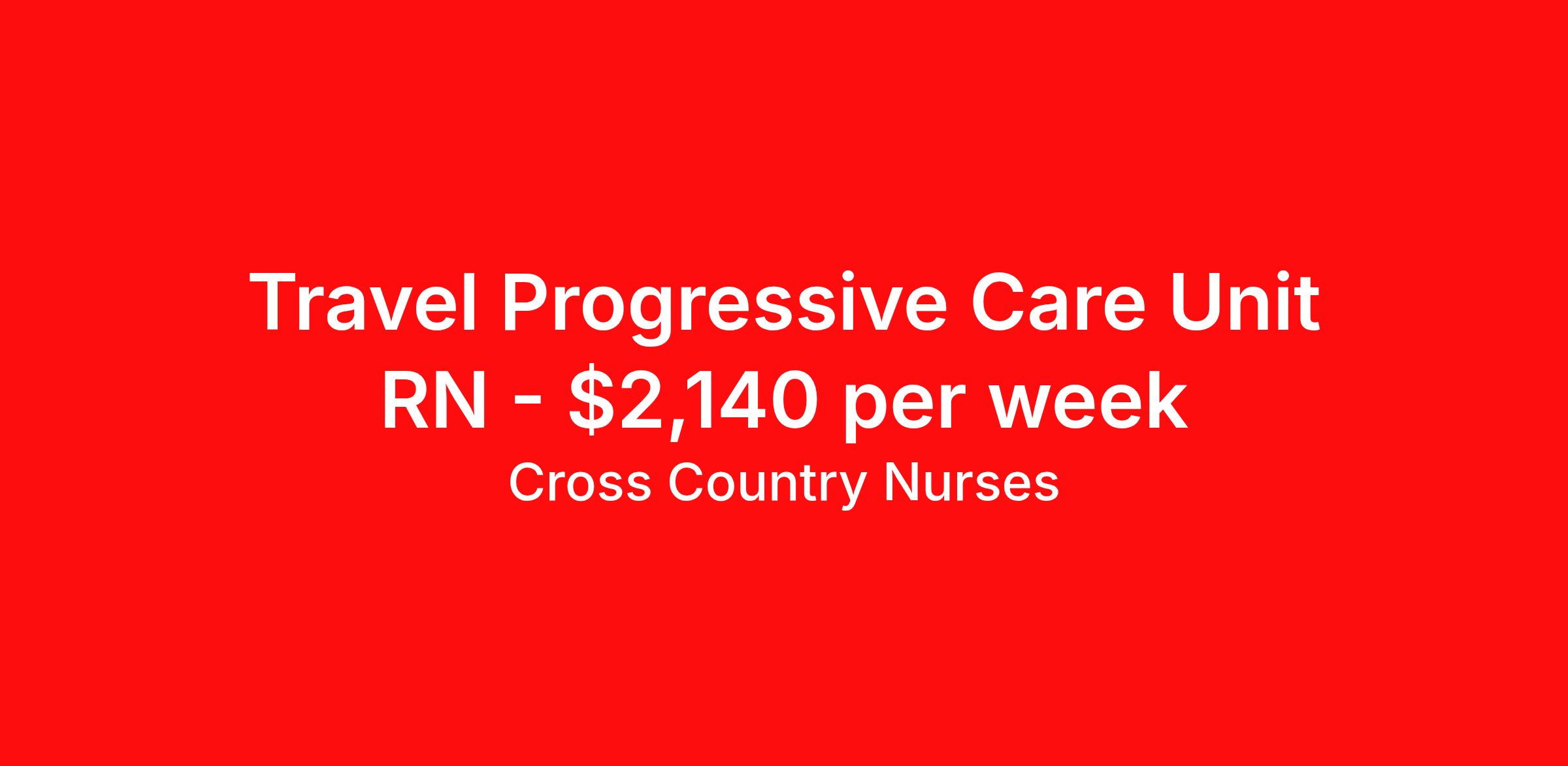 Cross Country Nurses is seeking a travel nurse RN PCU - Progressive Care Unit for a travel nursing job in Wichita, Kansas. Job Description & Requirements Specialty: PCU - Progressive Care Unit Discipline: RN Start Date: 04/06/2026 Duration: 13 weeks 36 hours per week Shift: 12 hours, days Employment Type: Travel Job Description As a registered nurse - progressive care unit (RN PCU), you will help care for patients who need a moderate level of monitoring and assessment but whose conditions do not require the resources of the intensive care unit. In other words, it is an intermediary level of hospital care. Telemetry units, intermediate care units, direct observation units, step-down units, or transitional care units are sometimes called progressive care units. Minimum Requirements At least 1 year of recent acute care experience in specialty Active RN license Benefits The benefits of taking a travel nursing job with Cross Country include: Private housing or generous housing allowance Comprehensive health insurance with prescription coverage Dependent health insurance with prescription coverage Competitive salaries Referral bonuses Travel reimbursement 401(k) retirement plan Direct deposit/free checking Unlimited free CE credits Cross Country Job ID 1237193. Pay package is based on 12 hour shifts and 36 hours per week (subject to confirmation) with tax-free stipend amount to be determined. Posted job title: Registered Nurse / Progressive Care Unit About Cross Country Nurses You care for others — we’re here to care for you. At Cross Country, we know travel nursing is about more than just the job. It’s about building a career that supports your lifestyle, your values, and your impact. We offer competitive pay, full benefits, and 24/7 support from a team that truly understands what it means to be on the front lines. Wherever your journey takes you, we’re with you every step of the way. Let’s build your best life — one assignment at a time. Benefits 401k retirement plan Referral bonus
