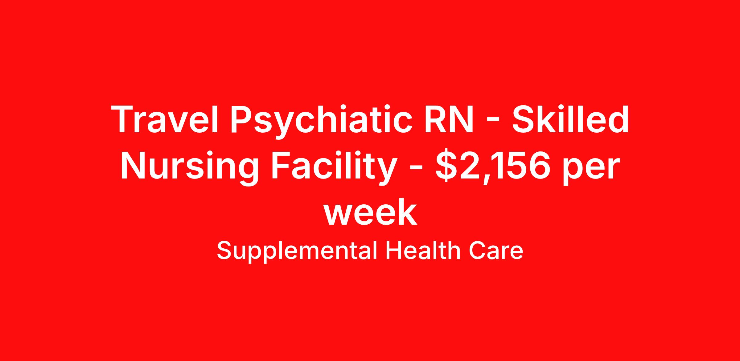 Supplemental Health Care is seeking a travel nurse RN Skilled Nursing Facility (SNF) Psychiatric for a travel nursing job in Reseda, California. Job Description & Requirements Specialty: Psychiatric Discipline: RN Start Date: ASAP Duration: 13 weeks 36 hours per week Shift: 12 hours, nights Employment Type: Travel Job Description: Supplemental Health Care is hiring Psychiatry Adult RNs for contract assignments at a partnering skilled nursing facility in Reseda, California. Whether you’re looking to travel or stay local, we’re committed to helping Psychiatry Adult Registered Nurses find the right fit with top healthcare facilities across the country. With more than 40 years of experience in healthcare staffing, Supplemental Health Care offers reliable support, competitive pay, and great benefits every step of the way. Qualifications: California RN License AHA BLS 1 year of experience as an RN Skilled Nursing Facility experience preferred Psychiatry Adult RN Contract Details $1,932 - $2,156 per week* Skilled Nursing Facility NOC shift available 14-week contracts with the opportunity to extend RN will provide nursing care within their scope of practice and in accordance with the standards of the facility What We Offer: Full medical, dental, vision, life, and even pet insurance! Round the clock support. No matter where you are or what time it is, Supplemental Health Care is standing by. SHC's Share the Care referral program is the most dynamic, profitable referral program in the industry. 401(k) Retirement Savings Program with a wide range of investment options. Discounted and free online access to CEU courses through Supplemental University. Apply today to get started with this Registered Nurse contract opportunity, or talk to our team about the full range of RN opportunities available. *Estimated weekly payment may include both taxable wages and tax-free reimbursements for meals, housing, and incidentals. Please speak with a recruiter for details. Supplemental Health Care is an Equal Opportunity Employer. All candidates, including veterans and those with disabilities, are encouraged to apply. SHC will consider for employment qualified applicants with criminal histories in a manner consistent with the requirements of applicable local, state, or federal law. To learn more, visit www.shccares.com/eeo Supplemental Health Care Job ID 1471111. Pay package is based on 12 hour shifts and 36 hours per week (subject to confirmation) with tax-free stipend amount to be determined. Posted job title: Psychiatry Adult RN - Skilled Nursing Facility About Supplemental Health Care At Supplemental Health Care, a simple belief in the power of caring guides a unique commitment to world-class service in healthcare staffing. For 40 years, we’ve supported talented professionals pursuing their life calling in hospitals, schools, home health, corrections, behavioral health, and other settings. At SHC, we inspire vital connections and enrich lives and inspire better outcomes. As recipients of the Best in Staffing Awards for both Client and Talent, Supplemental Health Care is proud to be among only 2% of staffing companies singled out for the distinction based on the real feedback of our employees and the clients we serve. SHC has also earned The Joint Commission’s Gold Seal of Approval and is named among the Largest Health Care Staffing companies in the United States by Staffing Industry Analysts. We are also thrilled to recognize our very own SLP, Dr. Kelly Byrd as the American Staffing Association 2024 National Staffing Employee of the Year and Health Care Sector All-Star. We’re honored to connect Dr. Byrd to employment, share her incredible story, and support her family literacy nonprofit. For everyone that we serve, SHC is the place where caring hearts thrive. Benefits Referral bonus Benefits start day 1 401k retirement plan Continuing Education Discount program Health savings account