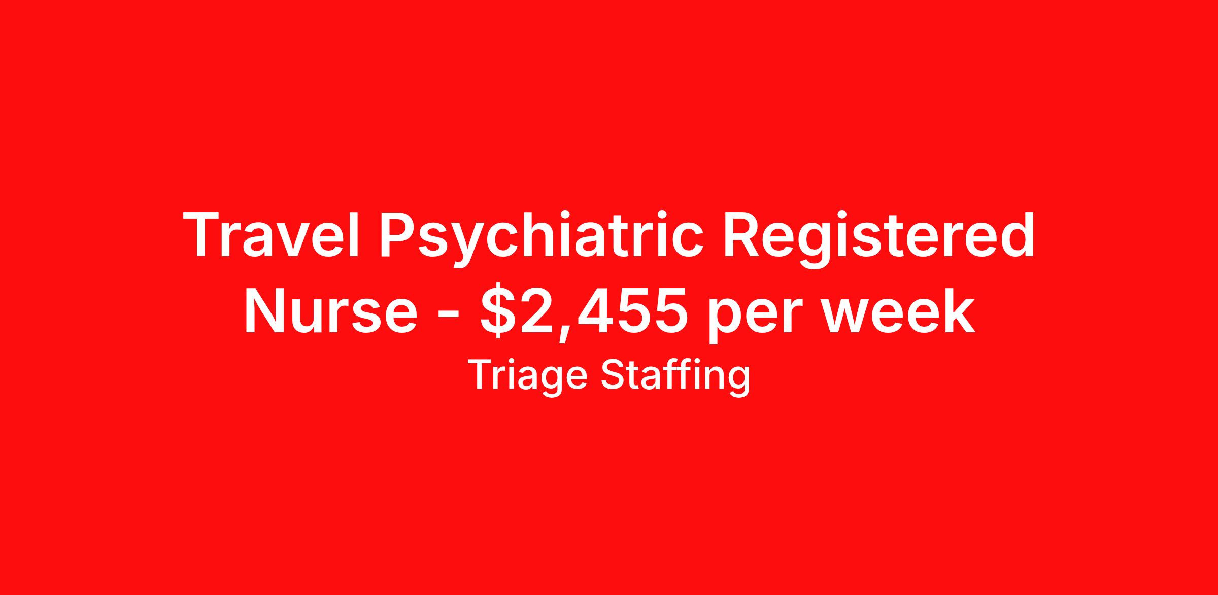 Triage Staffing is seeking a travel nurse RN Psychiatric for a travel nursing job in Bethel, Alaska. Job Description & Requirements Specialty: Psychiatric Discipline: RN Start Date: 04/21/2026 Duration: 13 weeks 36 hours per week Shift: 12 hours, flexible Employment Type: Travel Travel Nursing: Postpartum/Mother Baby Bethel, AK Location: Bethel, AK Start Date: 4/21/2026 Shift Details: 12H Variable 36 hours per week Length: 13 WEEKS Apply for specific facility details.Mother Baby RN Triage Staffing Job ID YRV3NUDT. Posted job title: Nursing: Postpartum/Mother Baby About Triage Staffing At Triage, we prefer to be real . Real about expectations—both ours and yours. Real about how a decision you make today could affect your tomorrows. Real about how compensation actually works. Real about how great—or grating—your next supervisor may be. Being real allows everyone at Triage to be ready . Ready to serve you with real honesty. So if that gig near the ocean is really no day at the beach, or that third shift comes with a second-class rate, we tell you. So you can be ready, too. We staff all five major divisions of acute care—nursing, lab, radiology, cardiopulmonary and rehab therapy, offering: - Competitive, custom pay packages - One point of contact for both travelers and facilities (per division) - A reliable recruiter who's got your back throughout your entire assignment - In-house compliance and accounting specialists - A clinical liaison team available 24/7 to offer medical and professional support and career development - A mentoring program that is run and managed by actual clinicians—yeah, you read that right - And more (because of course there’s more) Are we the biggest? No. Are we the best? That’s rather subjective, but we’re trying to be. Will we work like hell to get you as close to your idea of heaven as possible? Yes. Yes, we will. Benefits: Day One comprehensive, nationwide insurance plans for health, vision and dental and life—including a HSA option Day One 401(k) program with employer-matching contributions once eligible Facility cancelling protection—your time is money on and off-the-clock Guaranteed hours Weekly paychecks via direct deposit Earned vacation bonuses for time worked Paid holidays Employee assistance program (EAP)—your mental health is important, too Continuing education, certification and licensing reimbursement Workers comp—because accidents happen Top-rated professional liability insurance Company provided housing options Referral bonus—$750 in your pocket after they’ve completed a 13-week assignment